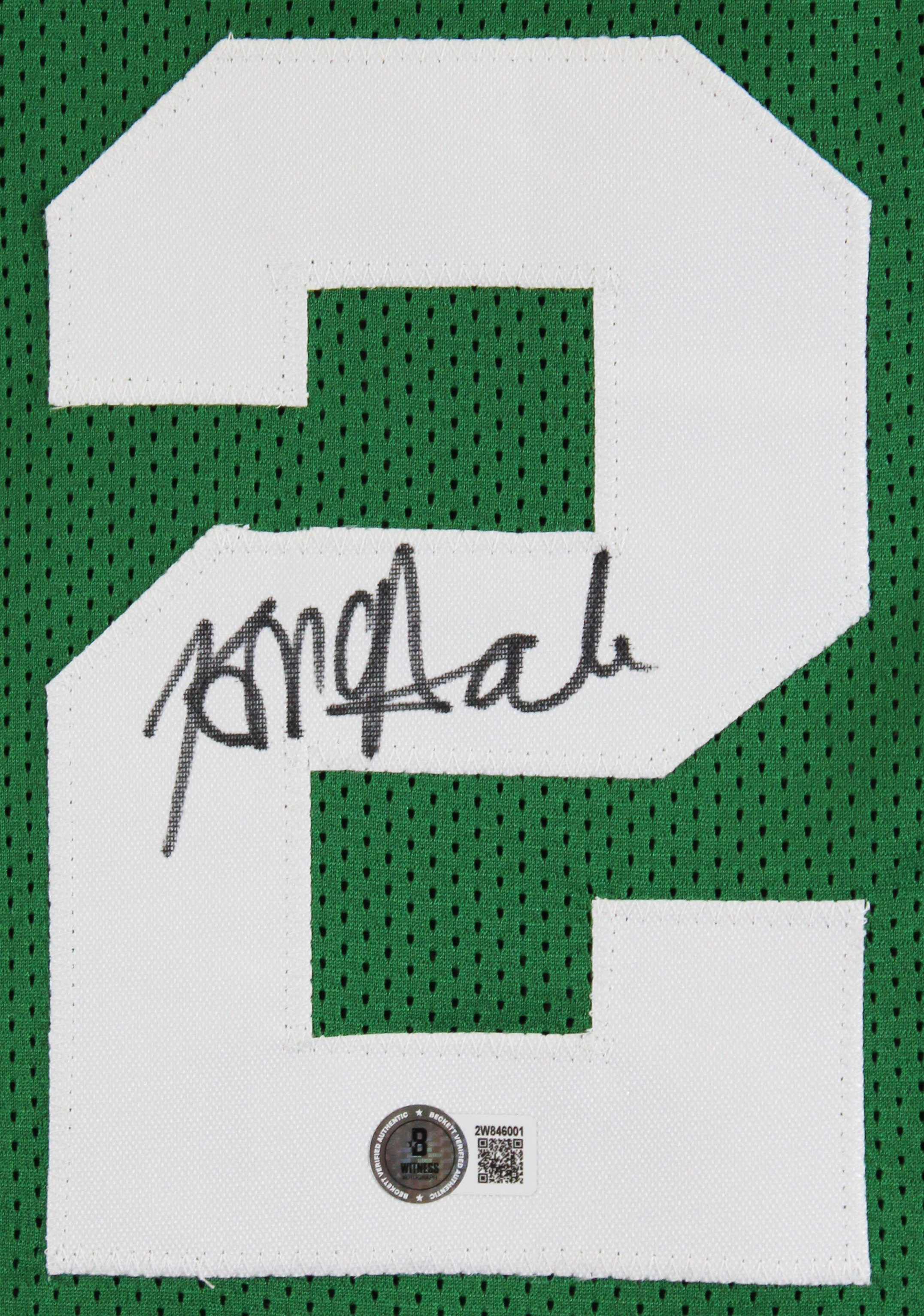 This Autographed Green Pro Style Jersey has been Personally Signed by Kevin McHale of the Boston Celtics. This item is 100% Authentic to include a hologram by Beckett Authentication Services. This item will come with an affixed Beckett Authentication Services (BAS) authentication sticker, which includes a scannable QR code to verify authenticity. Please note that Beckett no longer provides serial-numbered COA cards, and the attached BAS sticker will serve as the complete authentication for this item. This is a BAS Witnessed Protection Program item which means a Beckett Authentication Service representative was present when this item was being signed. We conducted an autograph signing with Kevin McHale where multiples of the same item were signed. While the photographs are representative of this item, the size, placement and strength of the signature may vary. Each item is hand signed, therefore, each autograph is unique. This item can be verified through BAS Witnessed. This is a X-Large sized, non-branded, custom-stitched Jersey.
