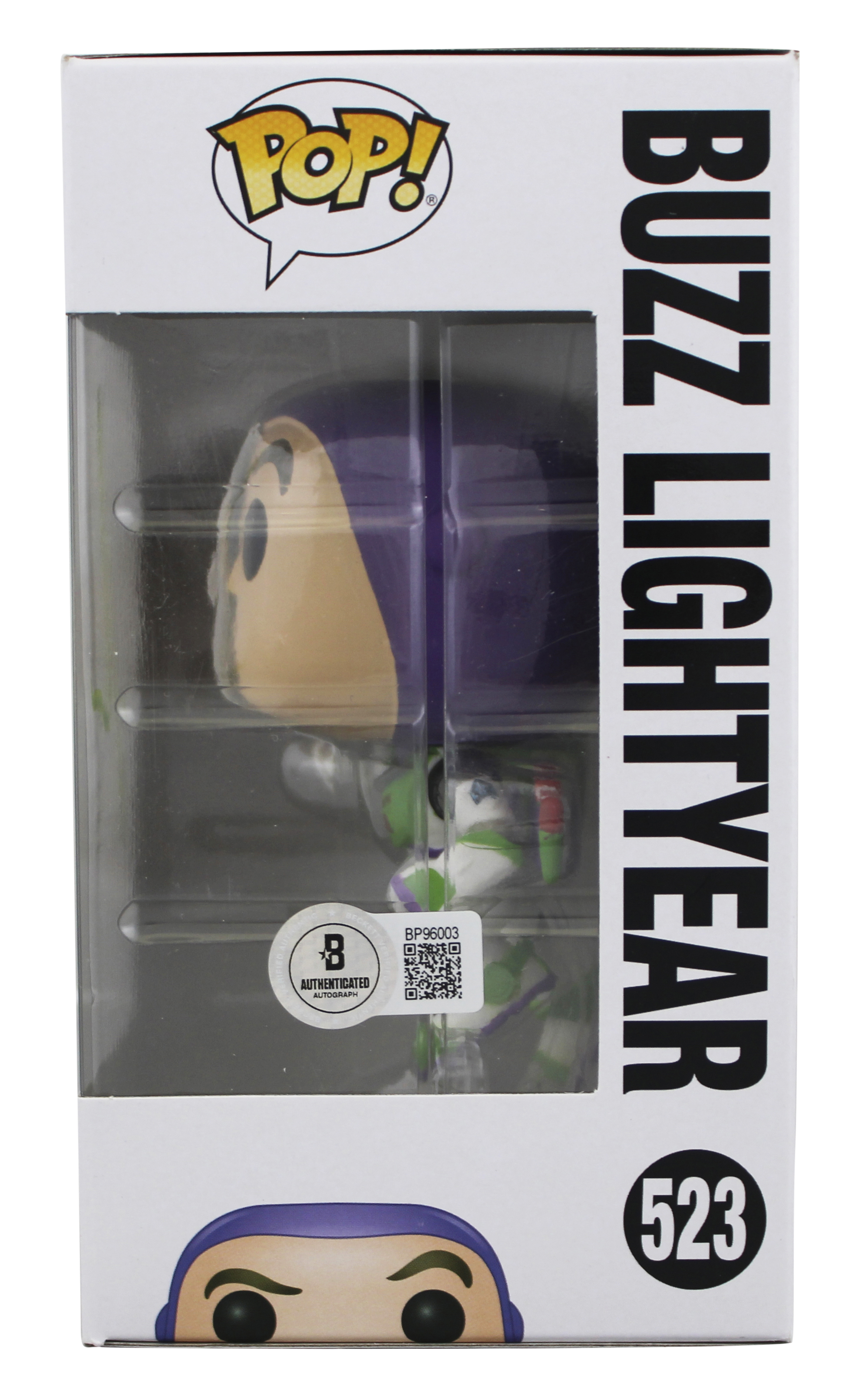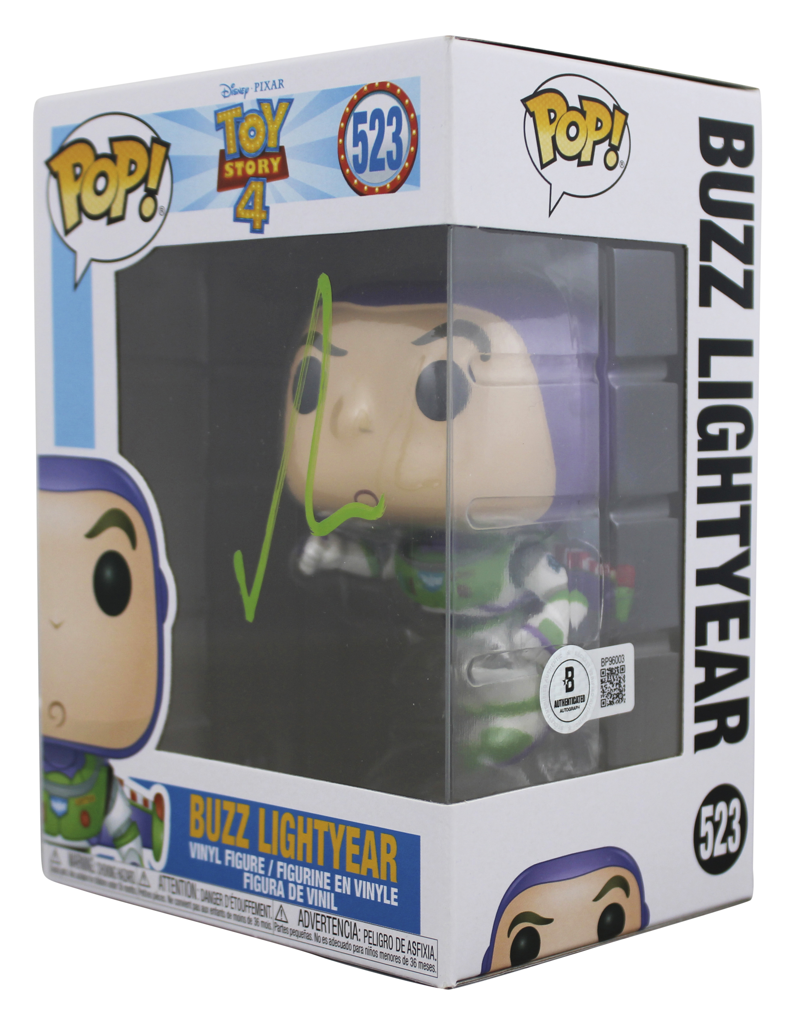 This Autographed w/ Green Signature Buzz Lightyear #523 Funko Pop Vinyl Figure has been Personally Signed by Tim Allen of Toy Story 4. This item is 100% Authentic to include a hologram by Beckett Authentication Services. This item will come with an affixed Beckett Authentication Services (BAS) authentication sticker, which includes a scannable QR code to verify authenticity. Please note that Beckett no longer provides serial-numbered COA cards, and the attached BAS sticker will serve as the complete authentication for this item. We have multiples of this same item. While the photographs are representative of this item, the size, placement and strength of the signature may vary. Each item is hand signed, therefore, each autograph is unique. This item will ship in a Pop! Protector, please refer to the photos for condition of the item prior to purchase, these are in good condition but would not be considered mint.