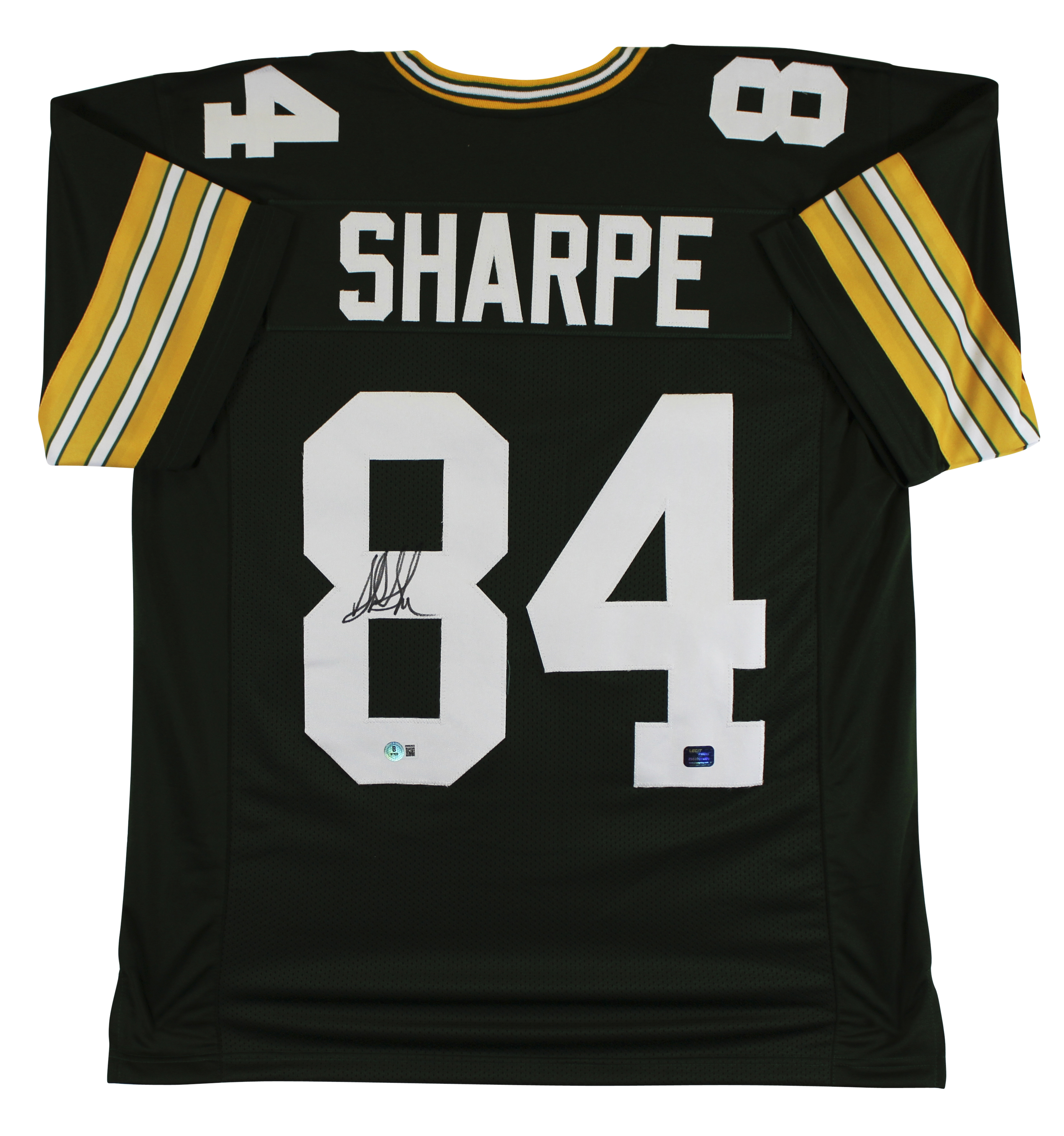 This Autographed Green Pro Style Jersey has been Personally Signed by Sterling Sharpe of the Green Bay Packers. This item is 100% Authentic to include a hologram by Beckett Authentication Services. This item will come with the new Beckett Authentication hologram that has a scannable QR code rather than the traditional COA. If you would like to have a COA, you are welcome to reach out to Beckett for a printed certification once you receive your item. This is a BAS Witnessed Protection Program item which means a Beckett Authentication Service representative was present when this item was being signed. We conducted an autograph signing with Sterling Sharpe where multiples of the same item were signed. While the photographs are representative of this item, the size, placement and strength of the signature may vary. Each item is hand signed, therefore, each autograph is unique. This item can be verified through BAS Witnessed. This is a X-Large sized, non-branded, custom-stitched Jersey.
