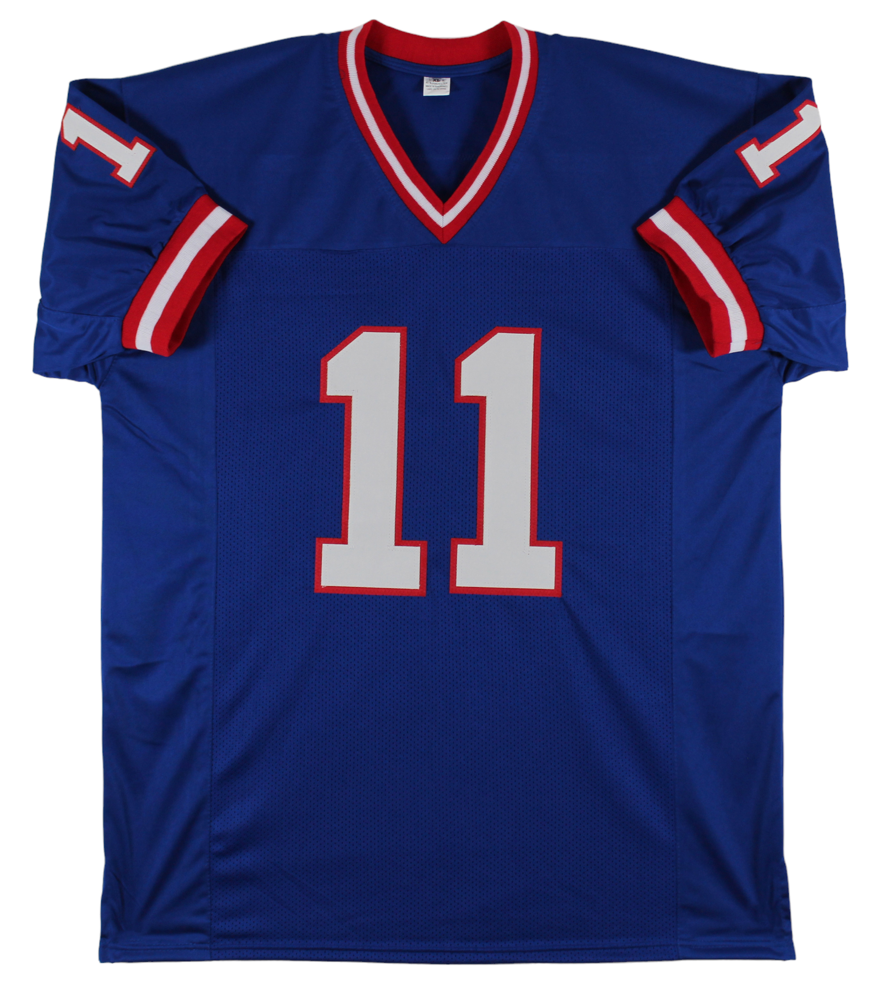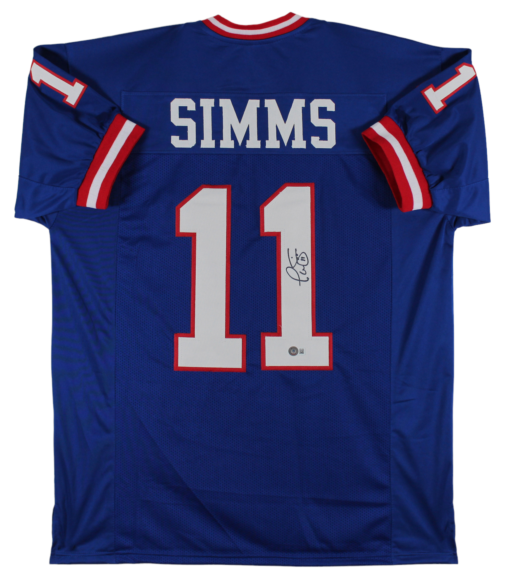 This Autographed Blue Pro Style Jersey has been Personally Signed by Phil Simms of the New York Giants. This item is 100% Authentic to include a hologram by Beckett Authentication Services. This item may come with the new Beckett Authentication hologram that has a scannable QR code rather than the traditional COA. If you would like to have a COA, you are welcome to reach out to Beckett for a printed certification once you receive your item. This is a BAS Witnessed Protection Program item which means a Beckett Authentication Service representative was present when this item was being signed. We conducted an autograph signing with Phil Simms where multiples of the same item were signed. While the photographs are representative of this item, the size, placement and strength of the signature may vary. Each item is hand signed, therefore, each autograph is unique. This item can be verified through BAS Witnessed. This is a X-Large sized, non-branded, custom-stitched Jersey.