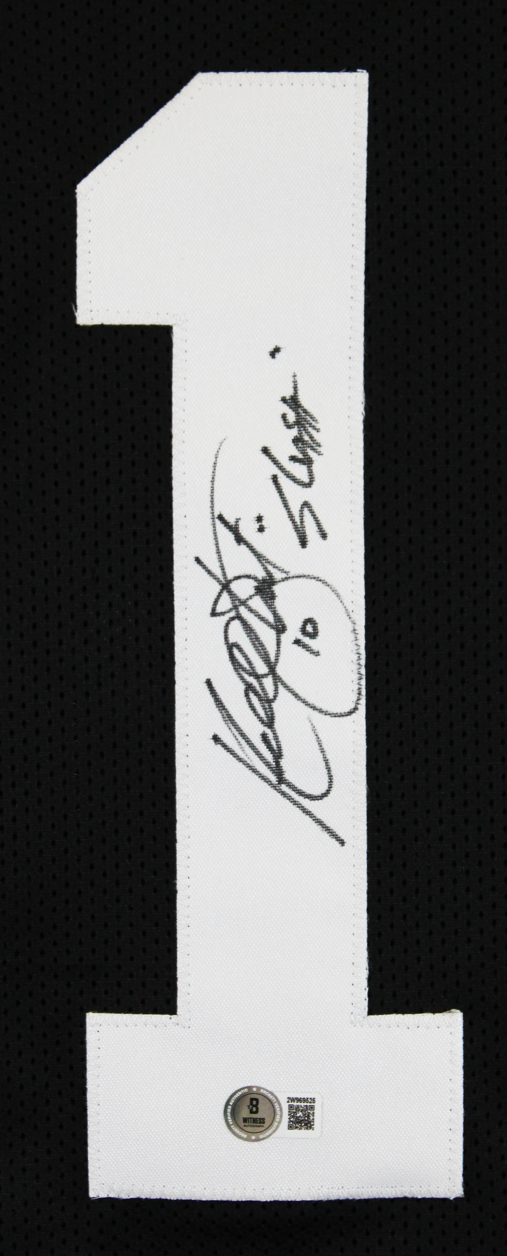 This Autographed Black Pro Style Jersey with the inscription of "Slash" has been Personally Signed by Kordell Stewart of the Pittsburgh Steelers. This item is 100% Authentic to include a hologram by Beckett Authentication Services. This item will come with an affixed Beckett Authentication Services (BAS) authentication sticker, which includes a scannable QR code to verify authenticity. Please note that Beckett no longer provides serial-numbered COA cards, and the attached BAS sticker will serve as the complete authentication for this item. This is a BAS Witnessed Protection Program item which means a Beckett Authentication Service representative was present when this item was being signed. We conducted an autograph signing with Kordell Stewart where multiples of the same item were signed. While the photographs are representative of this item, the size, placement and strength of the signature may vary. Each item is hand signed, therefore, each autograph is unique. This item can be verified through BAS Witnessed. This is a X-Large sized, non-branded, custom-stitched Jersey.