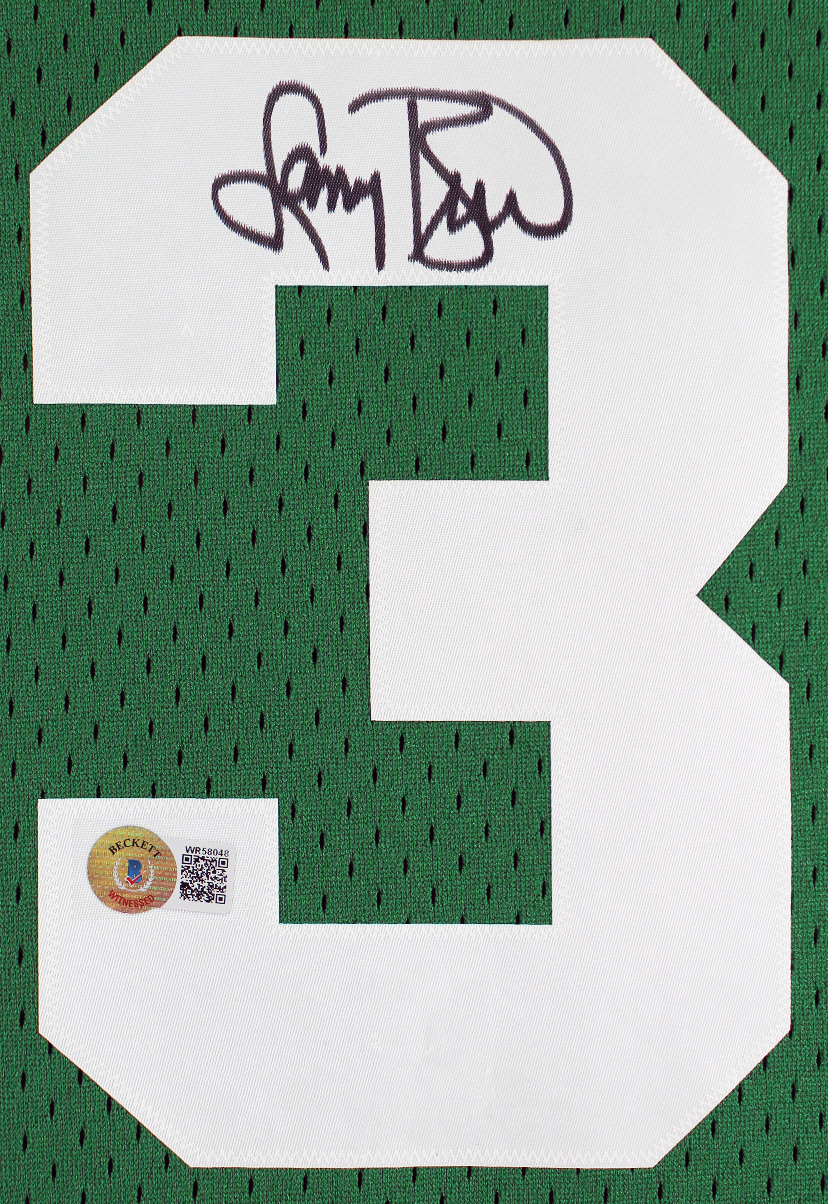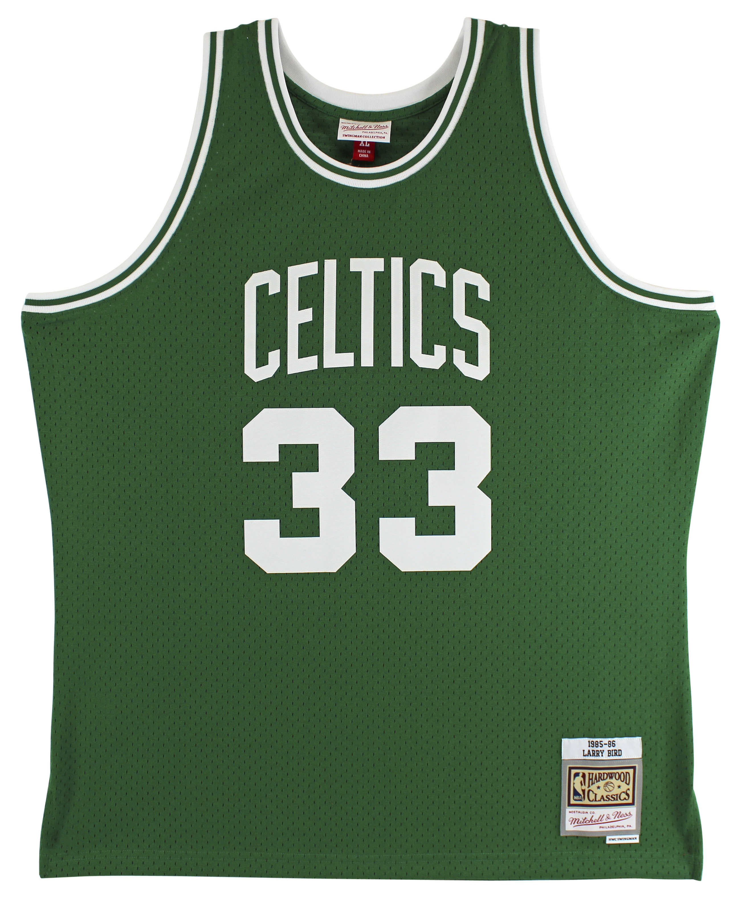 This Autographed 1985 Green Mitchell & Ness Hardwood Classics Swingman Jersey has been Personally Signed by Larry Bird. This item is 100% Authentic to include a hologram by Beckett Authentication Services. This item will come with an affixed Beckett Authentication Services (BAS) authentication sticker, which includes a scannable QR code to verify authenticity. Please note that Beckett no longer provides serial-numbered COA cards, and the attached BAS sticker will serve as the complete authentication for this item. This is a BAS Witnessed Protection Program item which means a Beckett Authentication Service representative was present when this item was being signed. We conducted an autograph signing with Larry Bird where multiples of the same item were signed. While the photographs are representative of this item, the size, placement and strength of the signature may vary. Each item is hand signed, therefore, each autograph is unique. This item can be verified through BAS Witnessed. This is a X-Large sized Jersey.