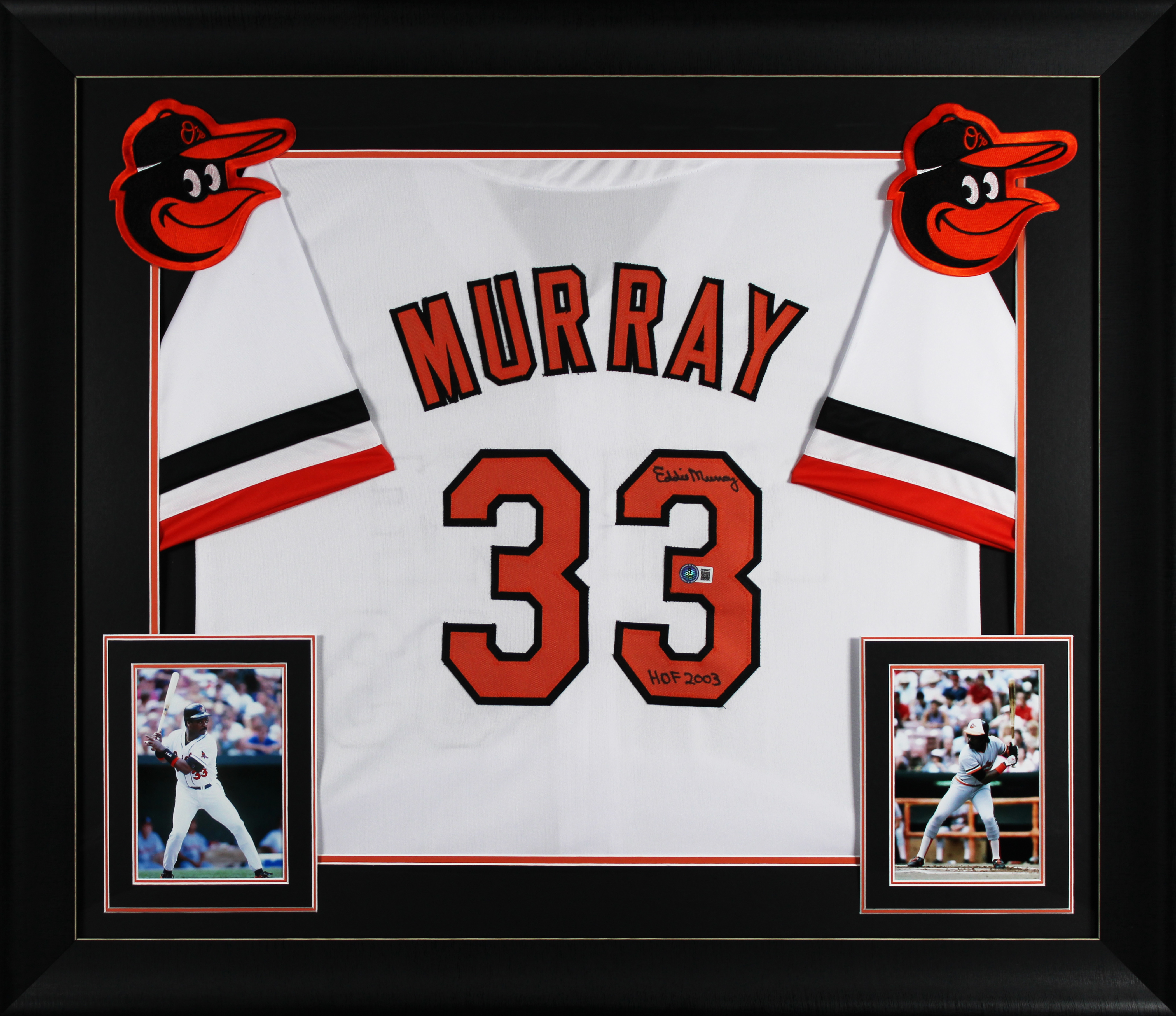 This Autographed White Pro Style Framed Jersey with the inscription of "HOF 03" has been Personally Signed by Eddie Murray of the Baltimore Orioles. This item is 100% Authentic to include a hologram by Beckett Authentication Services. This item will come with an affixed Beckett Authentication Services (BAS) authentication sticker, which includes a scannable QR code to verify authenticity. Please note that Beckett no longer provides serial-numbered COA cards, and the attached BAS sticker will serve as the complete authentication for this item. This is a BAS Witnessed Protection Program item which means a Beckett Authentication Service representative was present when this item was being signed. We conducted an autograph signing with Eddie Murray where multiples of the same item were signed. While the photographs are representative of this item, the size, placement and strength of the signature may vary. Each item is hand signed, therefore, each autograph is unique. This item can be verified through BAS Witnessed. This item has been professionally framed to overall dimensions of approximately 32 x 37 inches. This jersey will be framed to order, it will take approximately 3-4 business days from purchase date for it to ship.