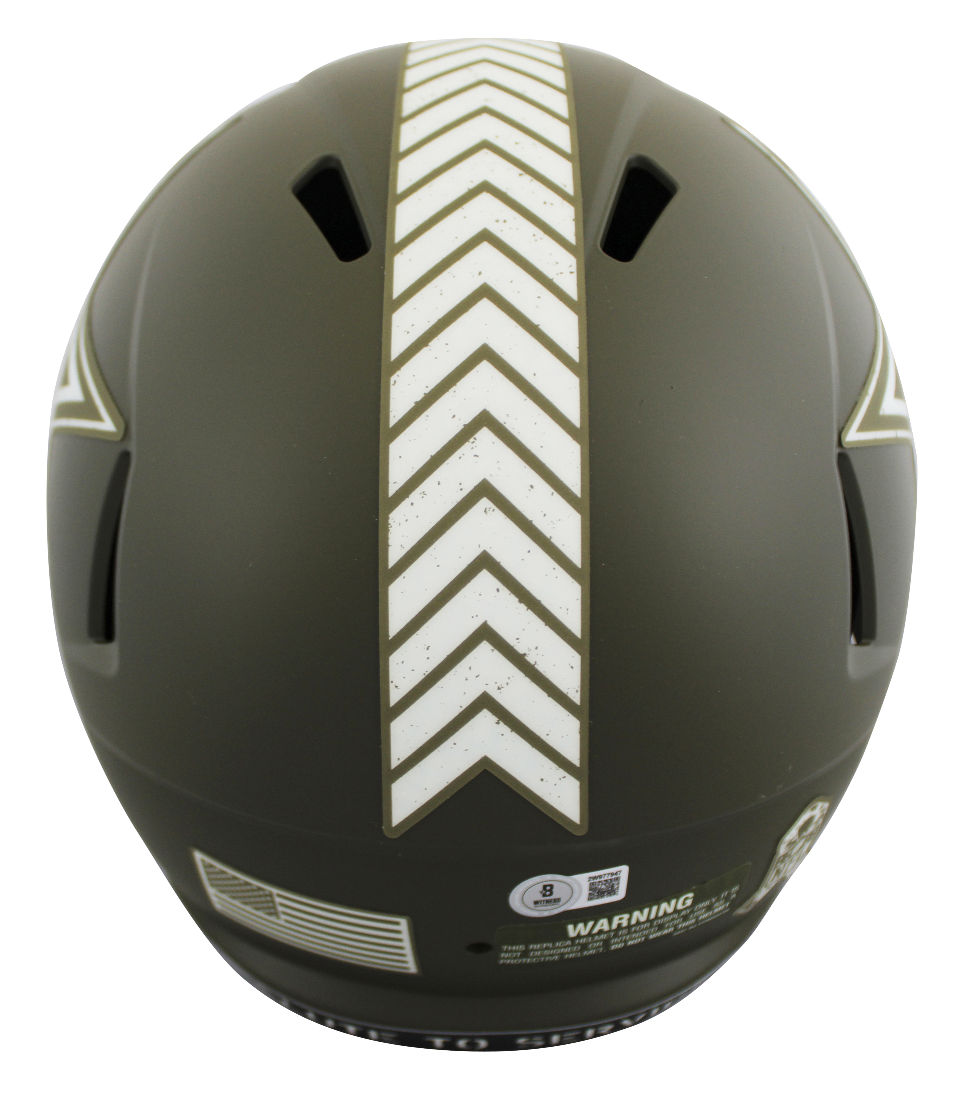This Autographed w/ White Signature Alternate Salute To Service Riddell Full Size Speed Rep Helmet W/ Uv Mirrored Back Acrylic Display Case has been Personally Signed by Dak Prescott of the Dallas Cowboys. This item is 100% Authentic to include a hologram by Beckett Authentication Services. This item will come with an affixed Beckett Authentication Services (BAS) authentication sticker, which includes a scannable QR code to verify authenticity. Please note that Beckett no longer provides serial-numbered COA cards, and the attached BAS sticker will serve as the complete authentication for this item. This is a BAS Witnessed Protection Program item which means a Beckett Authentication Service representative was present when this item was being signed. We conducted an autograph signing with Dak Prescott where multiples of the same item were signed. While the photographs are representative of this item, the size, placement and strength of the signature may vary. Each item is hand signed, therefore, each autograph is unique. This item can be verified through BAS Witnessed.