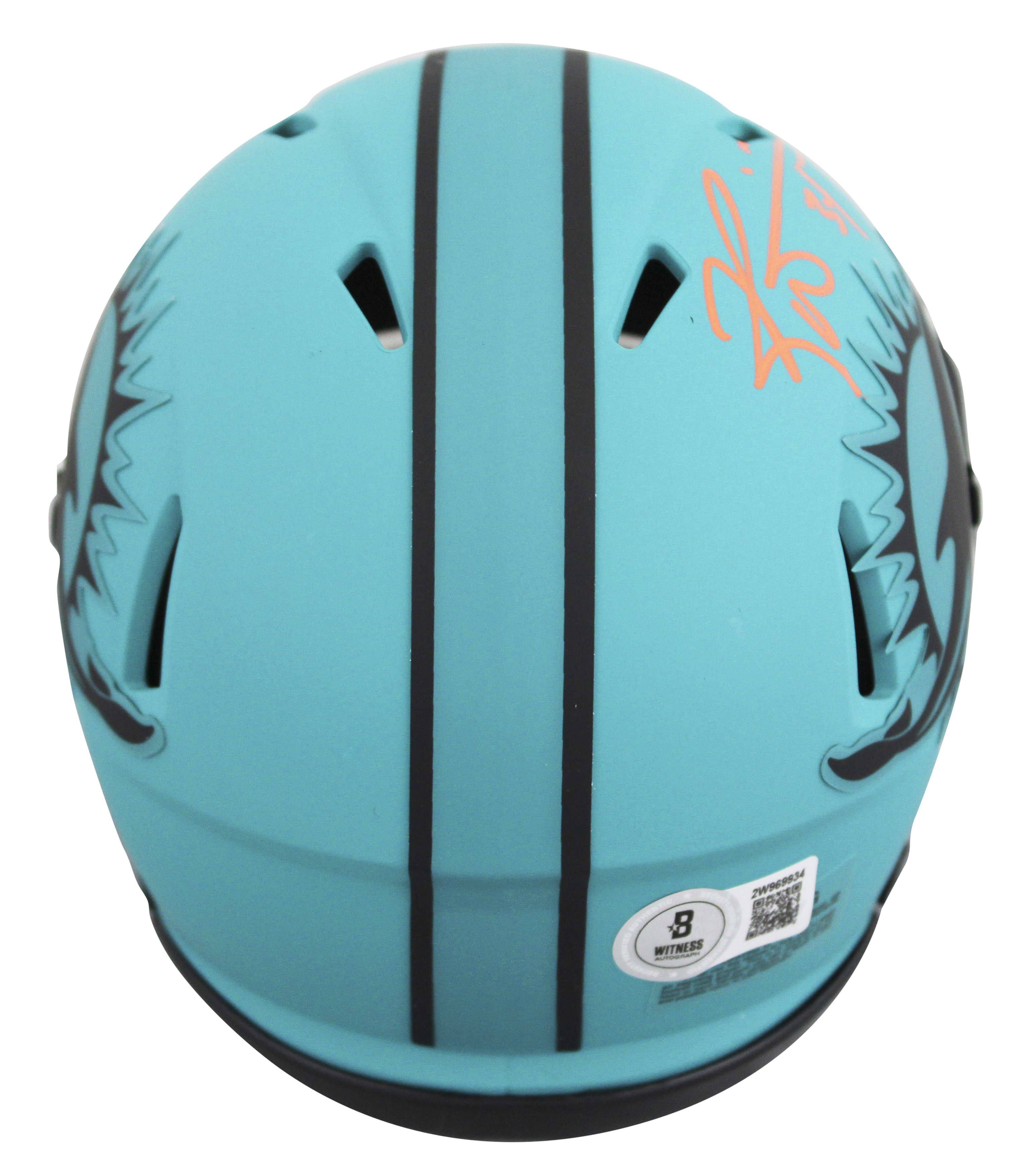 This Autographed Alternate Rave Speed Mini Helmet has been Personally Signed by Ricky Williams of the Miami Dolphins. This item is 100% Authentic to include a hologram by Beckett Authentication Services. This item will come with an affixed Beckett Authentication Services (BAS) authentication sticker, which includes a scannable QR code to verify authenticity. Please note that Beckett no longer provides serial-numbered COA cards, and the attached BAS sticker will serve as the complete authentication for this item. This is a BAS Witnessed Protection Program item which means a Beckett Authentication Service representative was present when this item was being signed. We conducted an autograph signing with Ricky Williams where multiples of the same item were signed. While the photographs are representative of this item, the size, placement and strength of the signature may vary. Each item is hand signed, therefore, each autograph is unique. This item can be verified through BAS Witnessed.