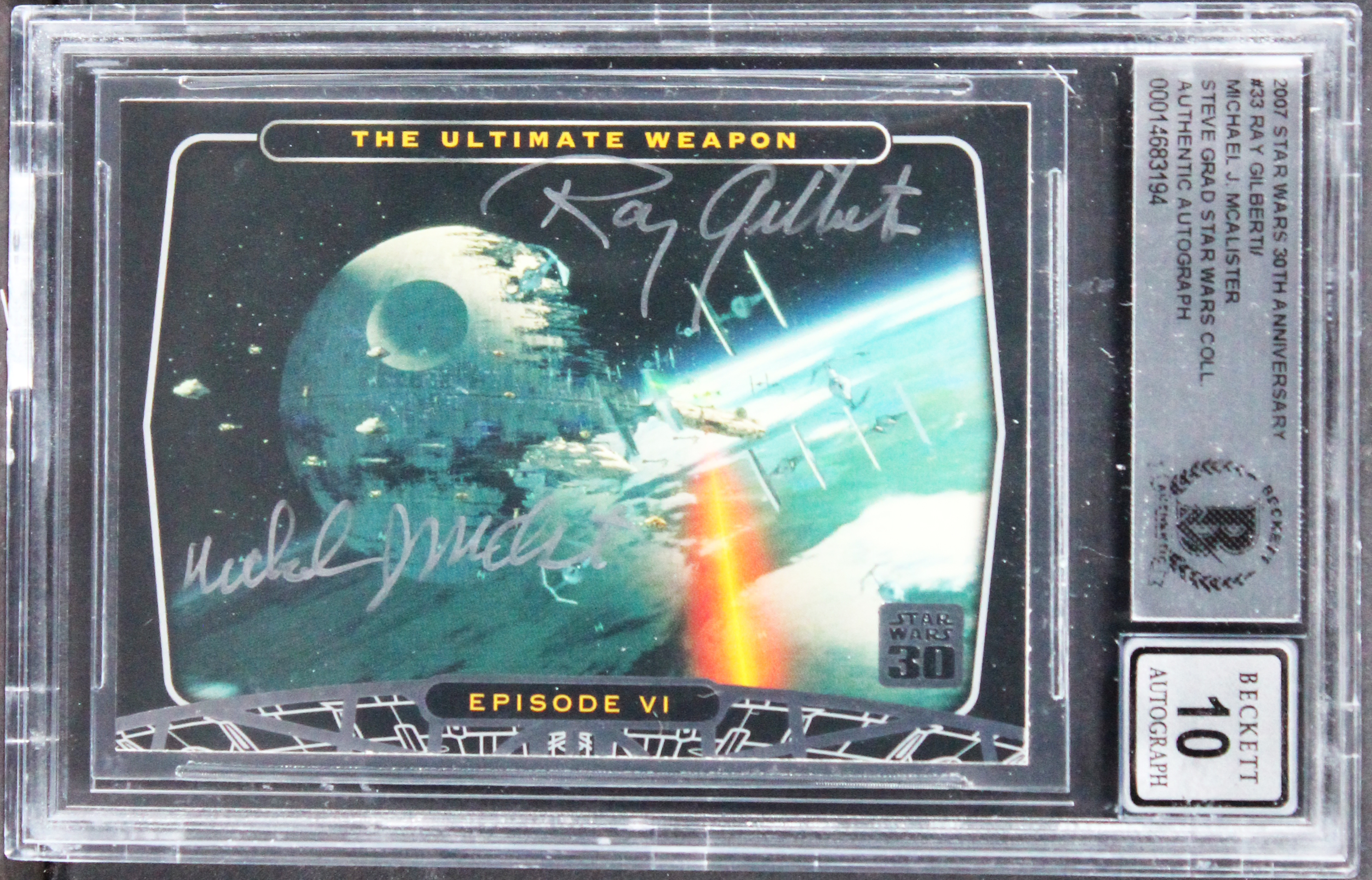 This Autographed 2007 Star Wars 30th Anniversary #33 Auto Graded Gem Mint 10! Card has been Personally Signed by Ray Gilberti & Michael J. McAlister of Star Wars. This item is 100% Authentic, it comes slabbed and authenticated by Beckett Authentication Services. The authenticity can be verified on Beckett Authentication Services website.