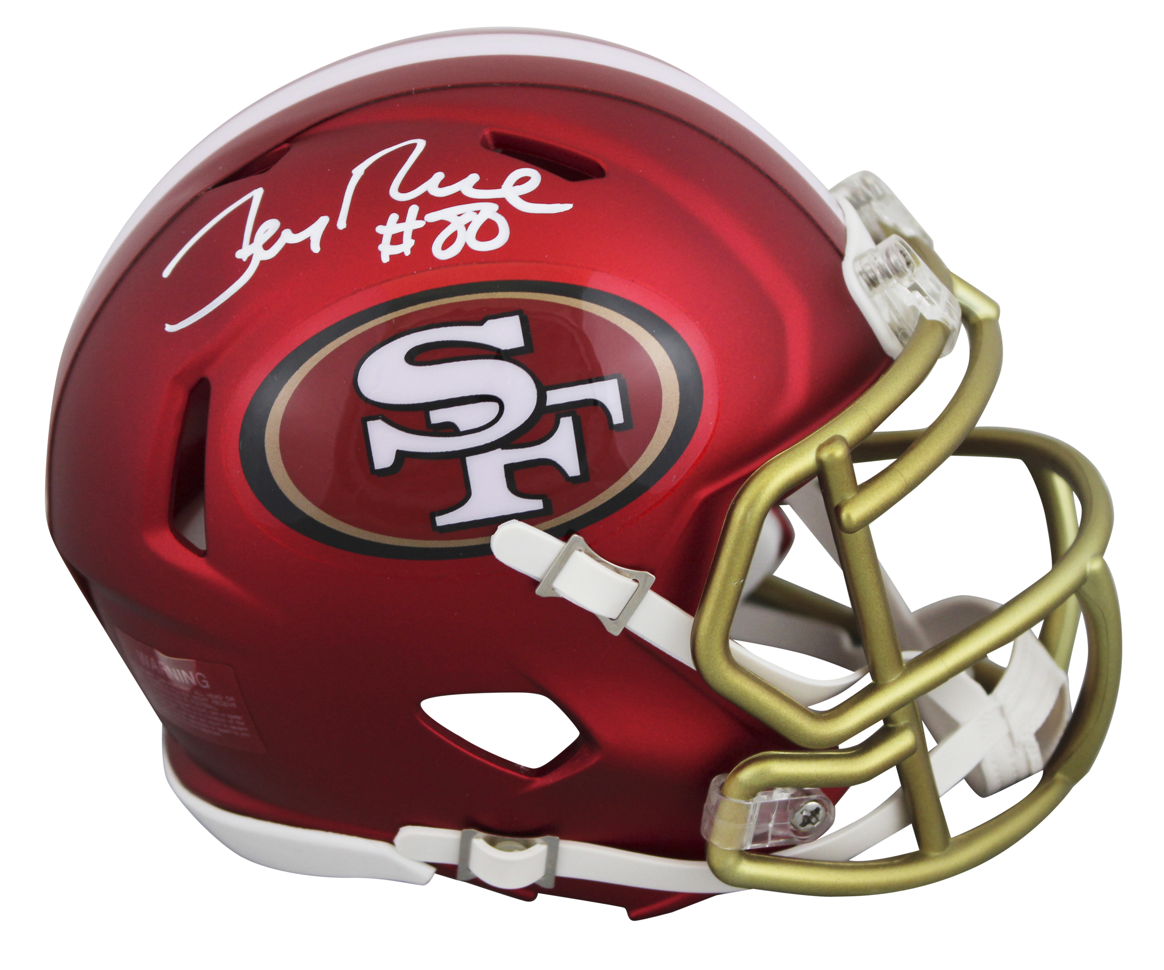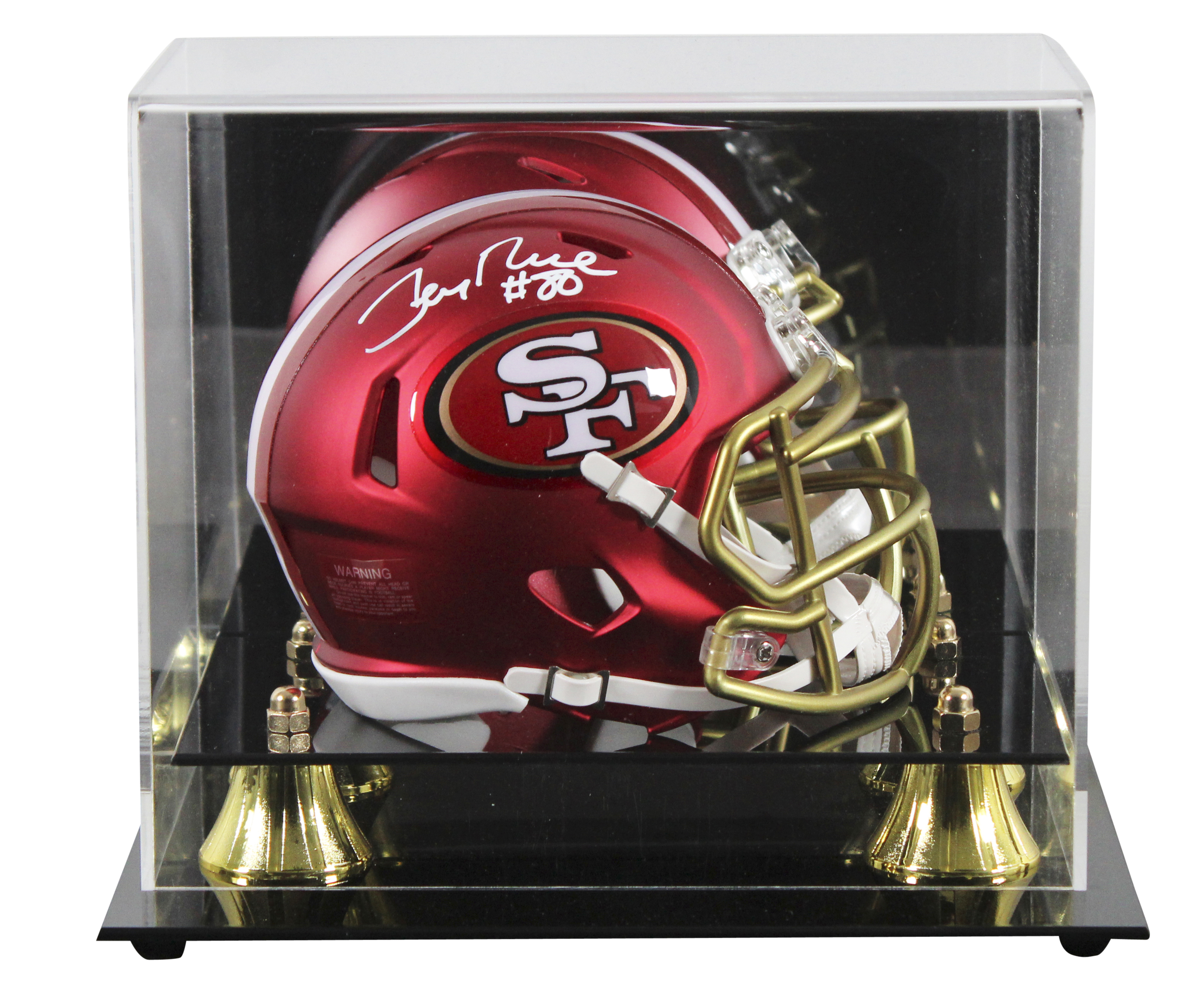 This Autographed Alternate Blaze Speed Mini Helmet W/ Uv Mirrored Back Acrylic Display Case has been Personally Signed by Jerry Rice of the San Francisco 49ers. This item is 100% Authentic to includes a numbered hologram by Fanatics. We conducted an autograph signing with Jerry Rice where multiples of the same item were signed. While the photographs are representative of this item, the size, placement and strength of the signature may vary. Each item is hand signed, therefore, each autograph is unique. This item can be verified through Fanatics.