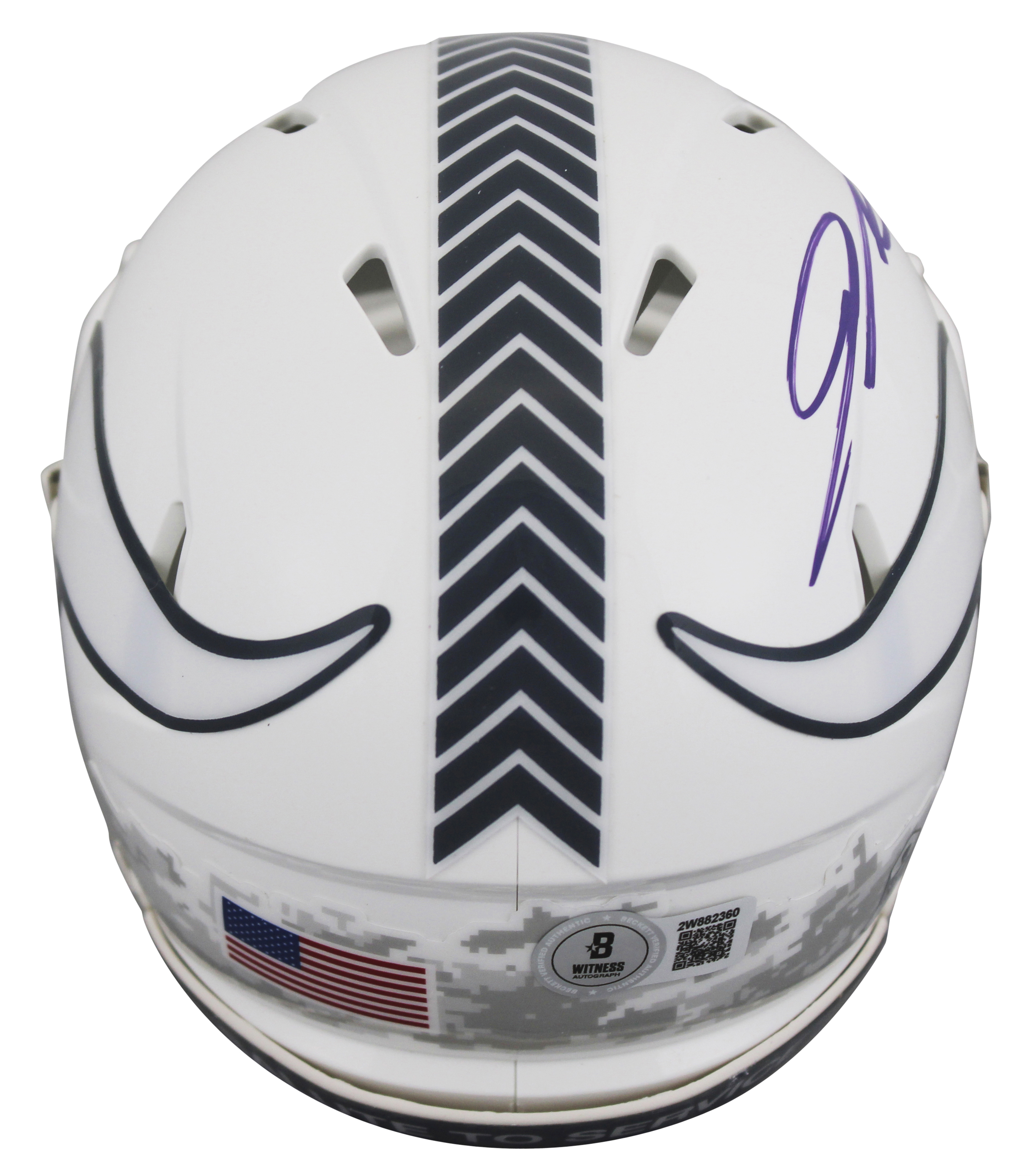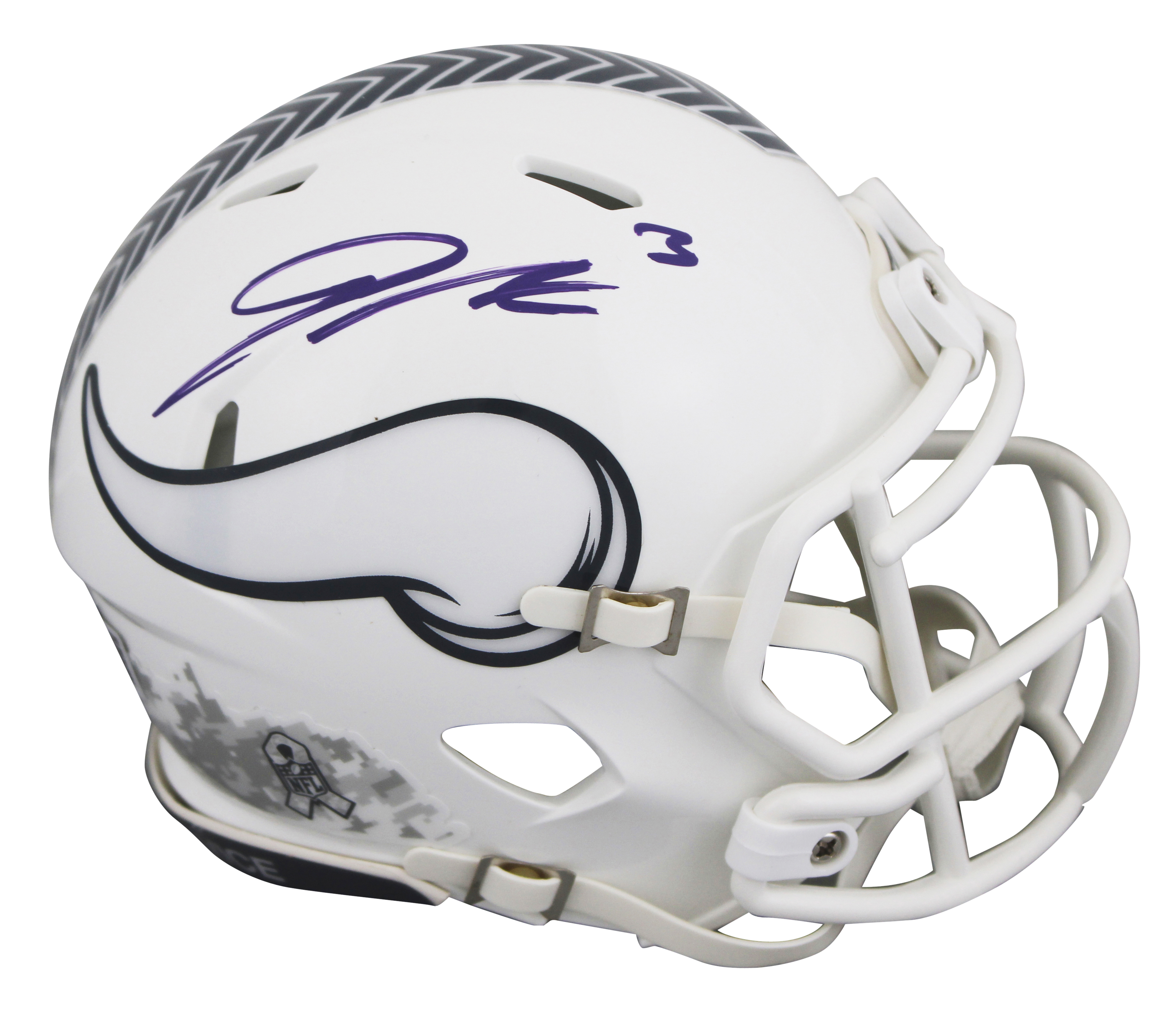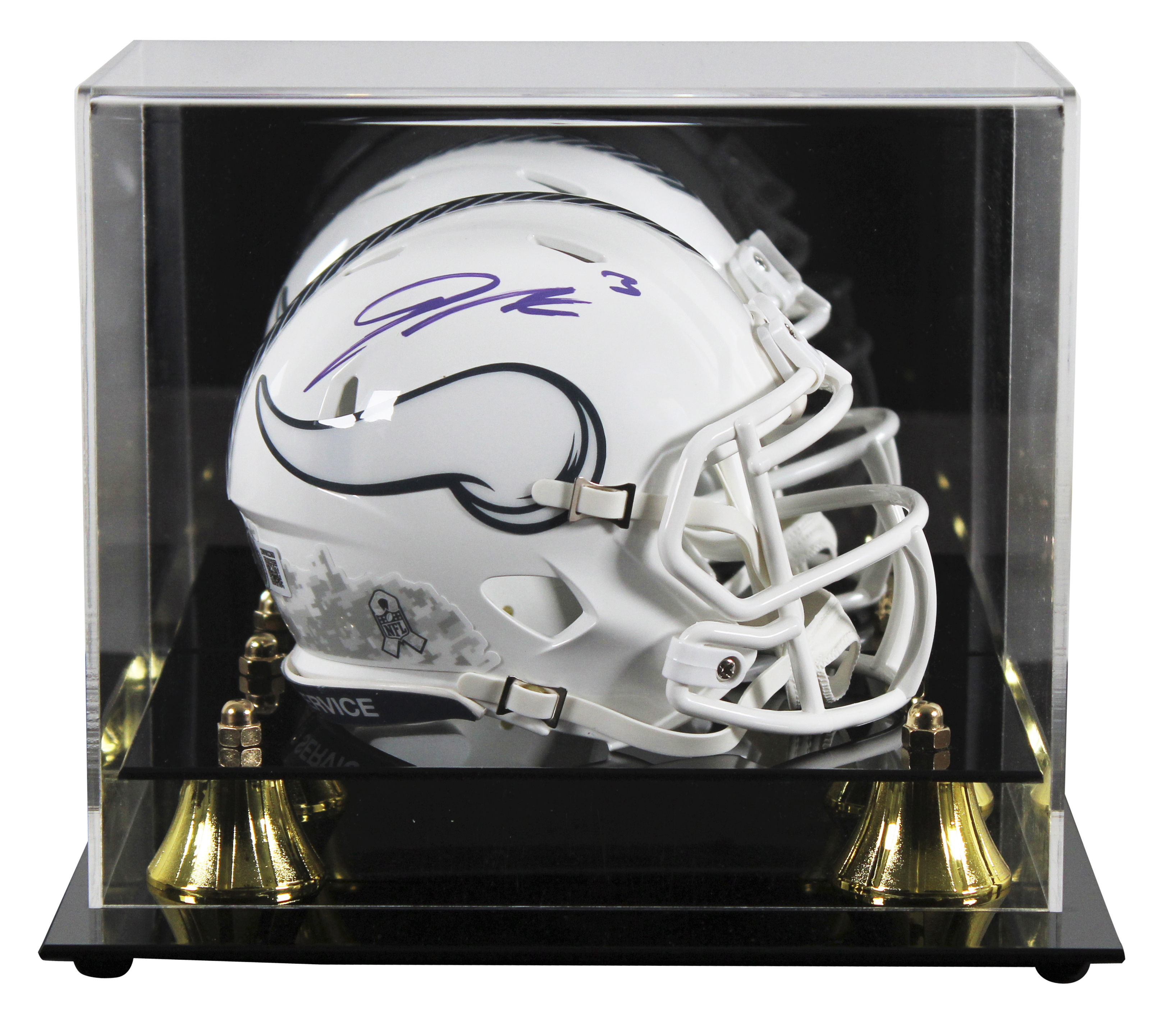 This Autographed Alternate 2024 Salute To Service III Speed Mini Helmet W/ Uv Mirrored Back Acrylic Display Case has been Personally Signed by Jordan Addison of the Minnesota Vikings. This item is 100% Authentic to include a hologram by Beckett Authentication Services. This item will come with an affixed Beckett Authentication Services (BAS) authentication sticker, which includes a scannable QR code to verify authenticity. Please note that Beckett no longer provides serial-numbered COA cards, and the attached BAS sticker will serve as the complete authentication for this item. This is a BAS Witnessed Protection Program item which means a Beckett Authentication Service representative was present when this item was being signed. We conducted an autograph signing with Jordan Addison where multiples of the same item were signed. While the photographs are representative of this item, the size, placement and strength of the signature may vary. Each item is hand signed, therefore, each autograph is unique. This item can be verified through BAS Witnessed.