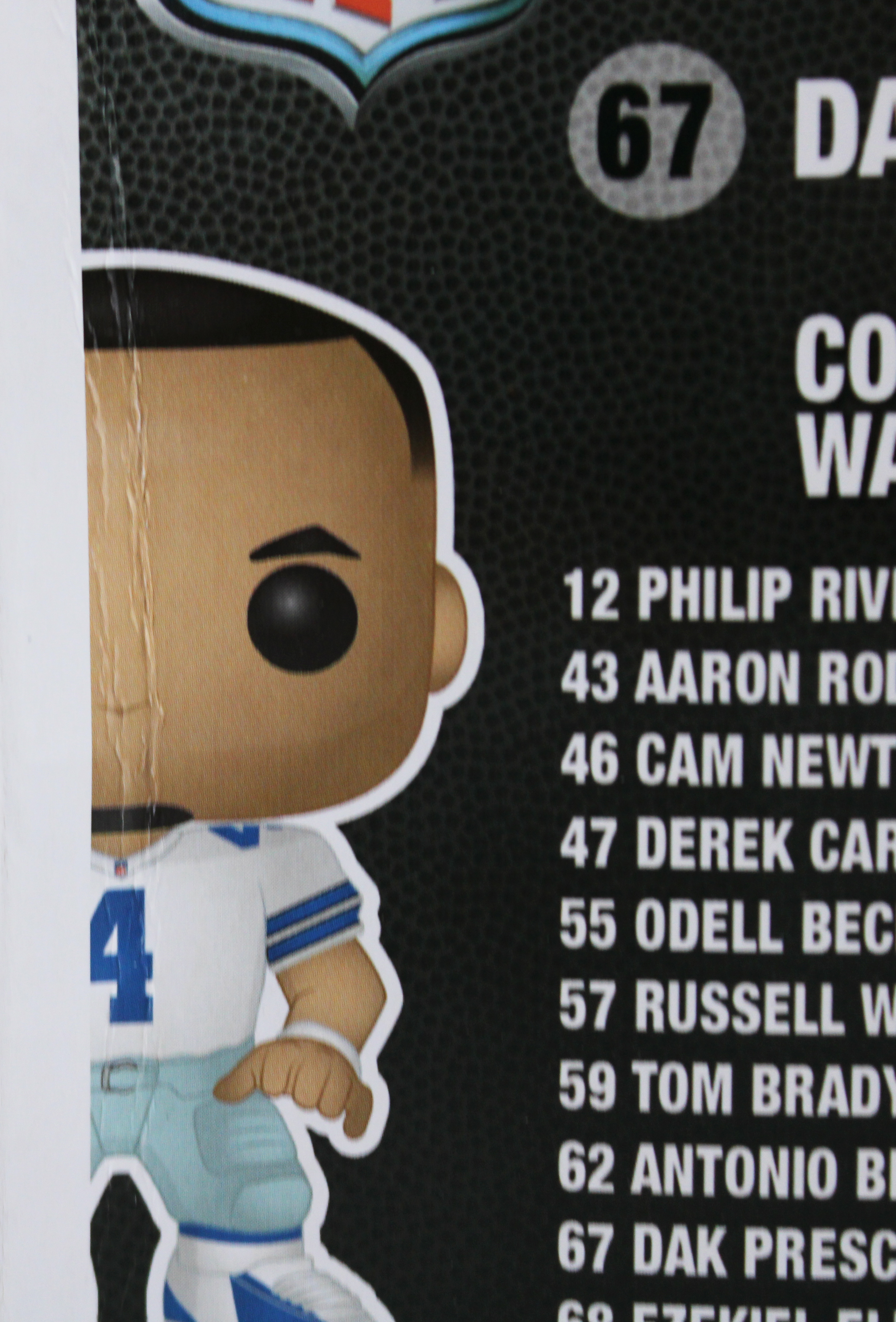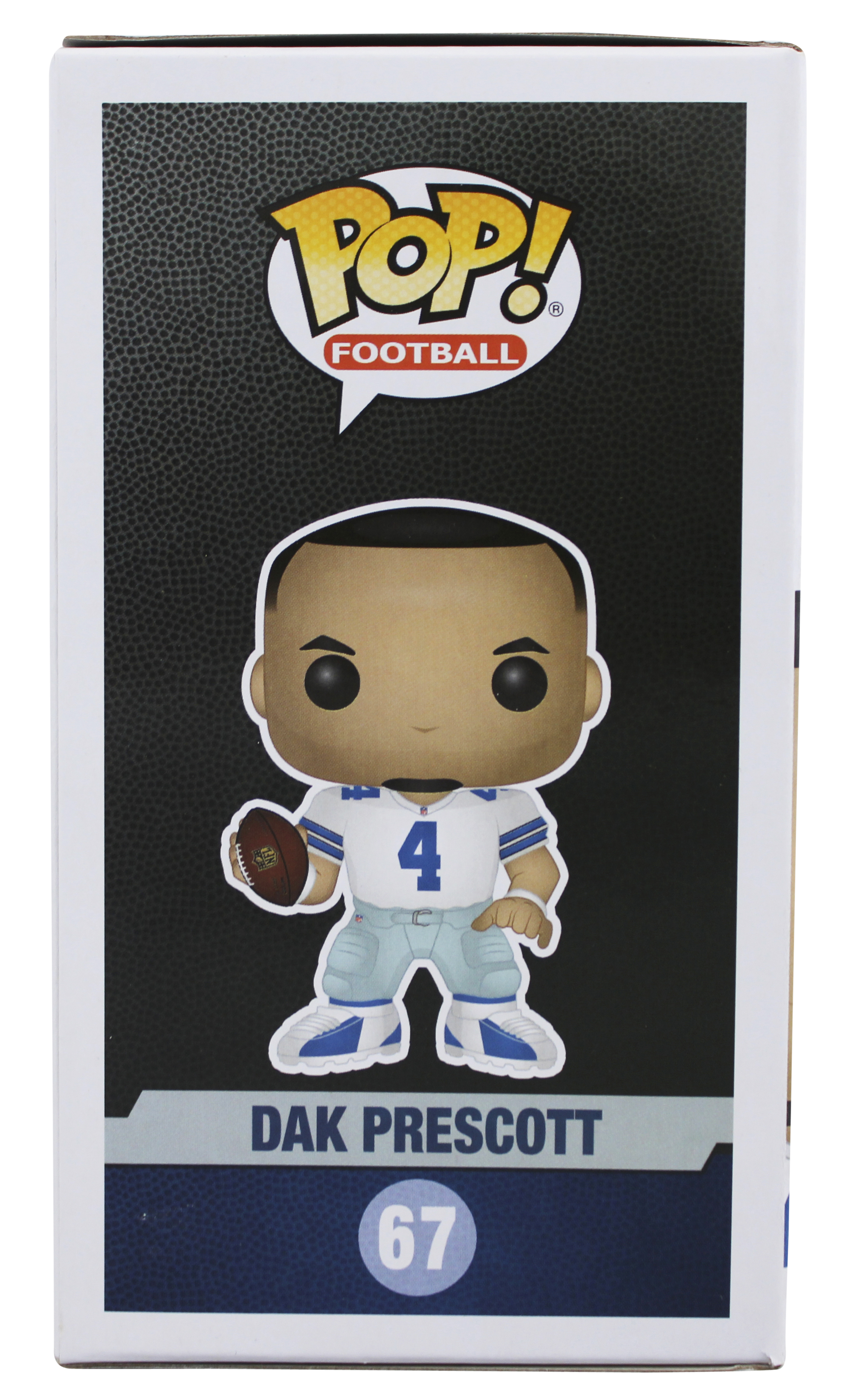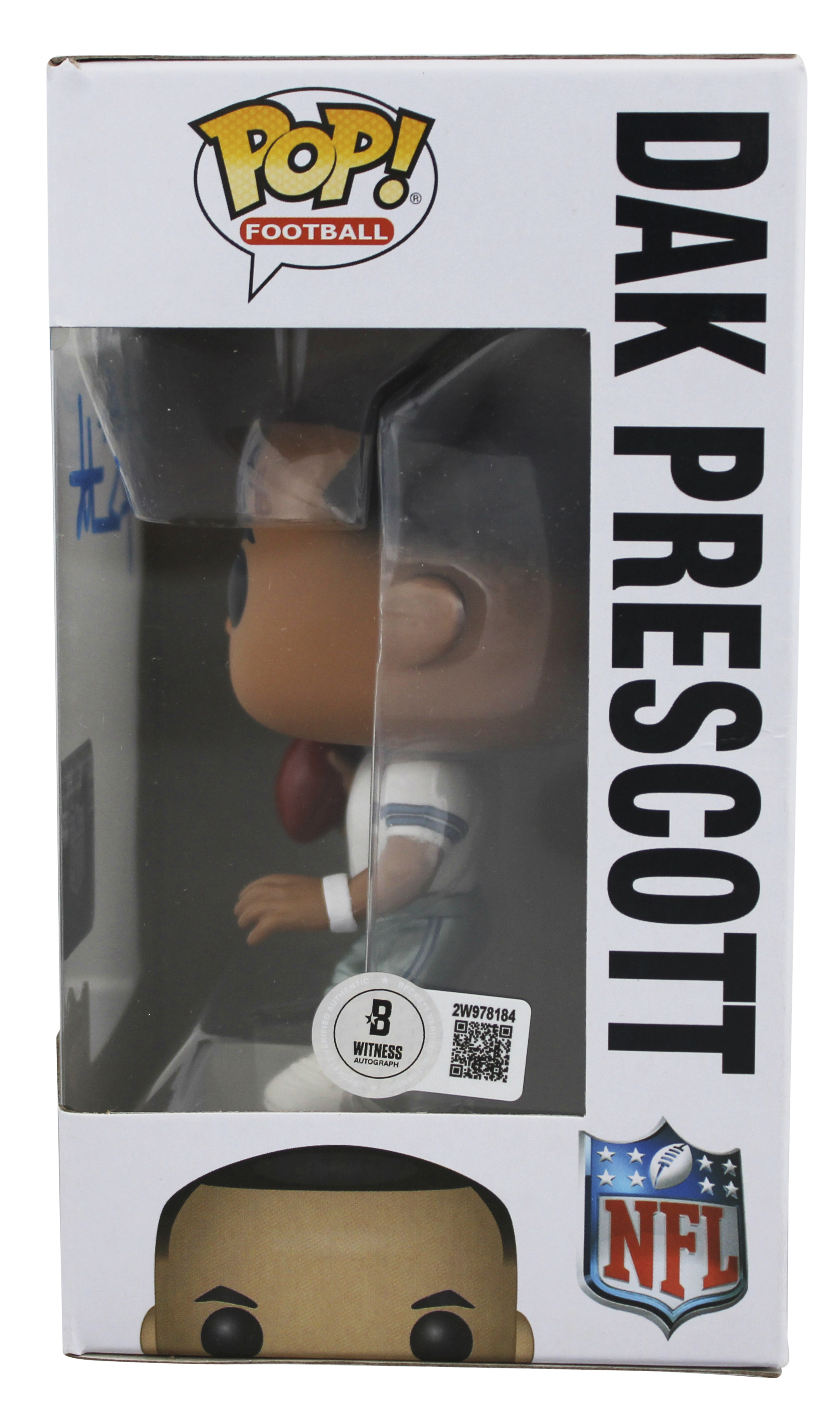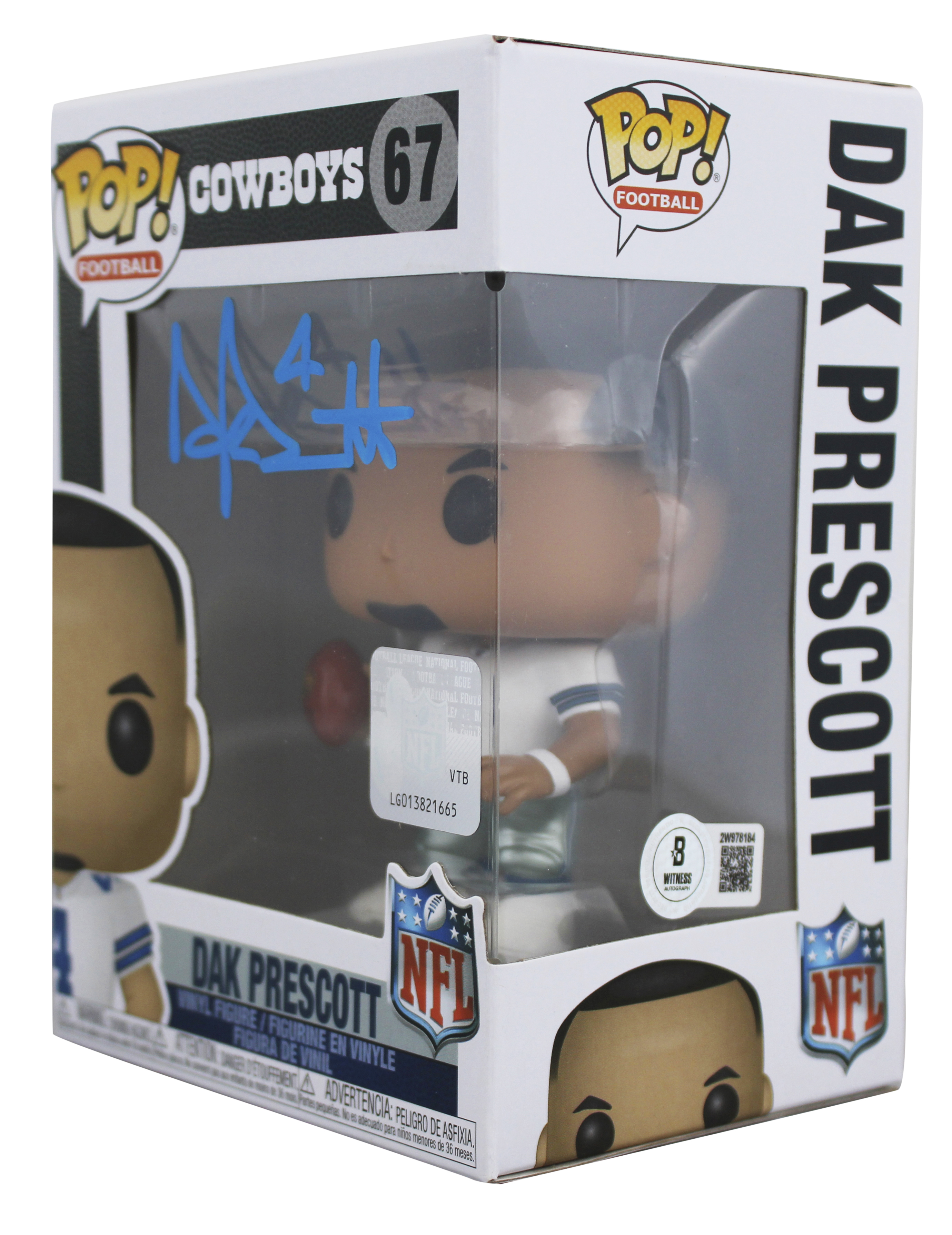This Autographed #67 Funko Pop Vinyl Figure has been Personally Signed by Dak Prescott of the Dallas Cowboys. This item is 100% Authentic to include a hologram by Beckett Authentication Services. This item will come with an affixed Beckett Authentication Services (BAS) authentication sticker, which includes a scannable QR code to verify authenticity. Please note that Beckett no longer provides serial-numbered COA cards, and the attached BAS sticker will serve as the complete authentication for this item. This is a BAS Witnessed Protection Program item which means a Beckett Authentication Service representative was present when this item was being signed. The authenticity can be verified on Beckett Authentication Services website. This item will ship in a Pop! Protector, please refer to the photos for condition of the item prior to purchase. There is a crease on the backside of this Funko.