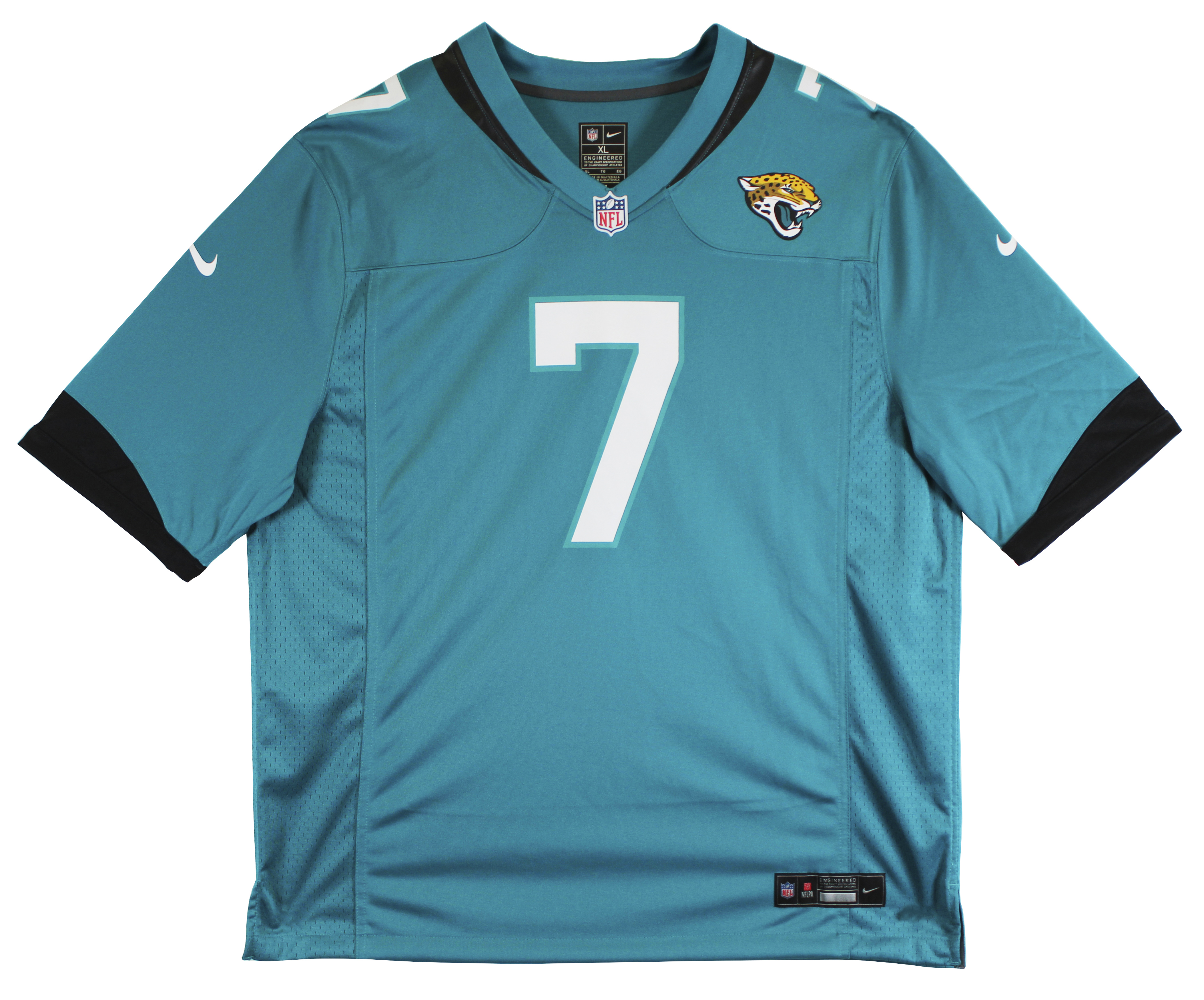 This Autographed Teal Nike Game Jersey has been Personally Signed by Brian Thomas Jr. of the Jacksonville Jaguars. This item is 100% Authentic to includes a numbered hologram by Fanatics. We conducted an autograph signing with Brian Thomas Jr. where multiples of the same item were signed. While the photographs are representative of this item, the size, placement and strength of the signature may vary. Each item is hand signed, therefore, each autograph is unique. This item can be verified through Fanatics. This is a X-Large sized Jersey.