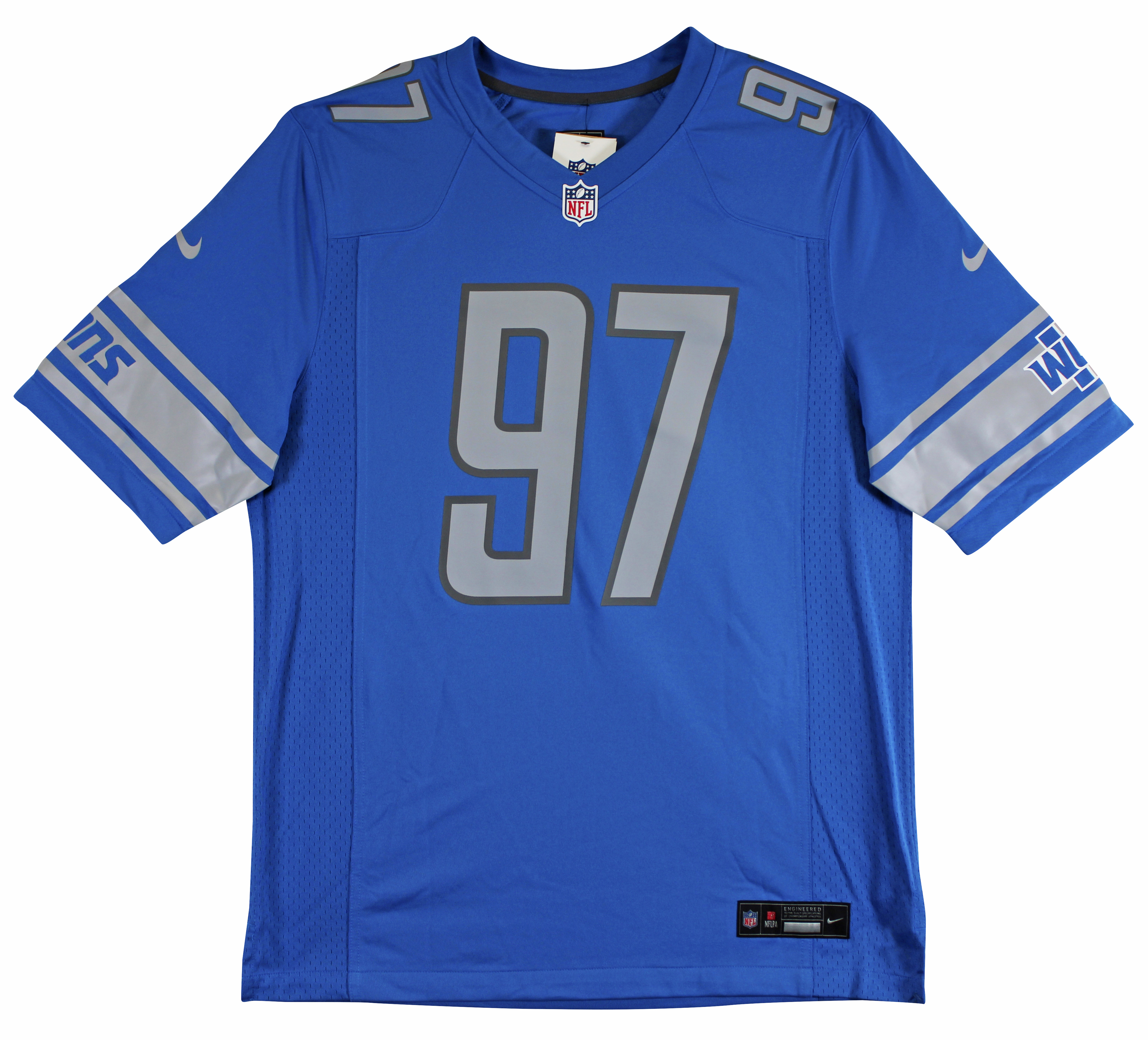 This Autographed w/ Silver Signature Blue Nike Game Jersey has been Personally Signed by Aidan Hutchinson of the Detroit Lions. This item is 100% Authentic to include a hologram by Beckett Authentication Services. This item will come with an affixed Beckett Authentication Services (BAS) authentication sticker, which includes a scannable QR code to verify authenticity. Please note that Beckett no longer provides serial-numbered COA cards, and the attached BAS sticker will serve as the complete authentication for this item. This is a BAS Witnessed Protection Program item which means a Beckett Authentication Service representative was present when this item was being signed. We conducted an autograph signing with Aidan Hutchinson where multiples of the same item were signed. While the photographs are representative of this item, the size, placement and strength of the signature may vary. Each item is hand signed, therefore, each autograph is unique. This item can be verified through BAS Witnessed. Multiple sizes available. Reach out for availability.