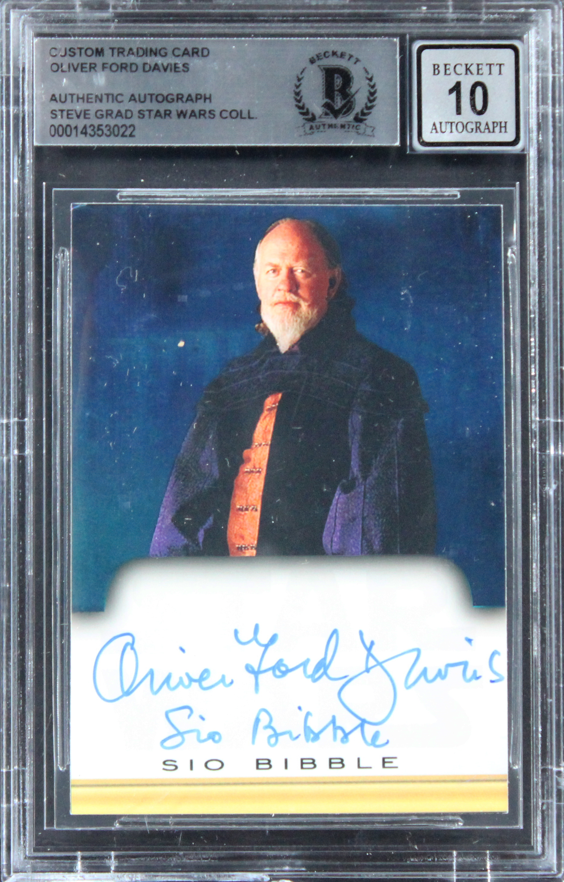 We have multiples of this same item. While the photographs are representative of this item, the size, placement and strength of the signature may vary. Each item is hand signed, therefore, each autograph is unique.This Autographed Auto Graded Gem Mint 10! Card with the inscription of "Sio Bibble" has been Personally Signed by Oliver Ford Davies of Star Wars. This item is 100% Authentic, it comes slabbed and authenticated by Beckett Authentication Services. We have multiples of this same item. While the photographs are representative of this item, the size, placement and strength of the signature may vary. Each item is hand signed, therefore, each autograph is unique.