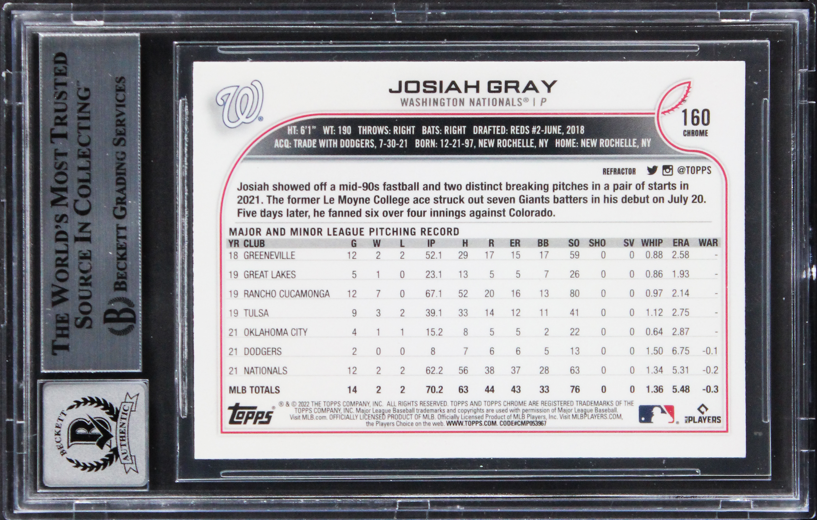 This Autographed Auto Graded Gem Mint 10! 2022 Topps Chrome Refractors #160 Card has been Personally Signed by Josiah Gray of the Washington Nationals. This item is 100% Authentic, it comes slabbed and authenticated by Beckett Authentication Services. The authenticity can be verified on Beckett Authentication Services website.