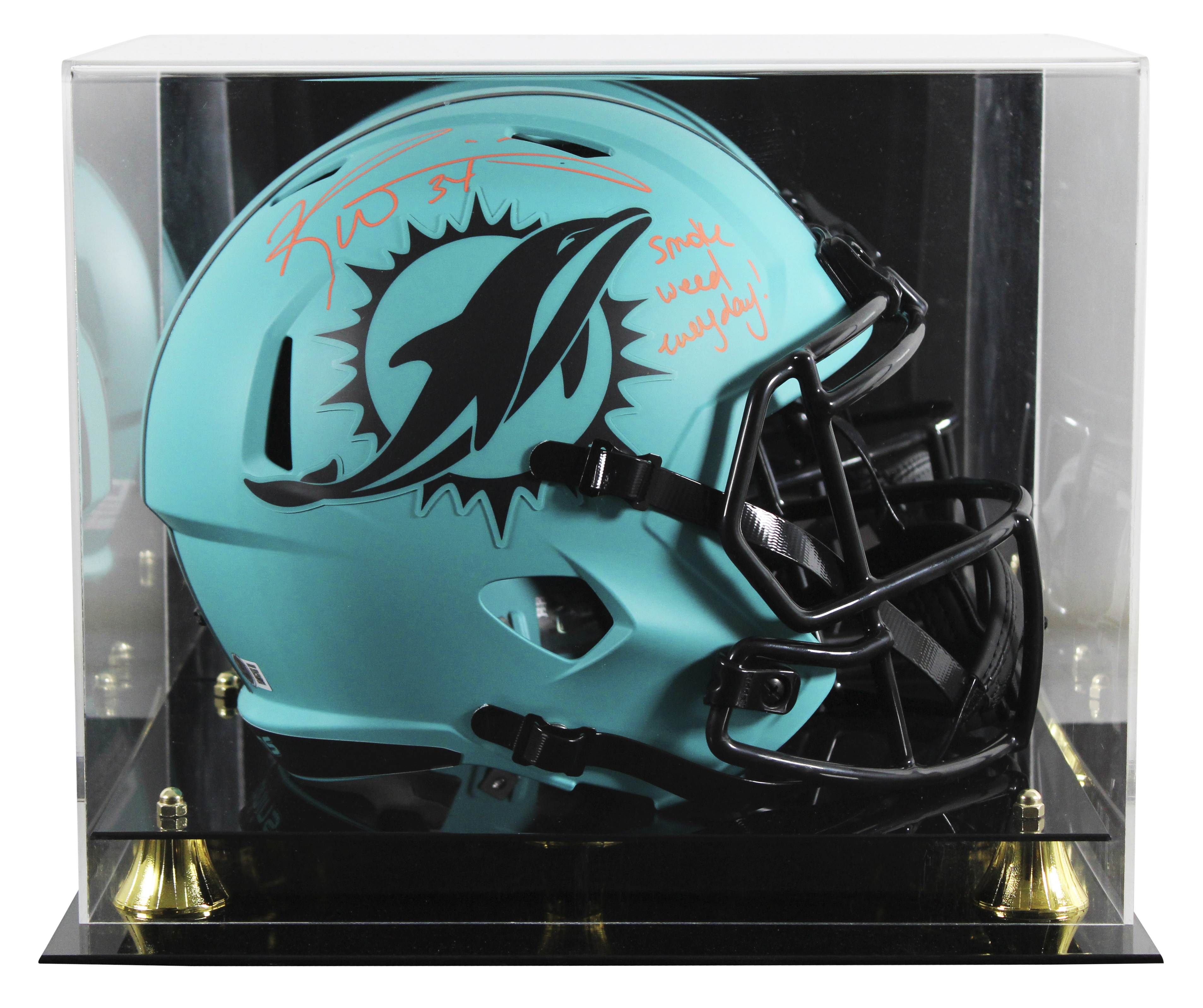 This Autographed Alternate Rave Riddell Full Size Speed Rep Helmet W/ Uv Mirrored Back Acrylic Display Case with the inscription of "Smoke Weed Everyday" has been Personally Signed by Ricky Williams of the Miami Dolphins. This item is 100% Authentic to include a hologram by Beckett Authentication Services. This item will come with an affixed Beckett Authentication Services (BAS) authentication sticker, which includes a scannable QR code to verify authenticity. Please note that Beckett no longer provides serial-numbered COA cards, and the attached BAS sticker will serve as the complete authentication for this item. This is a BAS Witnessed Protection Program item which means a Beckett Authentication Service representative was present when this item was being signed. We conducted an autograph signing with Ricky Williams where multiples of the same item were signed. While the photographs are representative of this item, the size, placement and strength of the signature may vary. Each item is hand signed, therefore, each autograph is unique. This item can be verified through BAS Witnessed.