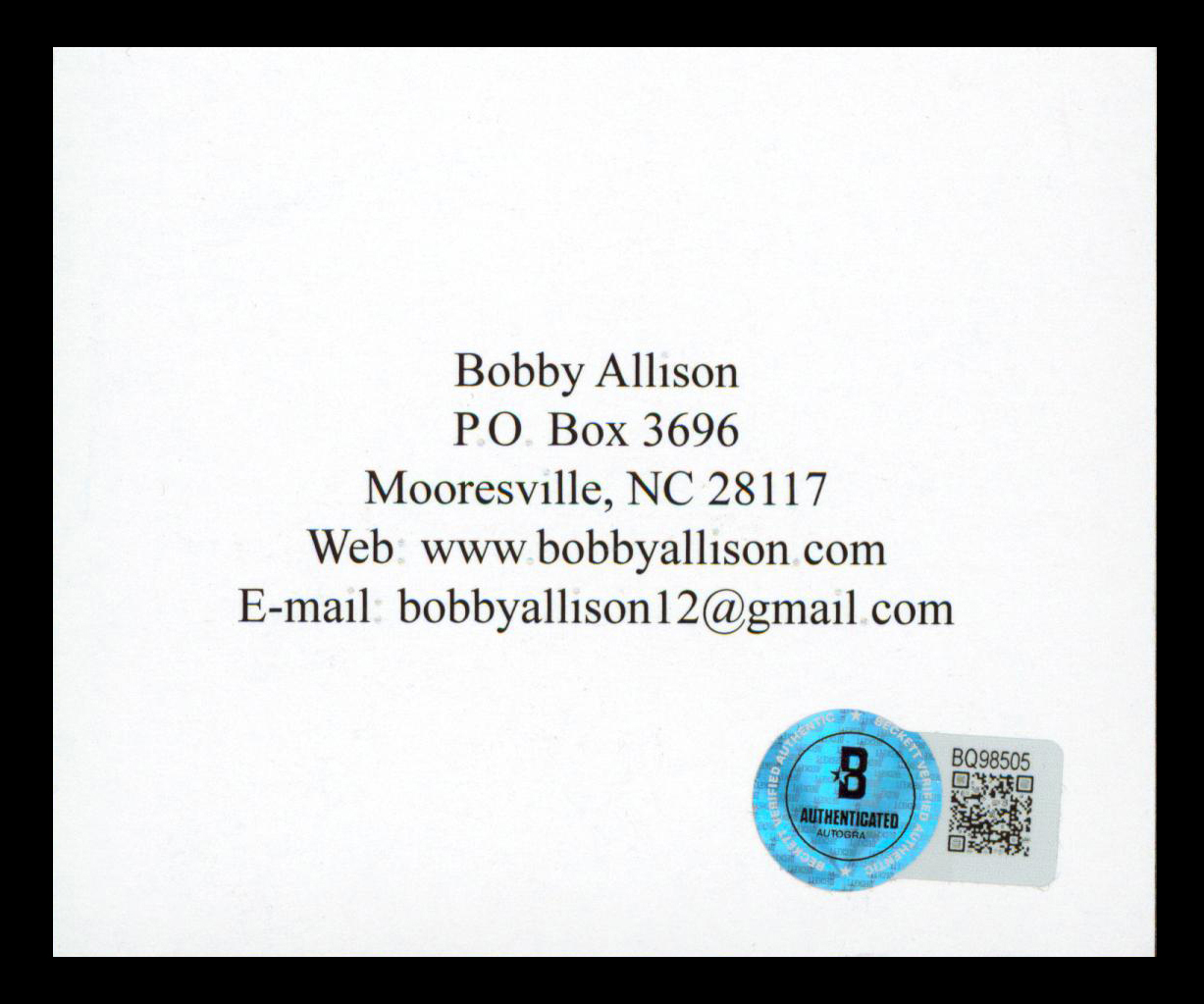This Autographed 3.75x3.5 Postcard has been Personally Signed by Bobby Allison. This item is 100% Authentic to include a hologram by Beckett Authentication Services. This item will come with an affixed Beckett Authentication Services (BAS) authentication sticker, which includes a scannable QR code to verify authenticity. Please note that Beckett no longer provides serial-numbered COA cards, and the attached BAS sticker will serve as the complete authentication for this item. We have multiples of this same item. While the photographs are representative of this item, the size, placement and strength of the signature may vary. Each item is hand signed, therefore, each autograph is unique.