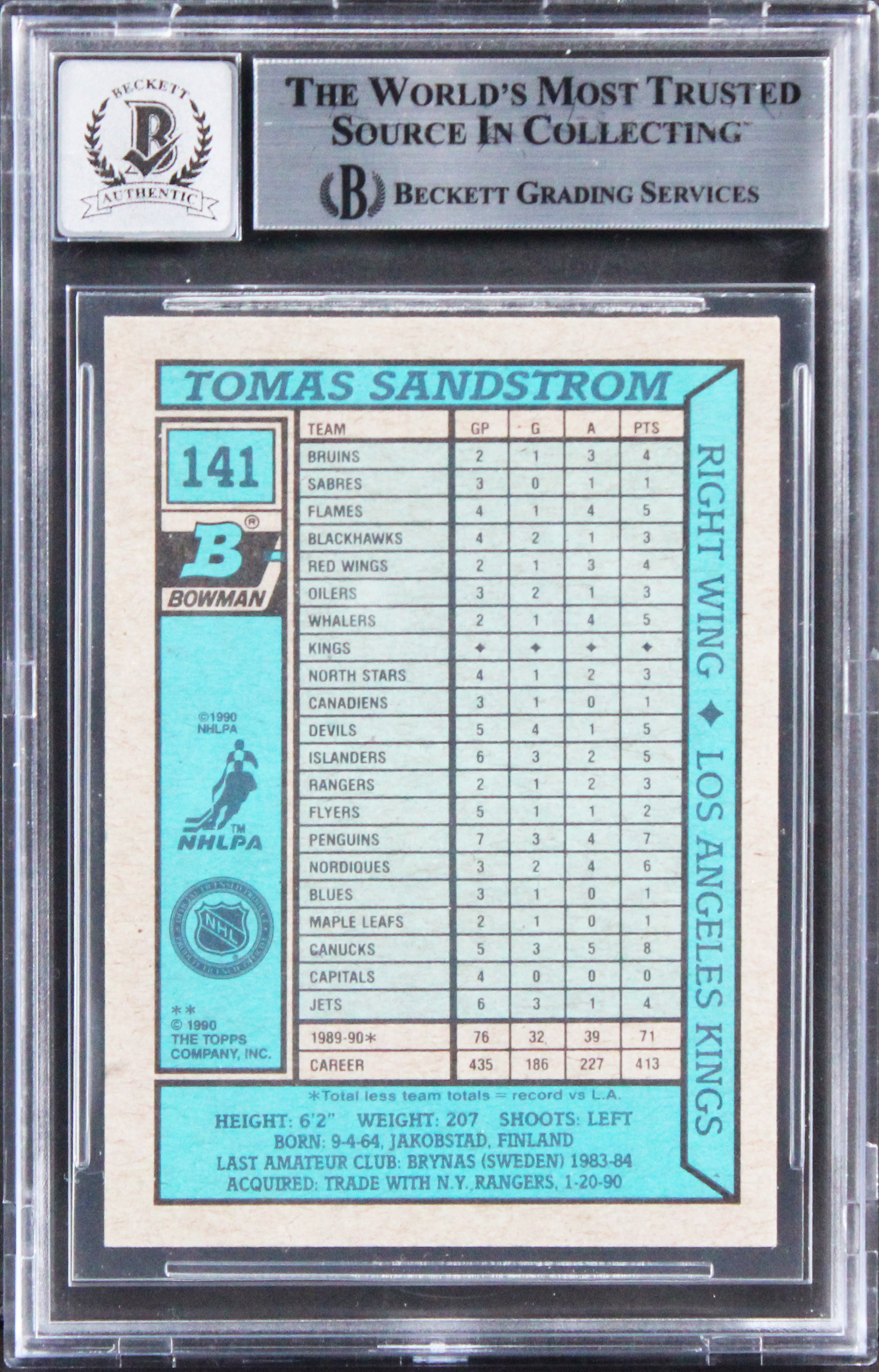 This Autographed Auto Graded Gem Mint 10! 1990 Bowman #141 Card has been Personally Signed by Tomas Sandstrom of the Los Angeles Kings. This item is 100% Authentic, it comes slabbed and authenticated by Beckett Authentication Services. The authenticity can be verified on Beckett Authentication Services website.
