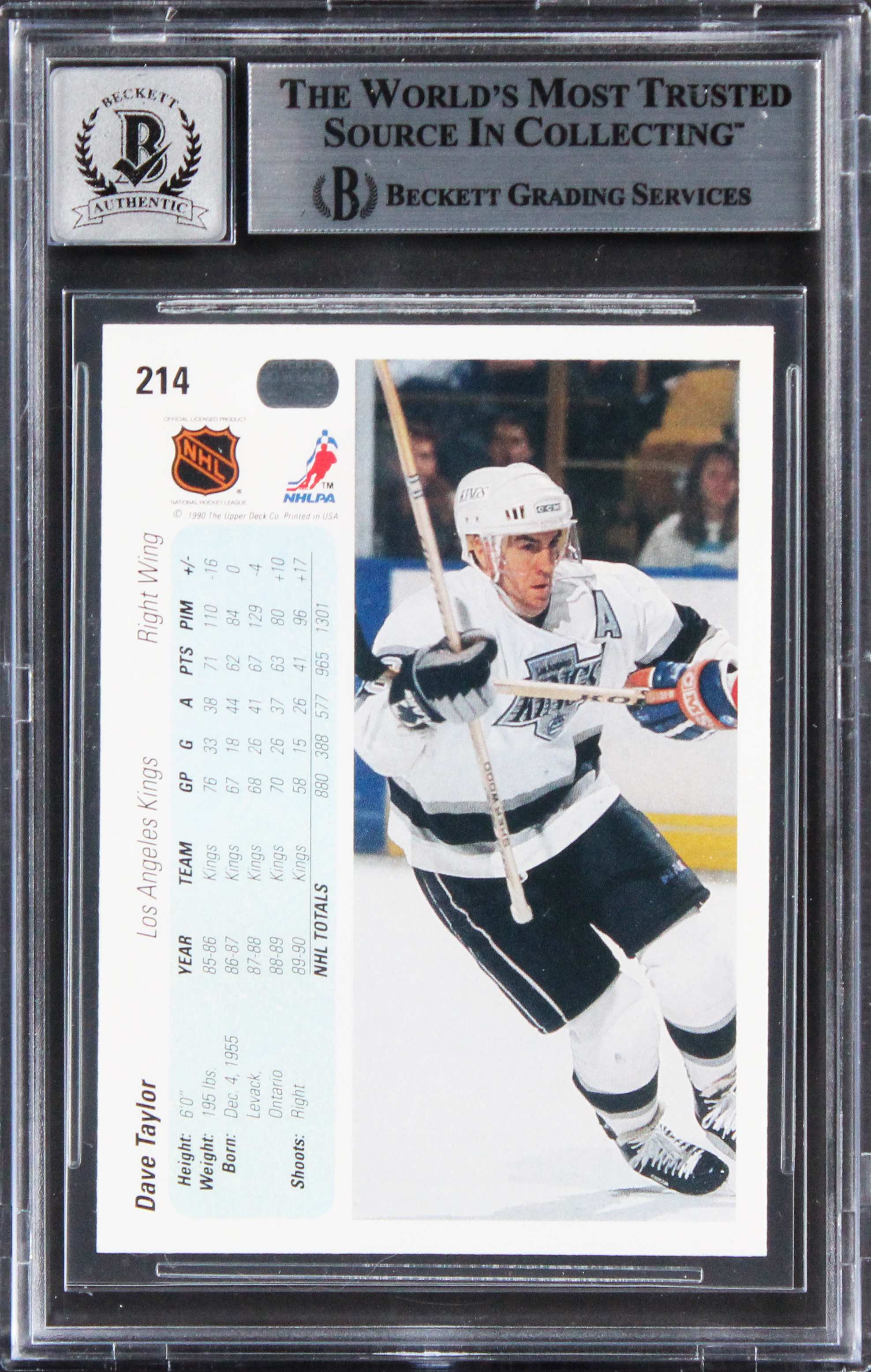 This Autographed Auto Graded Gem Mint 10! 1990 Upper Deck #214 Card has been Personally Signed by Dave Taylor of the Los Angeles Kings. This item is 100% Authentic, it comes slabbed and authenticated by Beckett Authentication Services. The authenticity can be verified on Beckett Authentication Services website.