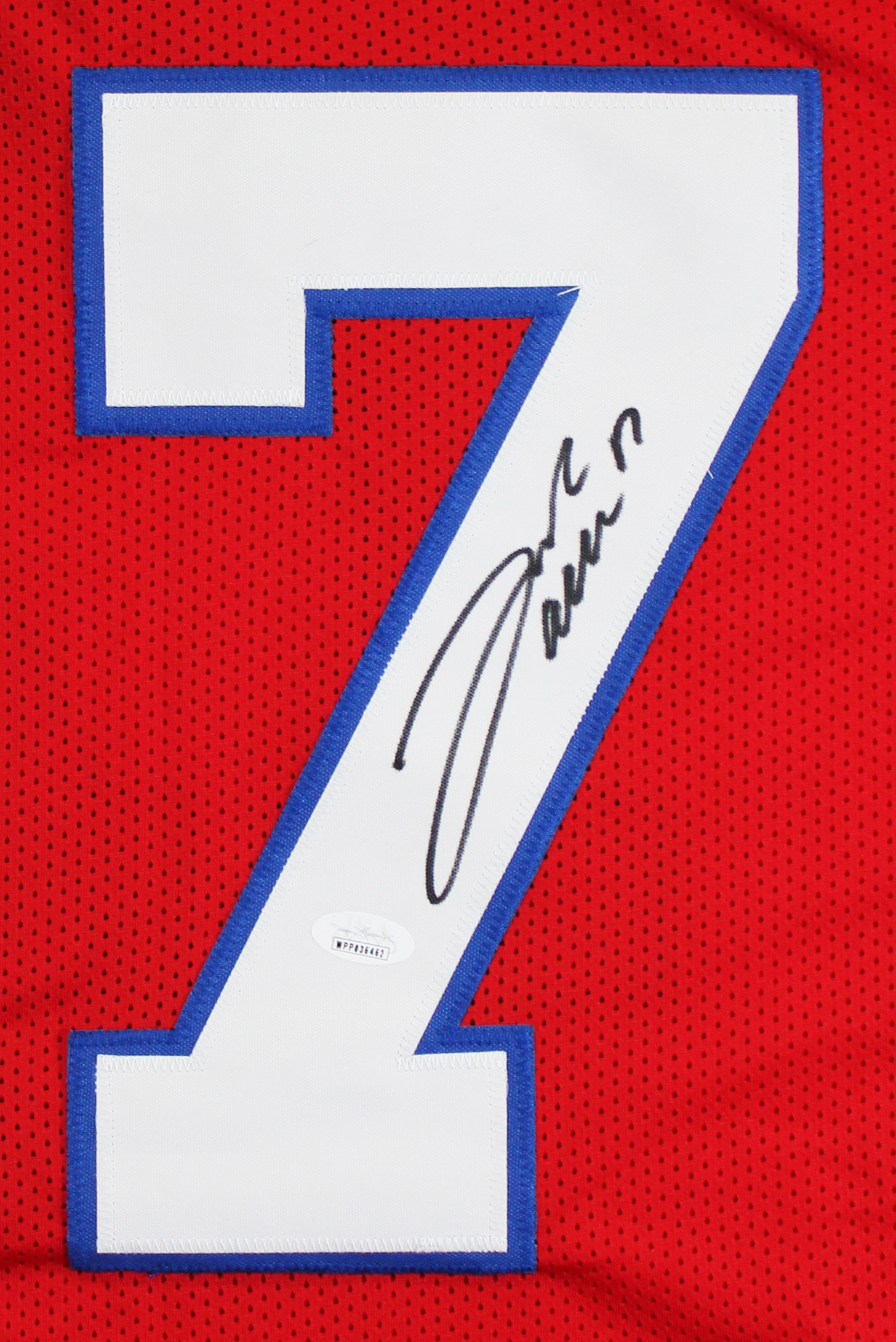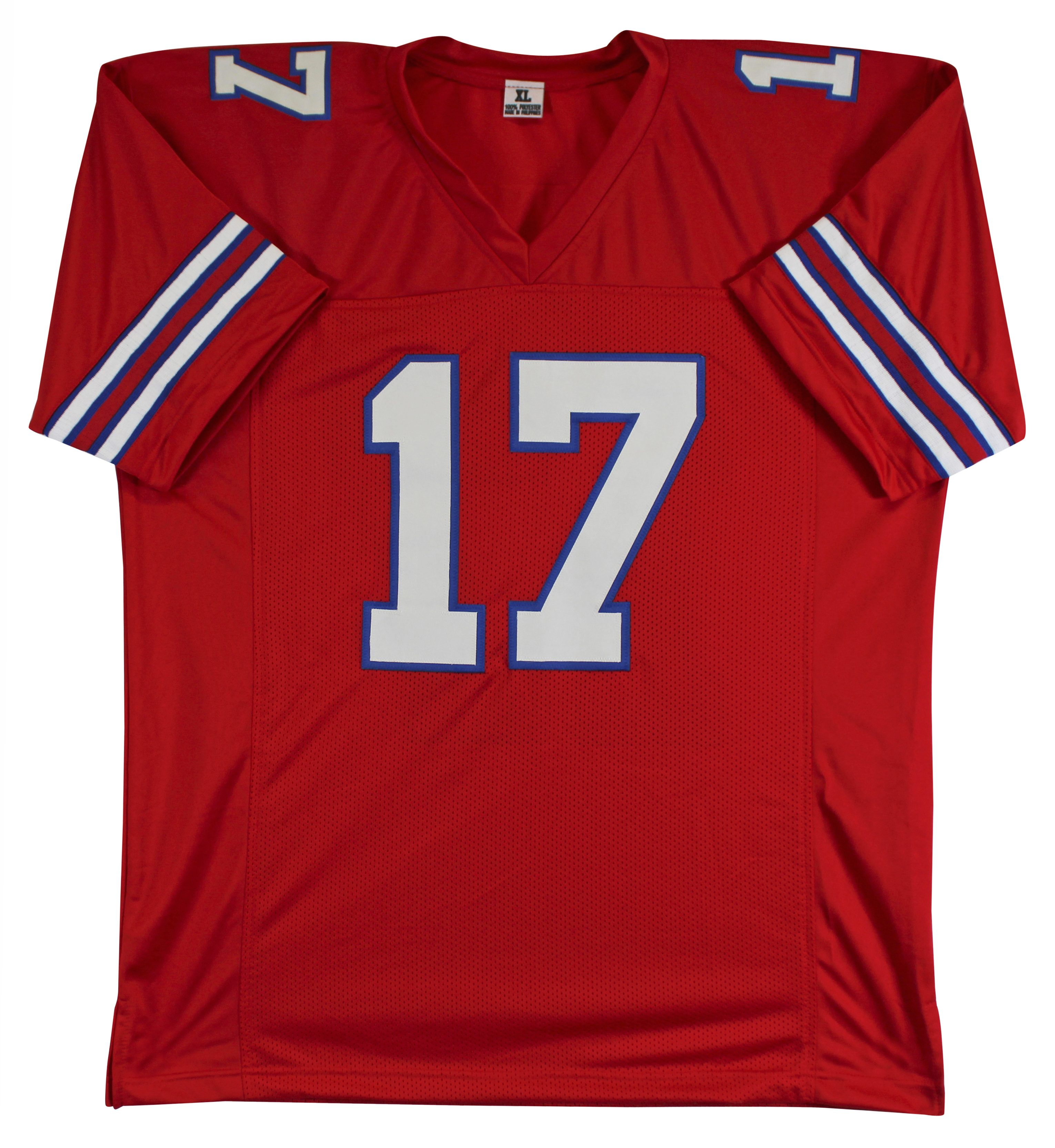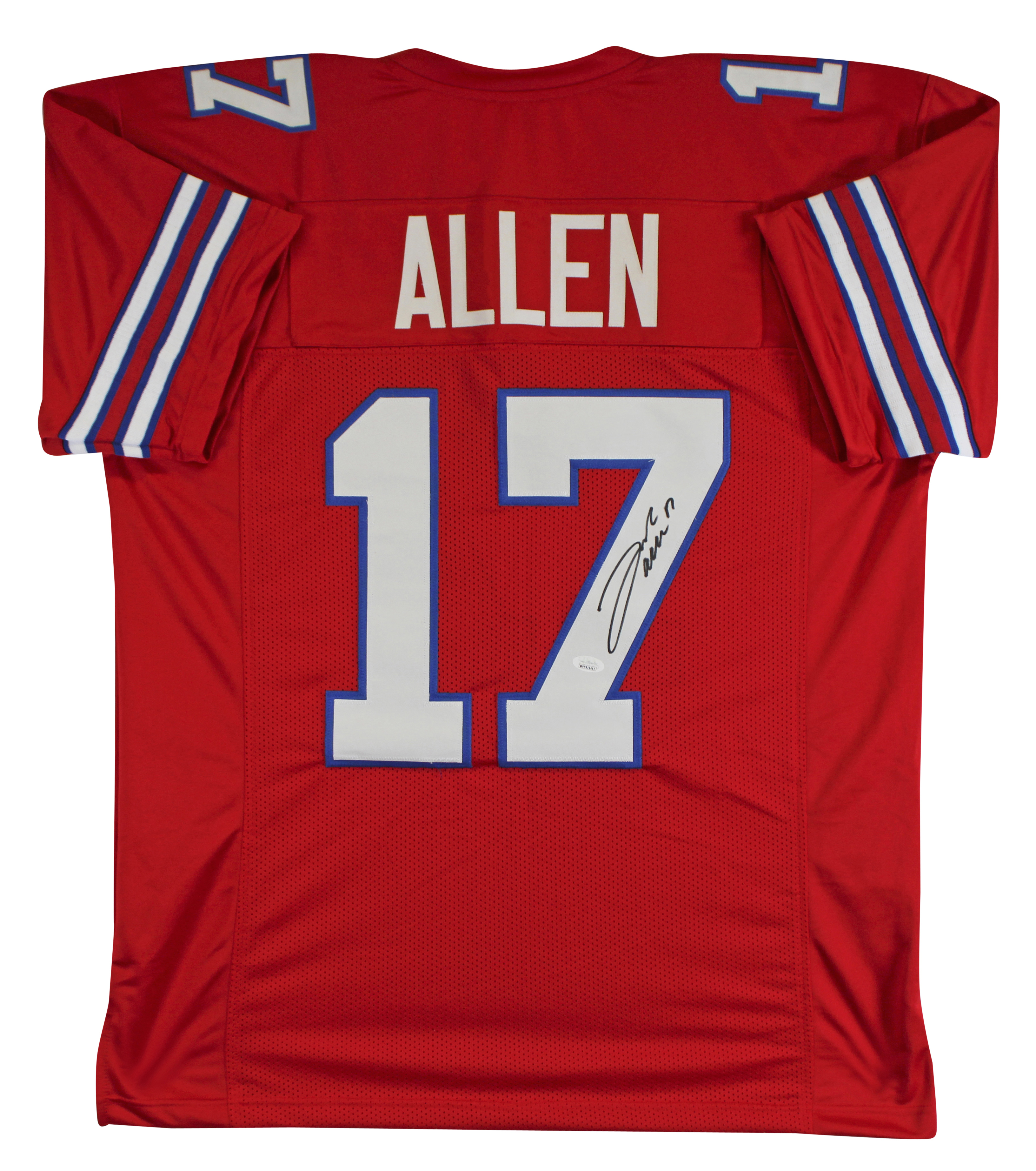 This Autographed Red Pro Style Jersey has been Personally Signed by Josh Allen of the Buffalo Bills. This item is 100% Authentic to include a Certificate of Authenticity (COA) / hologram by JSA Witness. This is a JSA Witnessed Protection Program item which means a JSA representative was present when this item was being signed. We have multiples of this same item. While the photographs are representative of this item, the size, placement and strength of the signature may vary. Each item is hand signed, therefore, each autograph is unique. This is a X-Large sized, non-branded, custom-stitched Jersey.