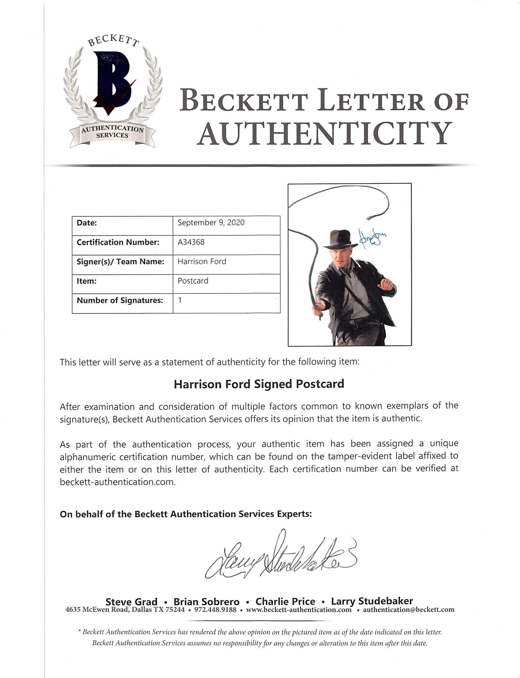 This Autographed 16x20 Photo has been Personally Signed by Harrison Ford of Indiana Jones. This item is 100% Authentic to include a hologram by Beckett Authentication Services. This item will come with an affixed Beckett Authentication Services (BAS) authentication sticker, which includes a scannable QR code to verify authenticity. Please note that Beckett no longer provides serial-numbered COA cards, and the attached BAS sticker will serve as the complete authentication for this item. The authenticity can be verified on Beckett Authentication Services website.