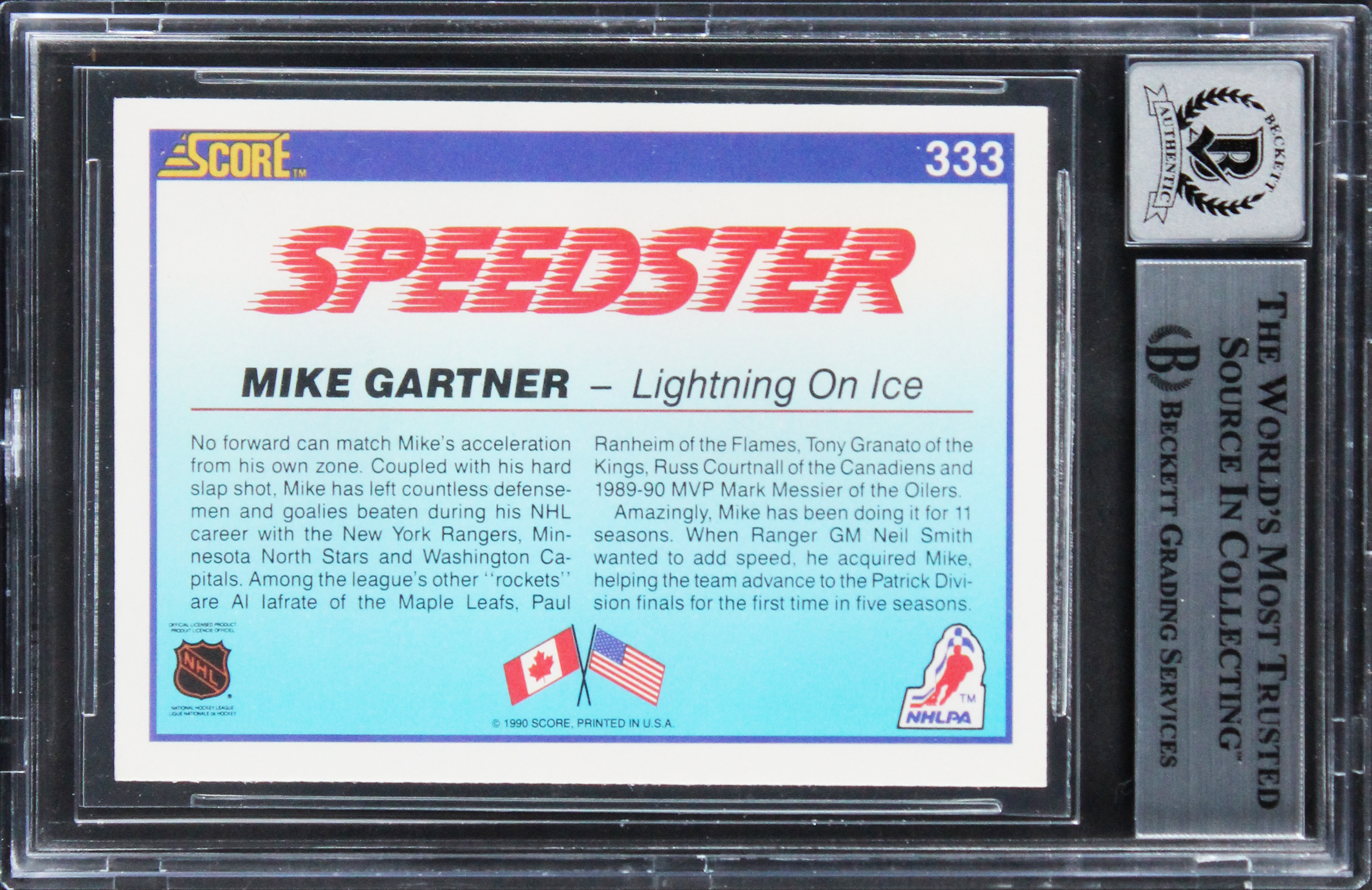 This Autographed Auto Graded Gem Mint 10! 1990 Score #333 Card has been Personally Signed by Mike Gartner of the New York Rangers. This item is 100% Authentic, it comes slabbed and authenticated by Beckett Authentication Services. The authenticity can be verified on Beckett Authentication Services website.