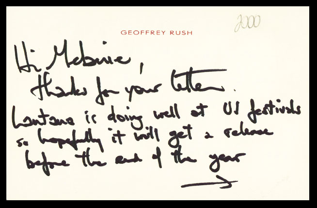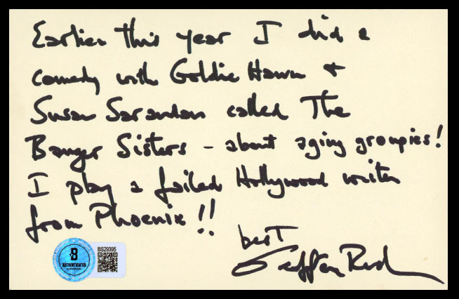 This Autographed 4x6.25 Note Written on Personal Letterhead has been Personally Signed by Geoffrey Rush of Pirates Of The Caribbean. This item is 100% Authentic to include a hologram by Beckett Authentication Services. This item will come with an affixed Beckett Authentication Services (BAS) authentication sticker, which includes a scannable QR code to verify authenticity. Please note that Beckett no longer provides serial-numbered COA cards, and the attached BAS sticker will serve as the complete authentication for this item. The authenticity can be verified on Beckett Authentication Services website.