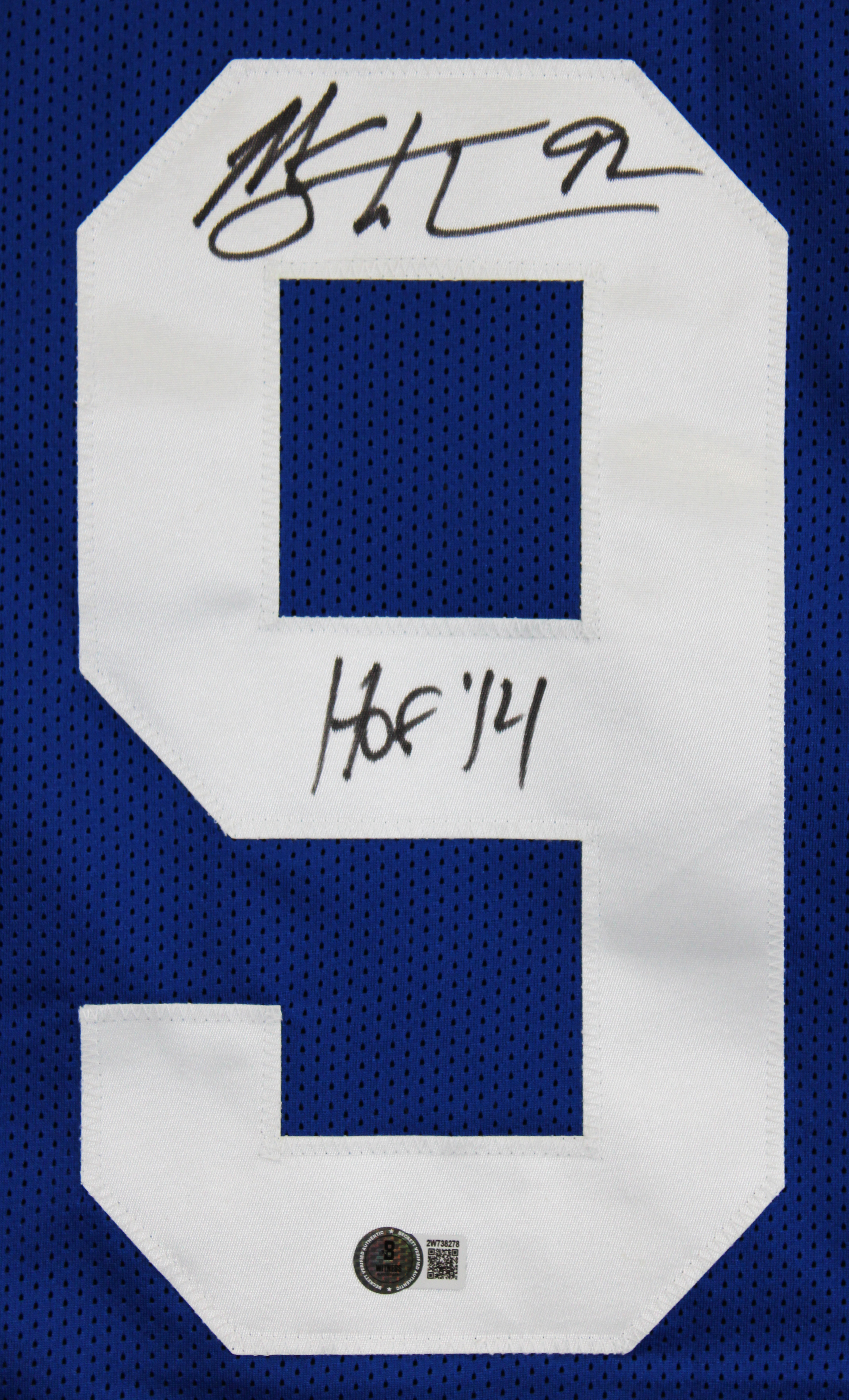 This Autographed Blue Pro Style Jersey with the inscription of "HOF 14" has been Personally Signed by Michael Strahan of the New York Giants. This item is 100% Authentic to include a hologram by Beckett Authentication Services. This item will come with an affixed Beckett Authentication Services (BAS) authentication sticker, which includes a scannable QR code to verify authenticity. Please note that Beckett no longer provides serial-numbered COA cards, and the attached BAS sticker will serve as the complete authentication for this item. This is a BAS Witnessed Protection Program item which means a Beckett Authentication Service representative was present when this item was being signed. We conducted an autograph signing with Michael Strahan where multiples of the same item were signed. While the photographs are representative of this item, the size, placement and strength of the signature may vary. Each item is hand signed, therefore, each autograph is unique. This item can be verified through BAS Witnessed. This is a X-Large sized, non-branded, custom-stitched Jersey.