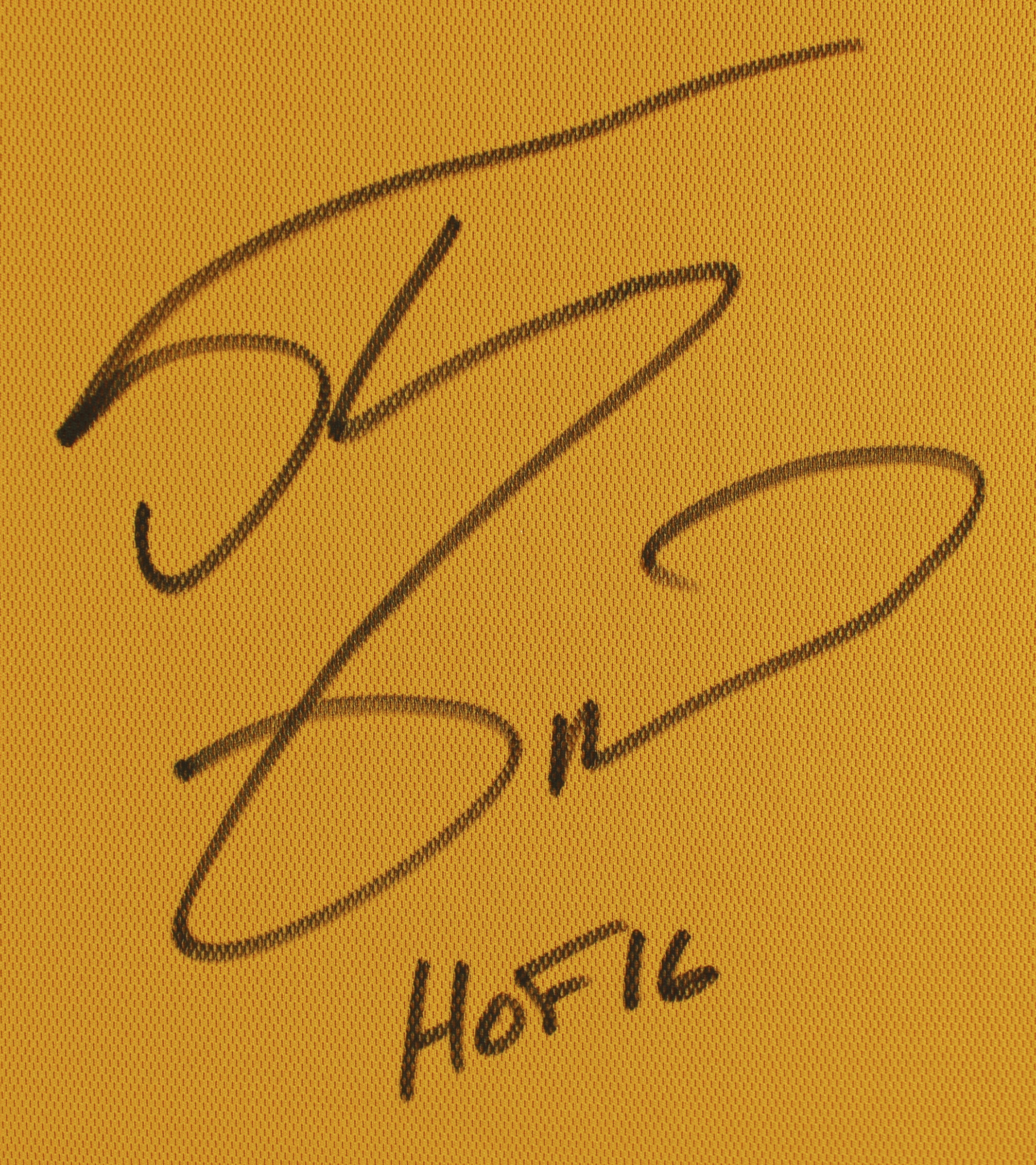 This Autographed Yellow Mitchell & Ness 1999-2000 Hardwood Classics Authentic Framed Jersey with the inscription of "HOF 16" has been Personally Signed by Shaquille O'Neal of the Los Angeles Lakers. This item is 100% Authentic to include a hologram by Beckett Authentication Services. This item will come with an affixed Beckett Authentication Services (BAS) authentication sticker, which includes a scannable QR code to verify authenticity. Please note that Beckett no longer provides serial-numbered COA cards, and the attached BAS sticker will serve as the complete authentication for this item. This is a BAS Witnessed Protection Program item which means a Beckett Authentication Service representative was present when this item was being signed. We conducted an autograph signing with Shaquille O'Neal where multiples of the same item were signed. While the photographs are representative of this item, the size, placement and strength of the signature may vary. Each item is hand signed, therefore, each autograph is unique. This item can be verified through BAS Witnessed. This item has been professionally framed to overall dimensions of approximately 32 x 37 inches. This is a X-Large sized Framed Jersey. This jersey will be framed to order, it will take approximately 3-4 business days from purchase date for it to ship.