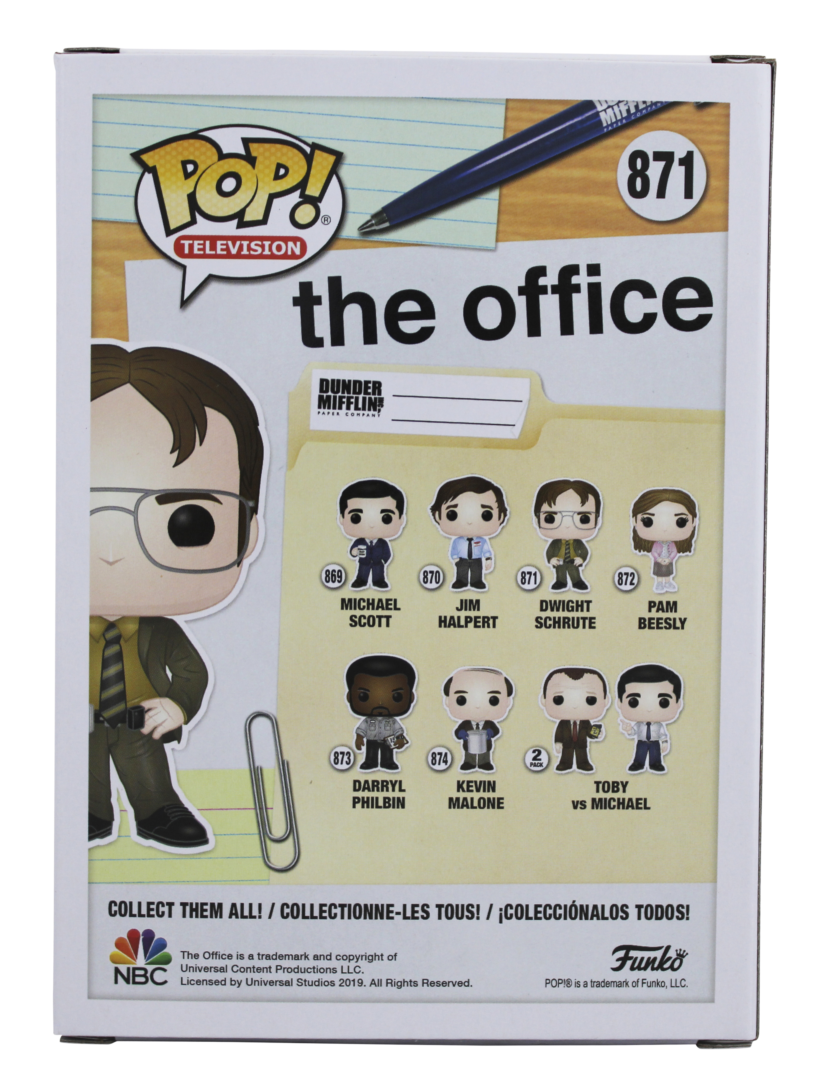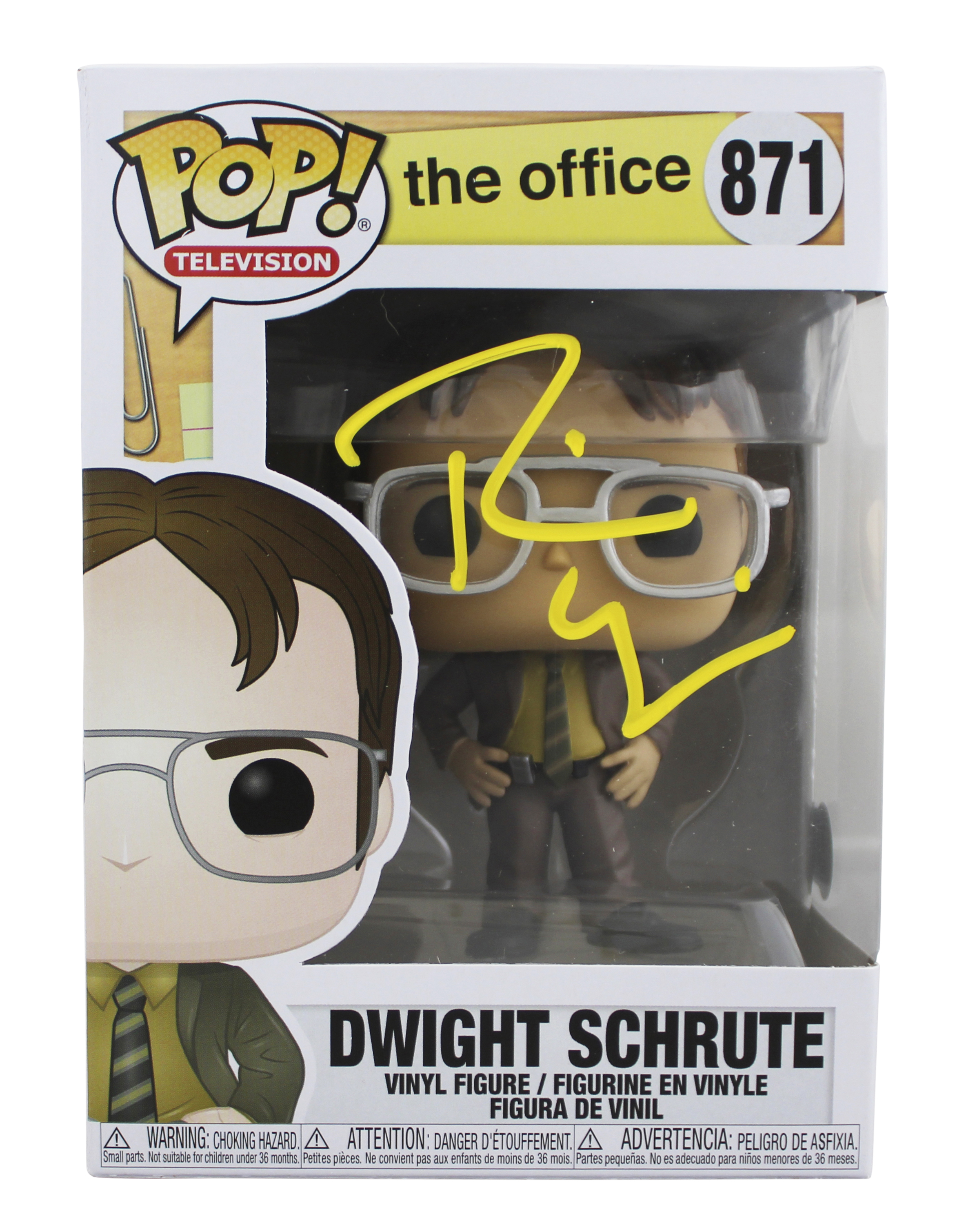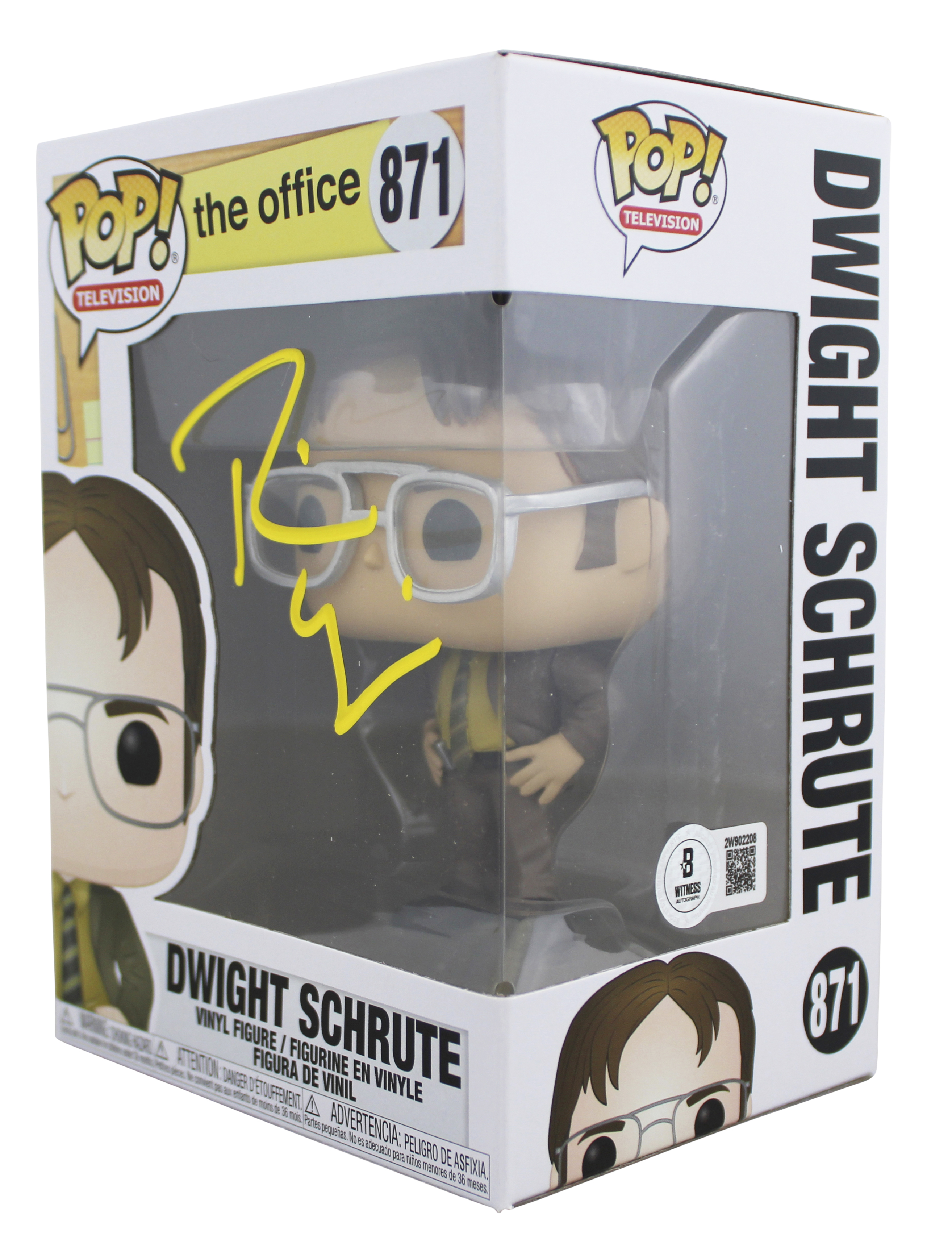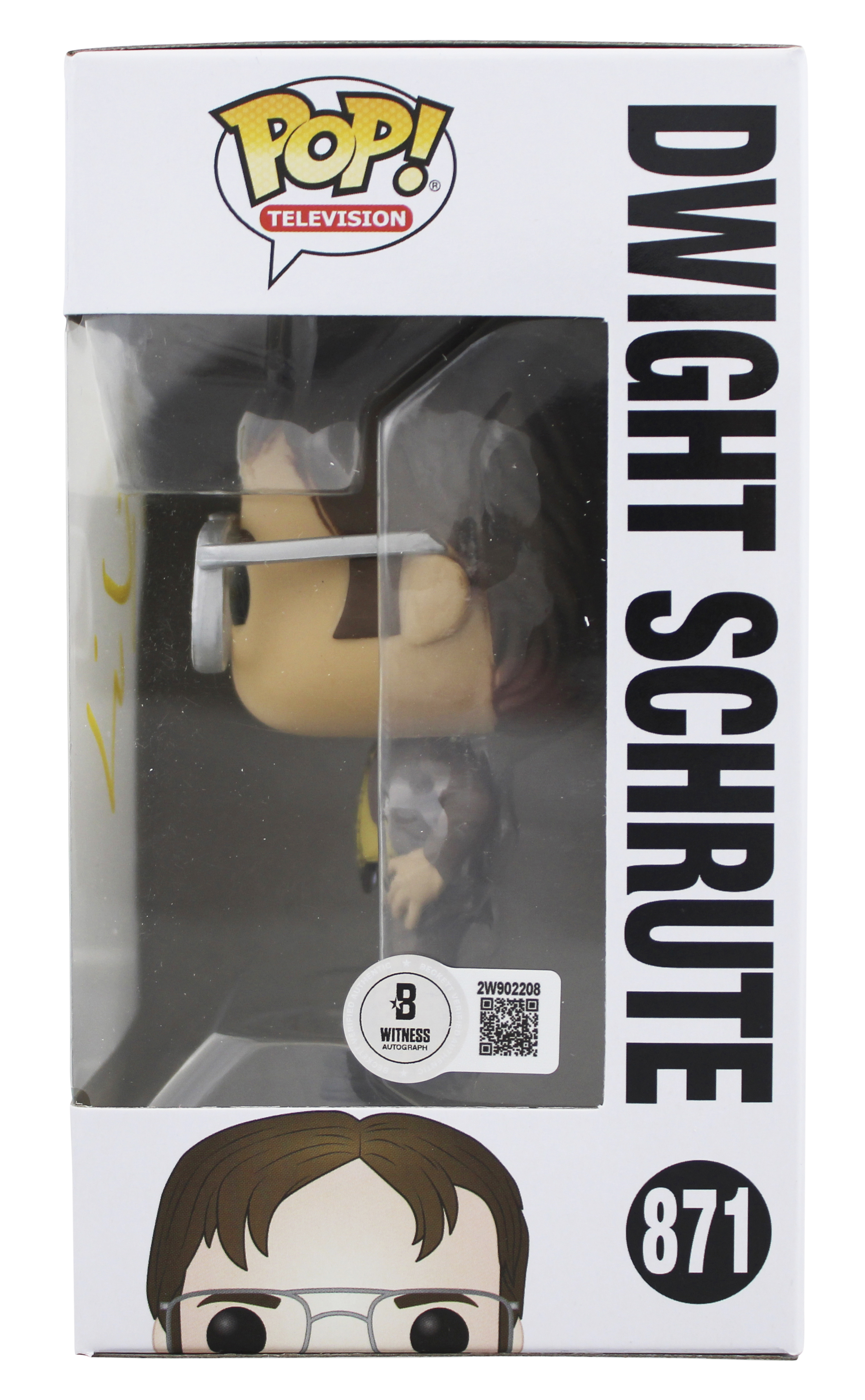 This Autographed w/ Yellow Signature Dwight Schrute #871 Funko Pop Vinyl Figure has been Personally Signed by Rainn Wilson of The Office. This item is 100% Authentic to include a hologram by Beckett Authentication Services. This item will come with an affixed Beckett Authentication Services (BAS) authentication sticker, which includes a scannable QR code to verify authenticity. Please note that Beckett no longer provides serial-numbered COA cards, and the attached BAS sticker will serve as the complete authentication for this item. This is a BAS Witnessed Protection Program item which means a Beckett Authentication Service representative was present when this item was being signed. We have multiples of this same item. While the photographs are representative of this item, the size, placement and strength of the signature may vary. Each item is hand signed, therefore, each autograph is unique. This item will ship in a Pop! Protector, please refer to the photos for condition of the item prior to purchase, these are in good condition but would not be considered mint.