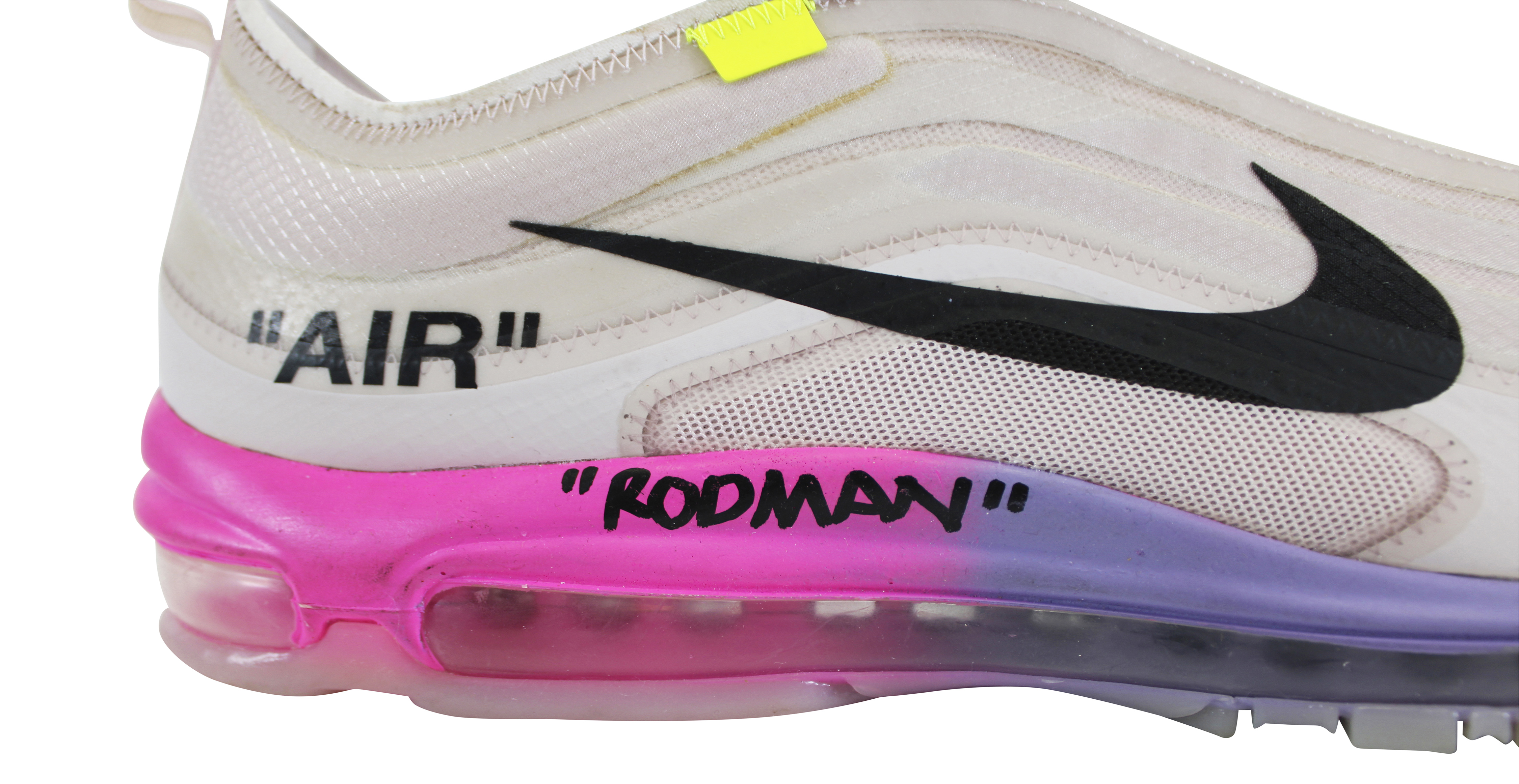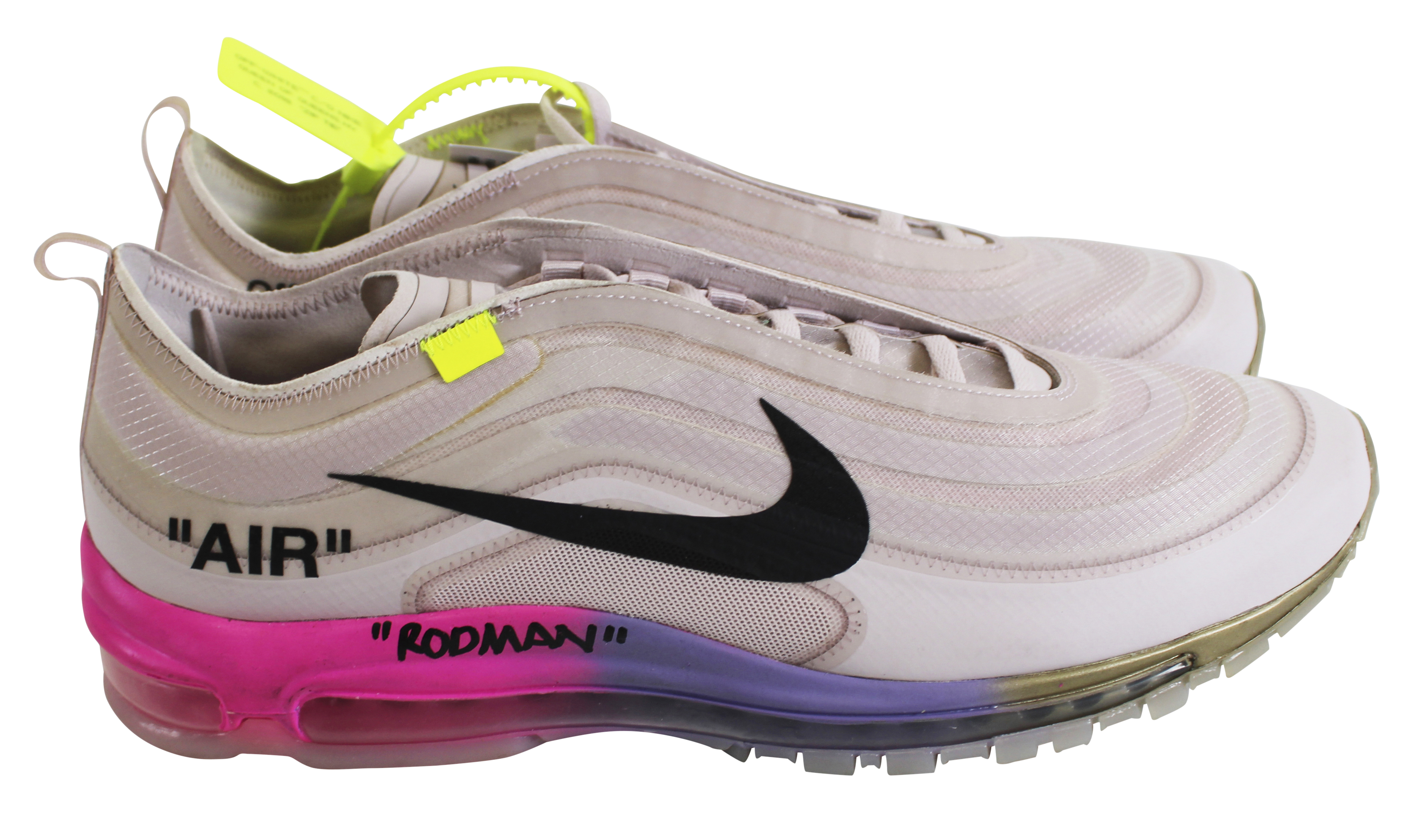 Virgil Abloh Signed 2018 Nike Air Max 97 Off-White "Elemental Rose" Serena Queen ��� Size 15 ��� Beckett COA This ultra-rare Nike Air Max 97 Off-White Serena "Queen" Edition in men���s size 15 were personally signed by legendary designer Virgil Abloh. A part of "The Ten" Off-White x Nike collaboration, this release was made in partnership with tennis icon Serena Williams. Featuring the distinctive Elemental Rose, Black, Barely Rose, and White colorway, along with signature Off-White branding, printed text on the instep, and the signature Volt Zip Tie. Each shoe has an inscription of either "Virgil @2020" or "Rodman" in black marker. This pair is 100% authentic, includes a Beckett Authentication Services Letter of Authenticity (COA) and tamper-proof hologram. Light wear present. Authentication details can be verified online.