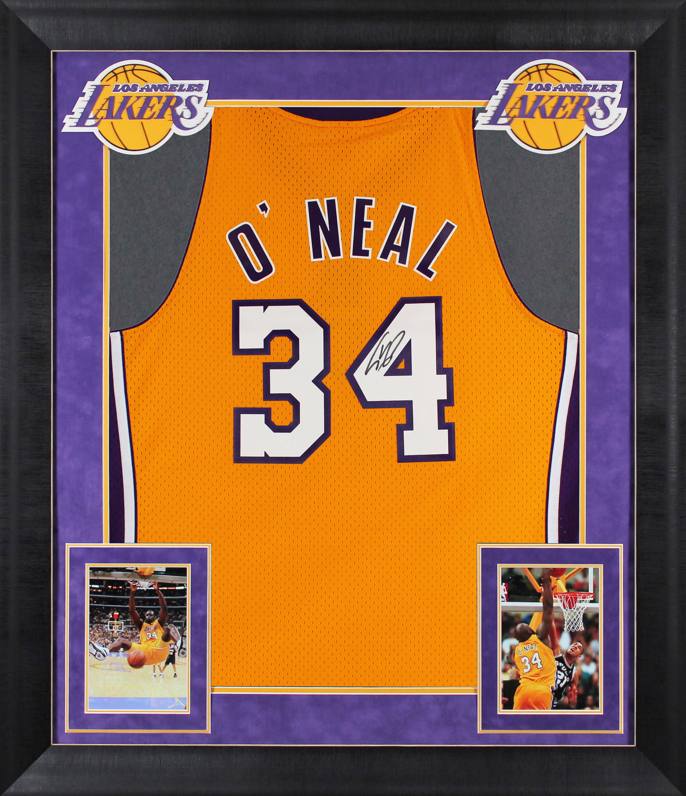 This Autographed Yellow Mitchell & Ness 1999-2000 Throwback Hardwood Classics Swingman Framed Jersey has been Personally Signed by Shaquille O'Neal of the Los Angeles Lakers. This item is 100% Authentic to include a hologram by Beckett Authentication Services. This item will come with an affixed Beckett Authentication Services (BAS) authentication sticker, which includes a scannable QR code to verify authenticity. Please note that Beckett no longer provides serial-numbered COA cards, and the attached BAS sticker will serve as the complete authentication for this item. This is a BAS Witnessed Protection Program item which means a Beckett Authentication Service representative was present when this item was being signed. We conducted an autograph signing with Shaquille O'Neal where multiples of the same item were signed. While the photographs are representative of this item, the size, placement and strength of the signature may vary. Each item is hand signed, therefore, each autograph is unique. This item can be verified through BAS Witnessed. This item has been professionally framed to overall dimensions of approximately 32 x 37 inches. This jersey will be framed to order, it will take approximately 3-4 business days from purchase date for it to ship.