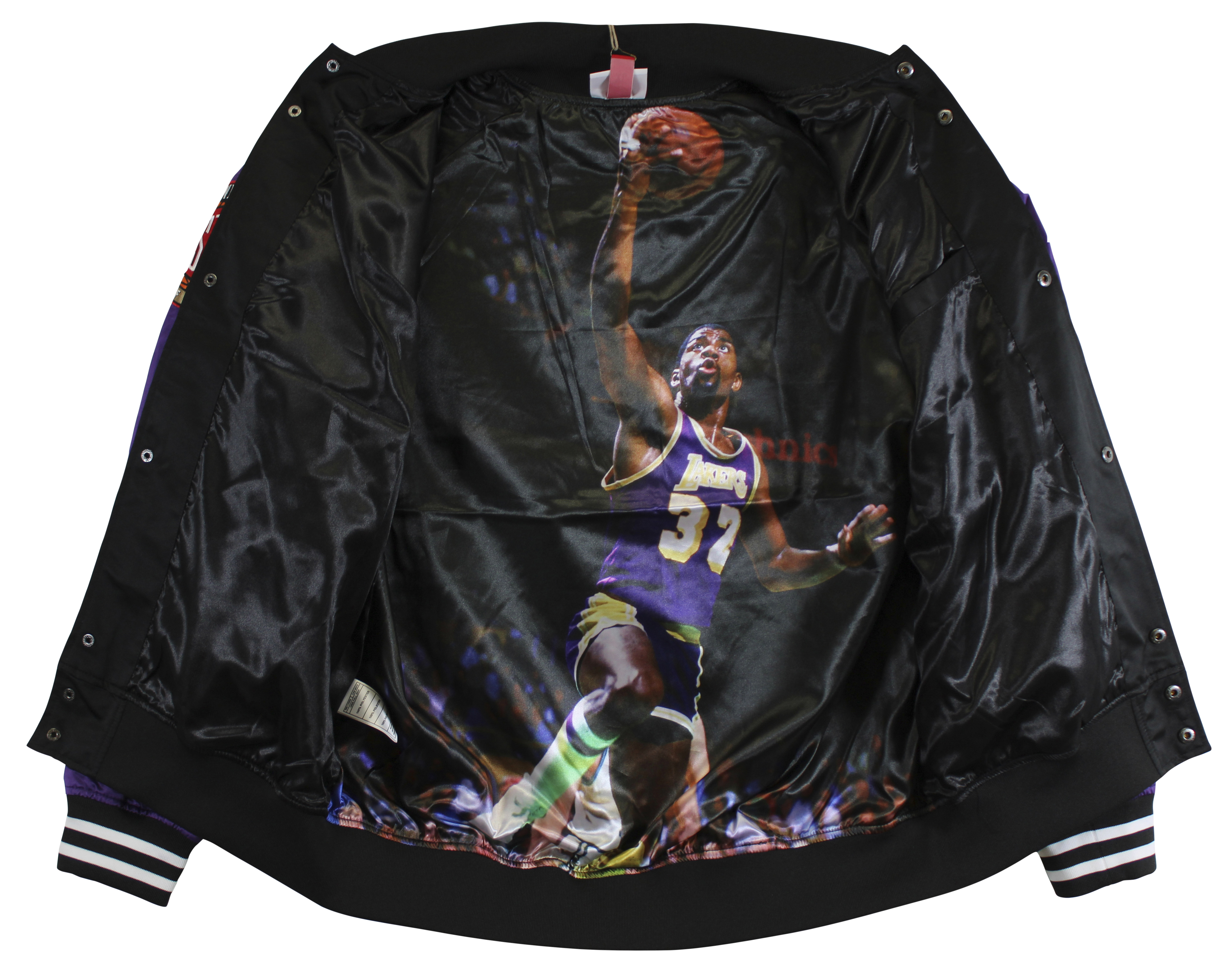 This Autographed w/ Patches Black Mitchell & Ness Warm Up Jacket has been Personally Signed by Magic Johnson of the Los Angeles Lakers. This item is 100% Authentic to include a hologram by Beckett Authentication Services. This item will come with an affixed Beckett Authentication Services (BAS) authentication sticker, which includes a scannable QR code to verify authenticity. Please note that Beckett no longer provides serial-numbered COA cards, and the attached BAS sticker will serve as the complete authentication for this item. This is a BAS Witnessed Protection Program item which means a Beckett Authentication Service representative was present when this item was being signed. We conducted an autograph signing with Magic Johnson where multiples of the same item were signed. While the photographs are representative of this item, the size, placement and strength of the signature may vary. Each item is hand signed, therefore, each autograph is unique. This item can be verified through BAS Witnessed.