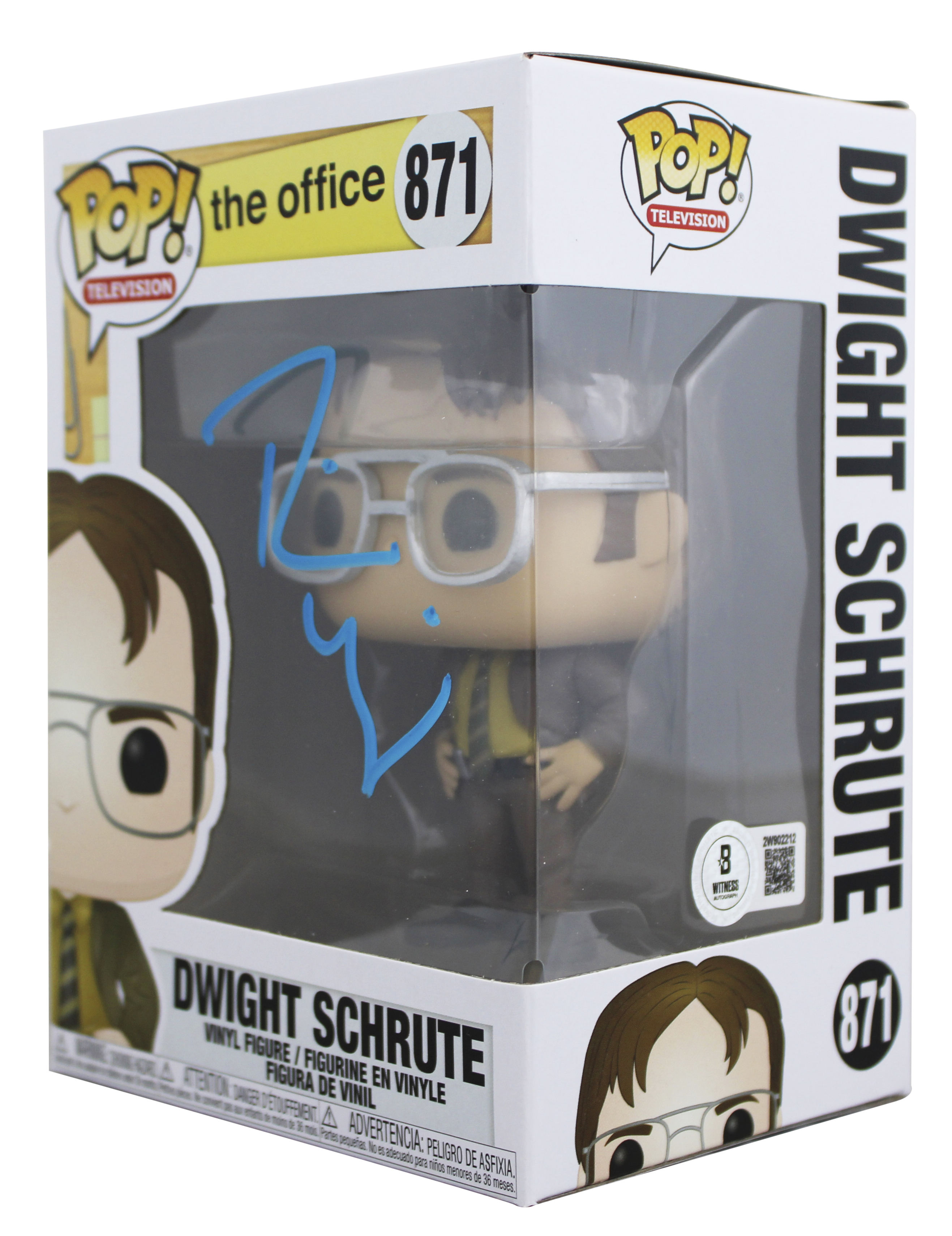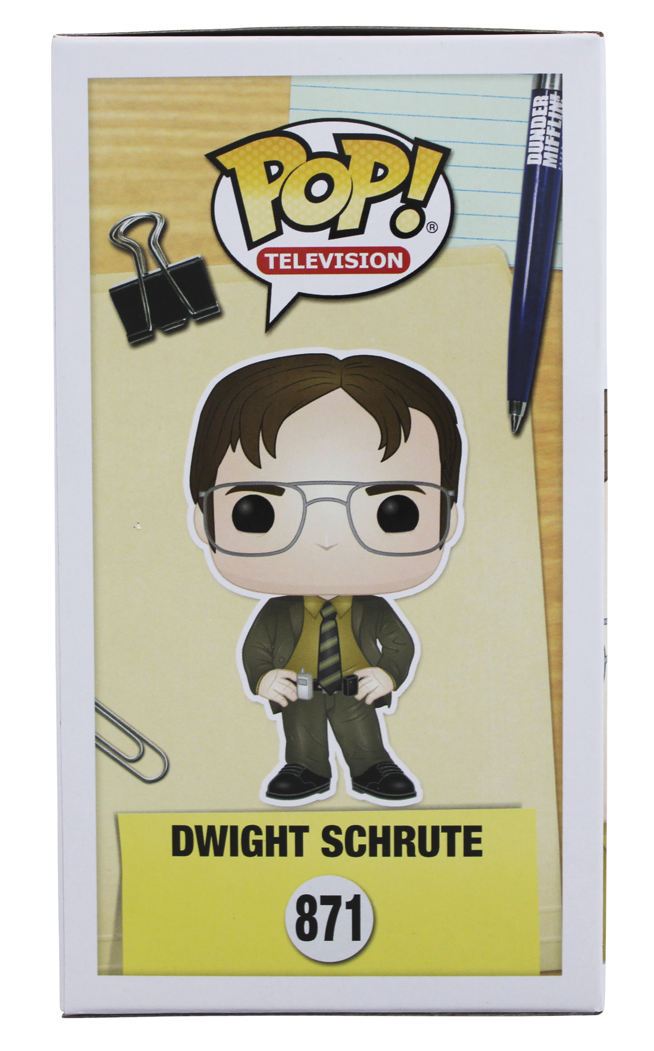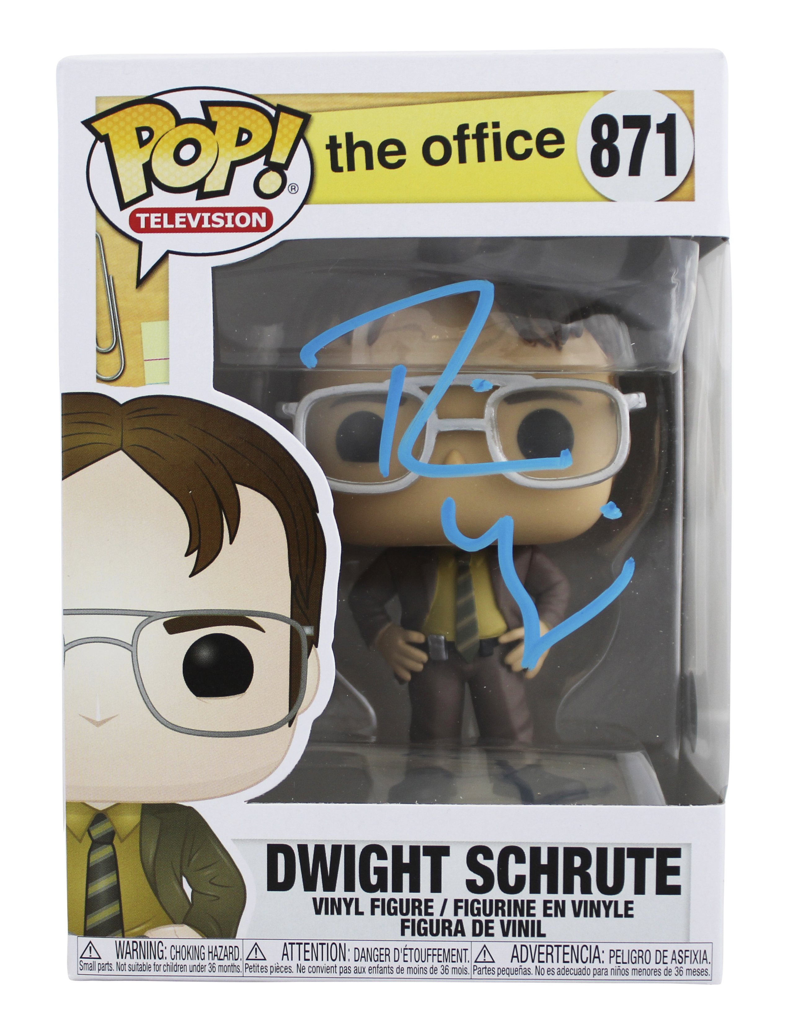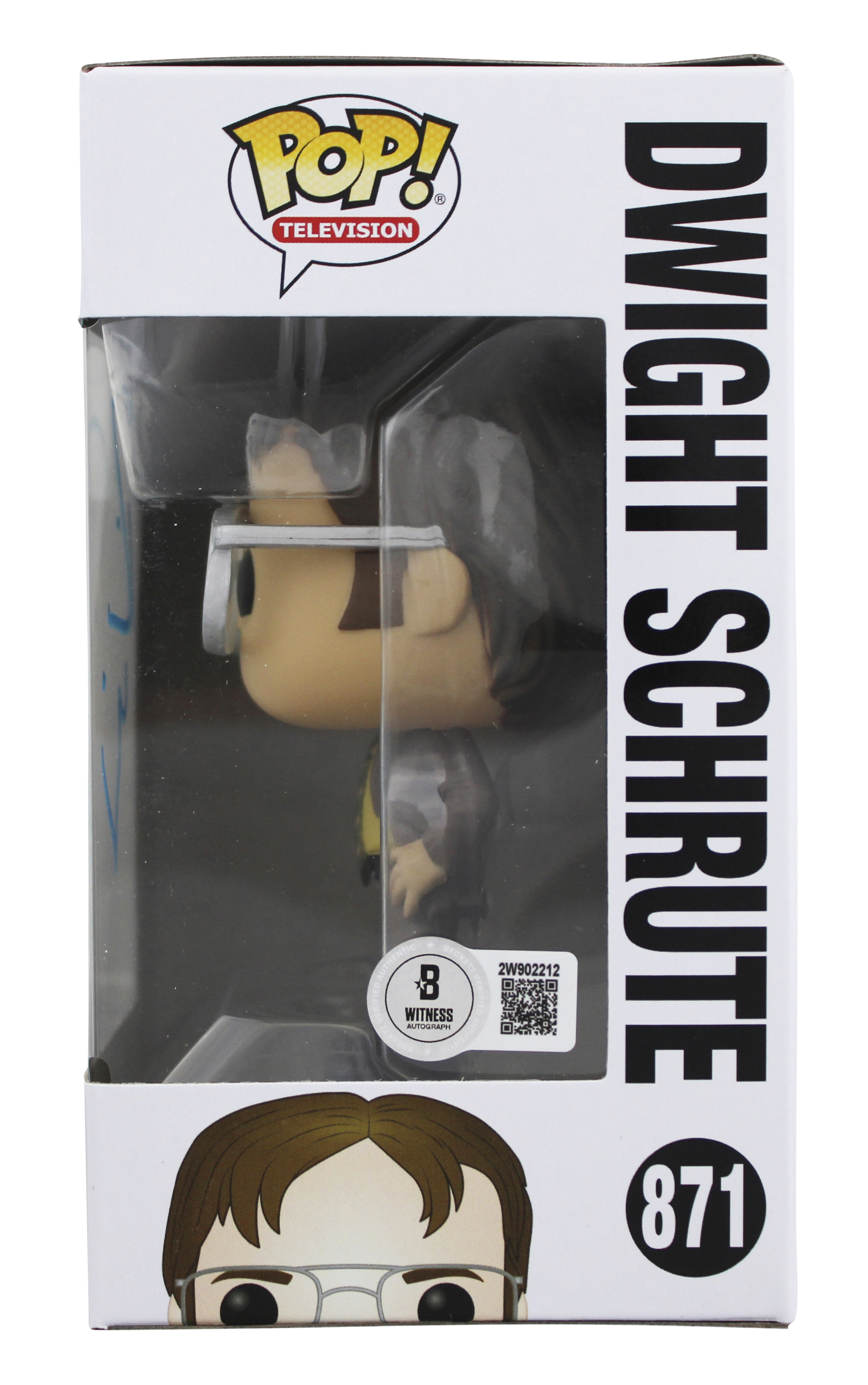 This Autographed w/ Blue Signature Dwight Schrute #871 Funko Pop Vinyl Figure has been Personally Signed by Rainn Wilson of The Office. This item is 100% Authentic to include a hologram by Beckett Authentication Services. This item will come with an affixed Beckett Authentication Services (BAS) authentication sticker, which includes a scannable QR code to verify authenticity. Please note that Beckett no longer provides serial-numbered COA cards, and the attached BAS sticker will serve as the complete authentication for this item. This is a BAS Witnessed Protection Program item which means a Beckett Authentication Service representative was present when this item was being signed. We have multiples of this same item. While the photographs are representative of this item, the size, placement and strength of the signature may vary. Each item is hand signed, therefore, each autograph is unique. This item will ship in a Pop! Protector, please refer to the photos for condition of the item prior to purchase, these are in good condition but would not be considered mint.