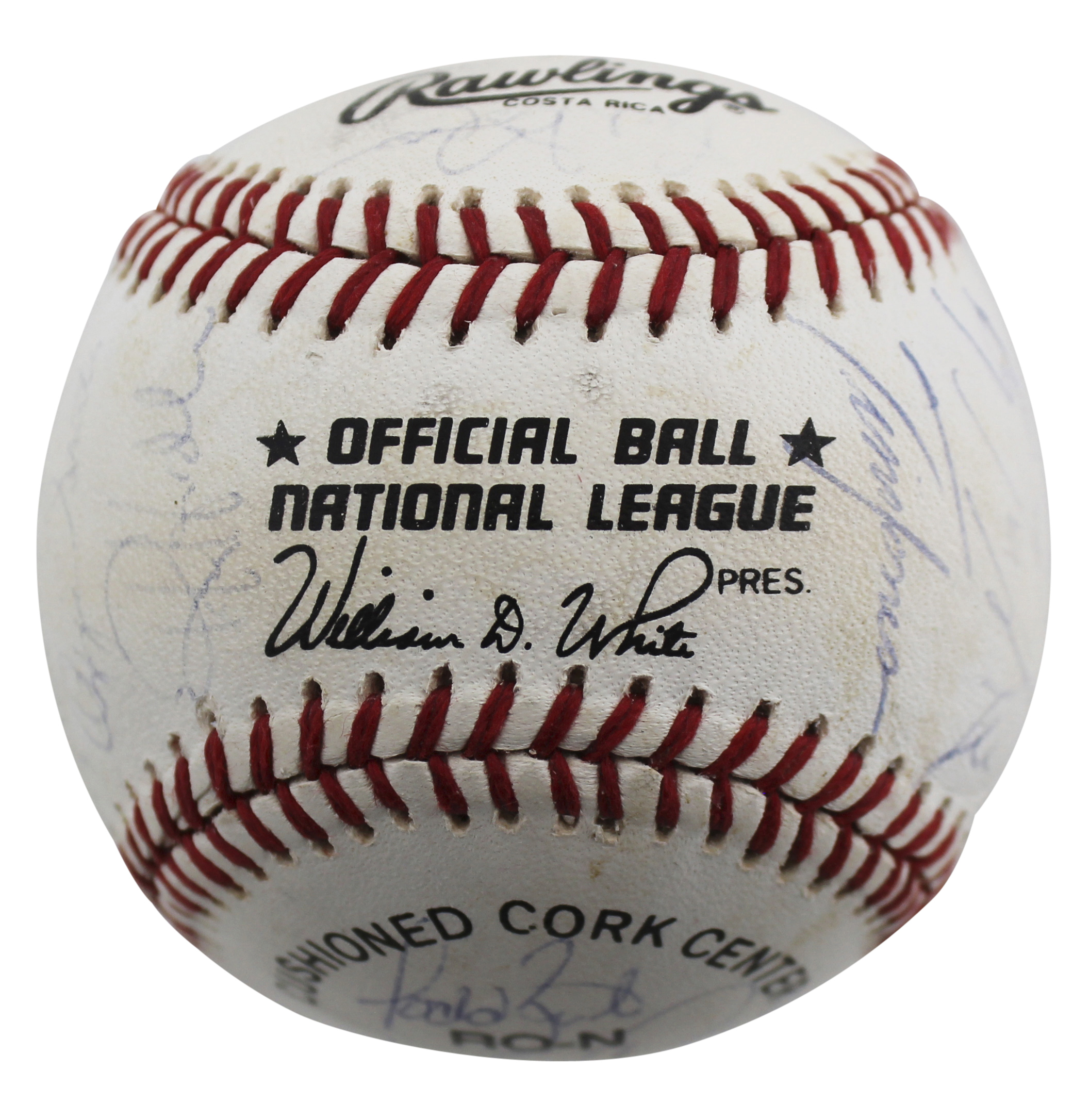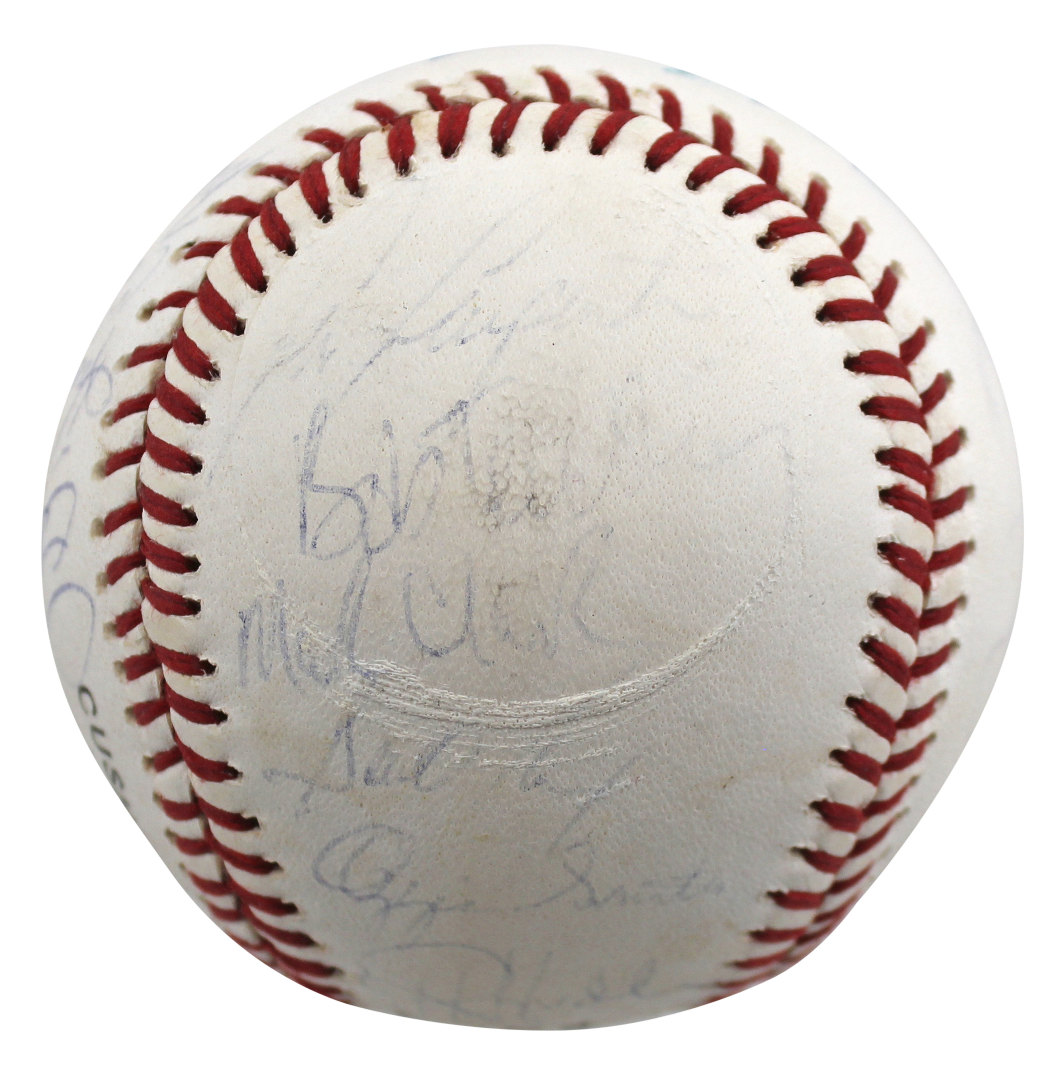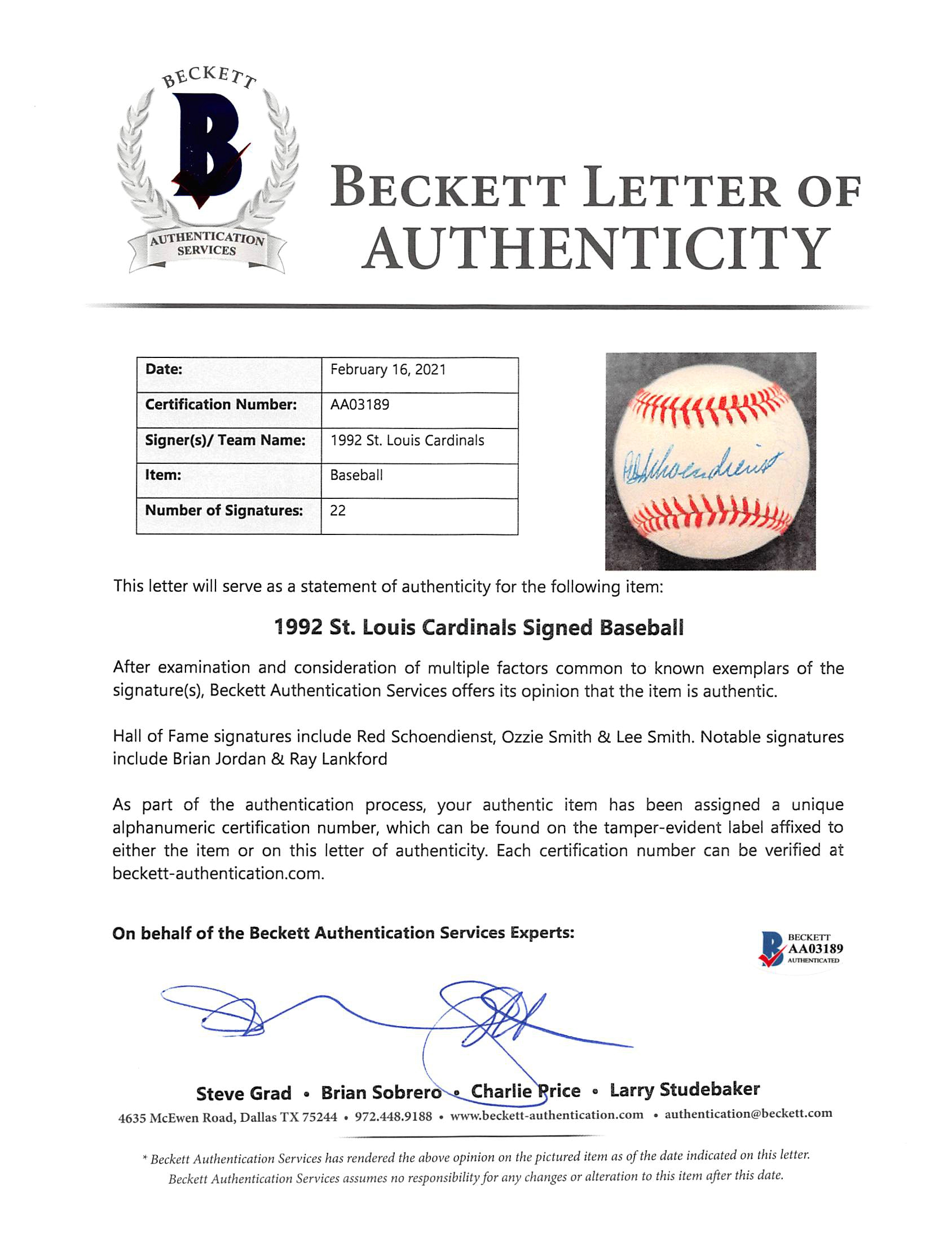 This Autographed William White Onl Baseball has been Personally Signed by Red Schoendienst, Chris Carpenter, Mark Clark, Lee Smith, Bob Tewksbury, Rex Hudler, Tim Jones, Ozzie Smith, Craig Wilson, Todd Zeile, Brian Jordan, Ray Lankford, Milt Thompson & 9 more of the St. Louis Cardinals. This item is 100% Authentic to include a Certificate of Authenticity (COA) / hologram by Beckett Authentication Services. The authenticity can be verified on Beckett Authentication Services website.