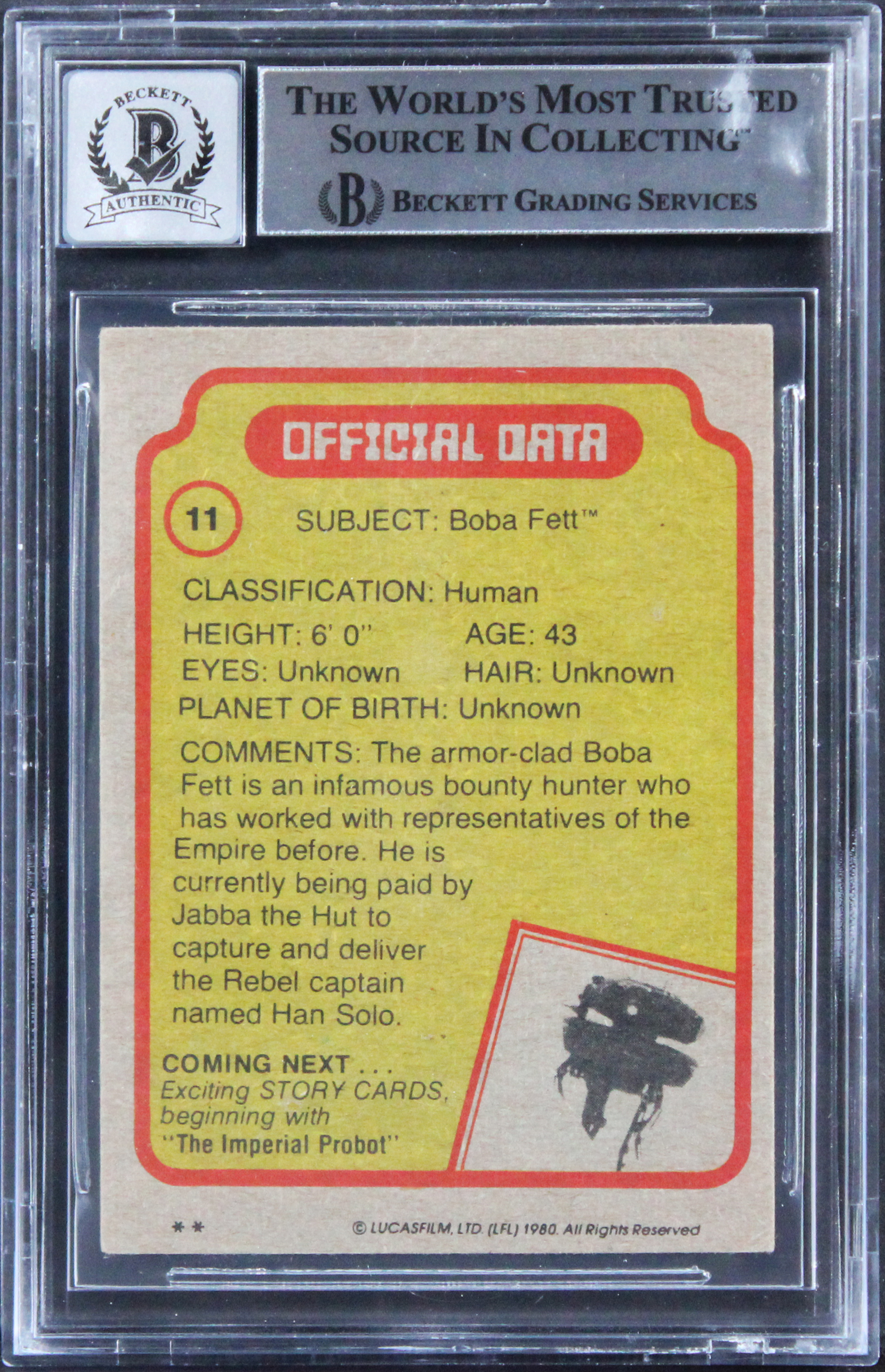 This Autographed 1980 SW Empire Strikes Back #11 Auto Graded Gem Mint 10! Card with the inscription of "Boba's Voice & Boba Fett" has been Personally Signed by Jeremy Bulloch, Jason Wingreen & Sandy Dhuyvetter of Star Wars. This item is 100% Authentic, it comes slabbed and authenticated by Beckett Authentication Services. The authenticity can be verified on Beckett Authentication Services website.