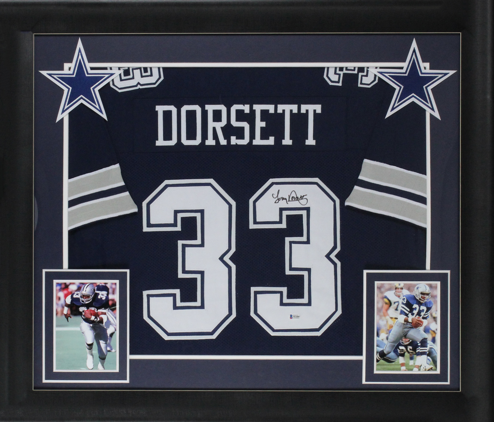 This Autographed Navy Pro Style Framed Jersey has been Personally Signed by Tony Dorsett of the Dallas Cowboys. This item is 100% Authentic to include a Certificate of Authenticity (COA) / hologram by Beckett Authentication Services. This is a BAS Witnessed Protection Program item which means a Beckett Authentication Service representative was present when this item was being signed. This is a stock item. We conducted an autograph signing with Tony Dorsett and we have several of these available. The one you will receive will be of equal quality to the one pictured. This item can be verified through BAS Witnessed. This item has been professionally framed to overall dimensions of approximately 32 x 37 inches. This is a X-Large sized, non-branded, custom-stitched Framed Jersey.