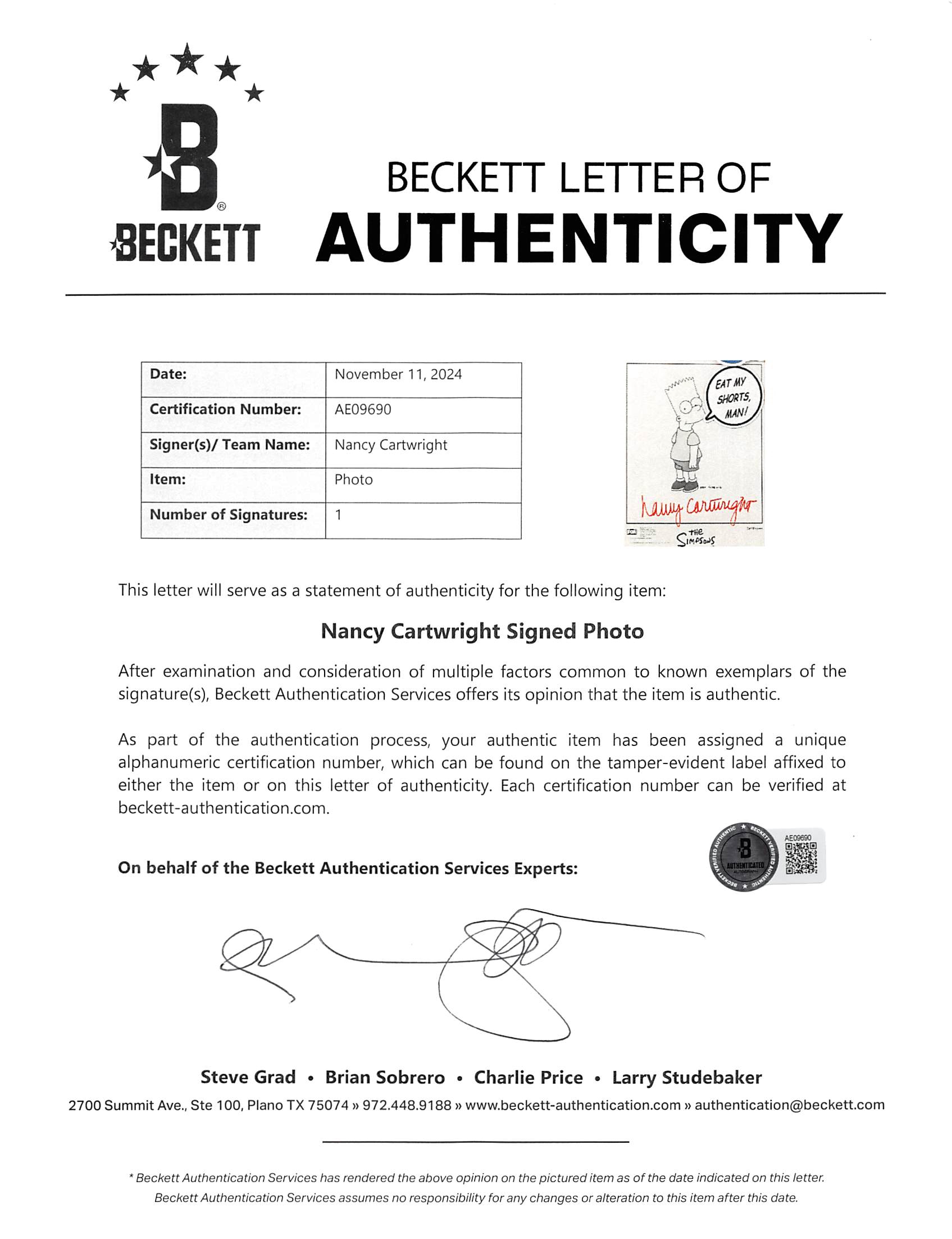 This Autographed Bart Simpson 8x10 Framed Photo has been Personally Signed by Nancy Cartwright of The Simpsons. This item is 100% Authentic to include a Certificate of Authenticity (COA) / hologram by Beckett Authentication Services. We have multiples of this same item. While the photographs are representative of this item, the size, placement and strength of the signature may vary. Each item is hand signed, therefore, each autograph is unique. This item has been professionally framed to overall dimensions of approximately 17.5 x 23.5 inches.