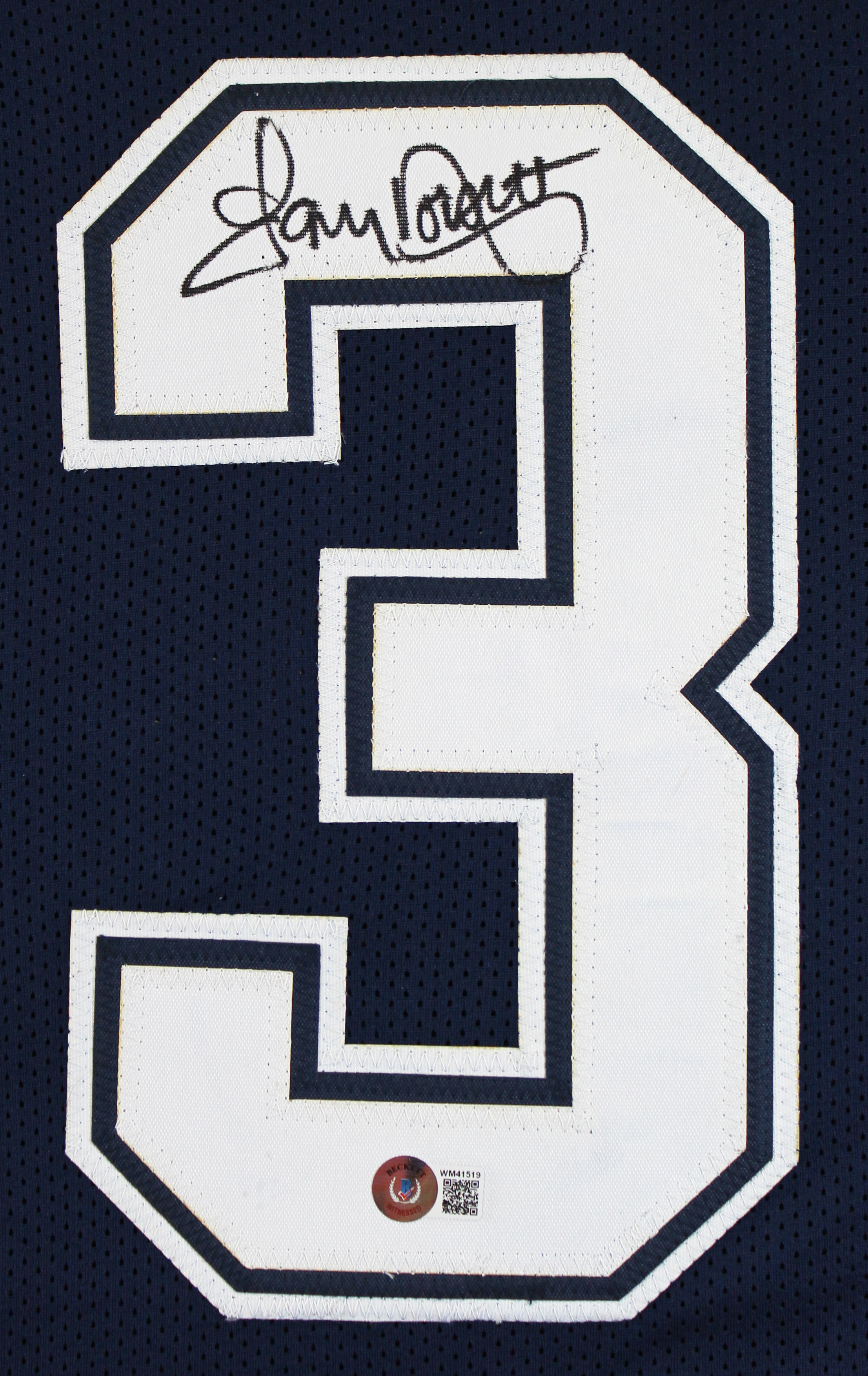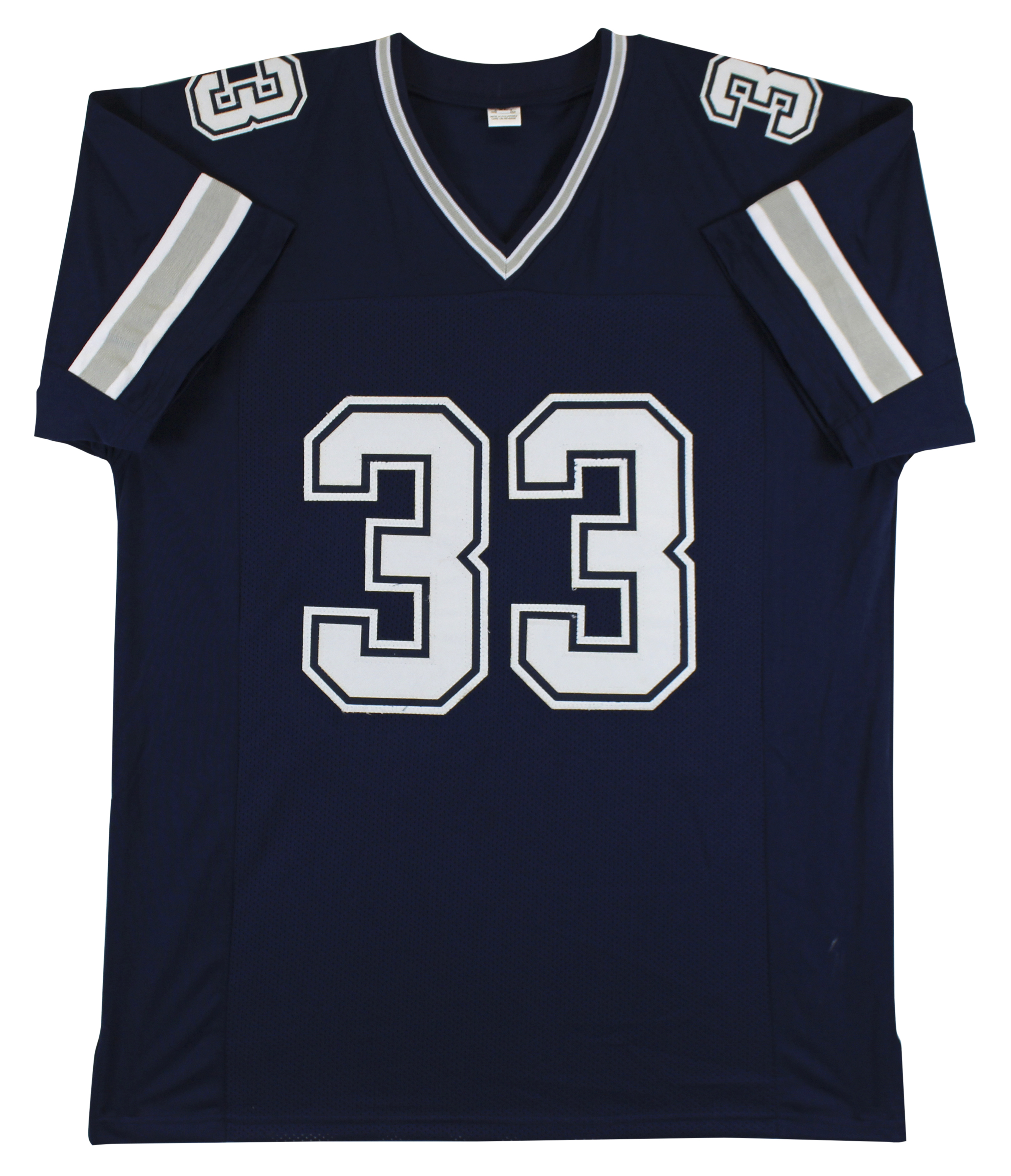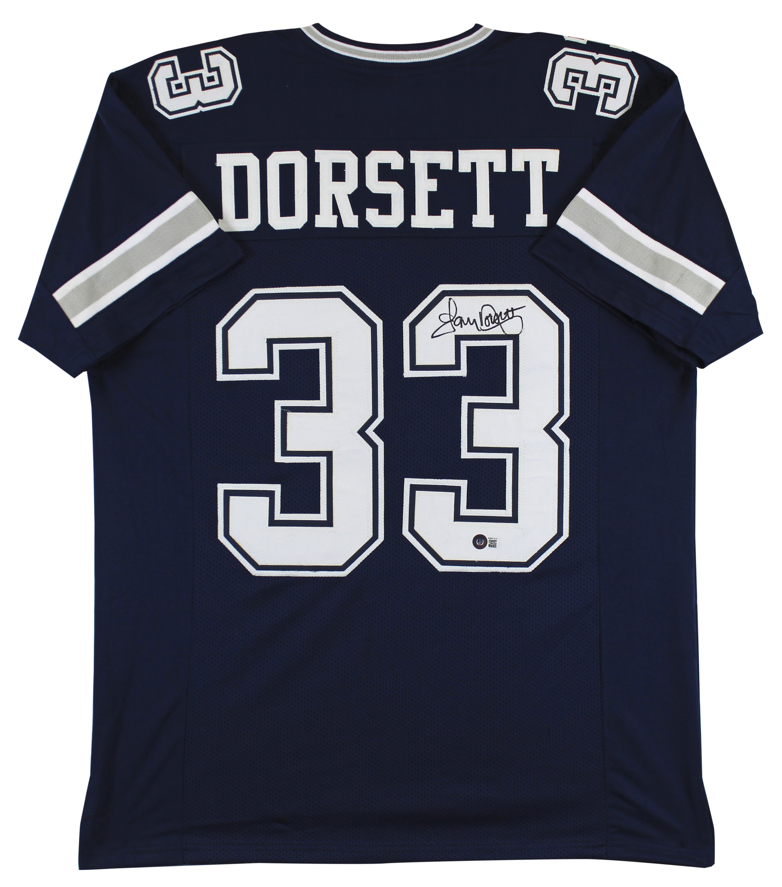 This Autographed Navy Blue Jersey has been Personally Signed by Tony Dorsett of the Dallas Cowboys. This item is 100% Authentic to include a hologram by Beckett Authentication Services. This item may come with the new Beckett Authentication hologram that has a scannable QR code rather than the traditional COA. If you would like to have a COA, you are welcome to reach out to Beckett for a printed certification once you receive your item. This is a BAS Witnessed Protection Program item which means a Beckett Authentication Service representative was present when this item was being signed. This is a stock item. We conducted an autograph signing with Tony Dorsett and we have several of these available. The one you will receive will be of equal quality to the one pictured. This item can be verified through BAS Witnessed. This is a X-Large sized, non-branded, custom-stitched Jersey. Press Pass Collectibles only offers Authentic Autographs by Tony Dorsett through Signings, In-Person Signings or Private Collections to include a 100% money back Lifetime Authenticity Guarantee.