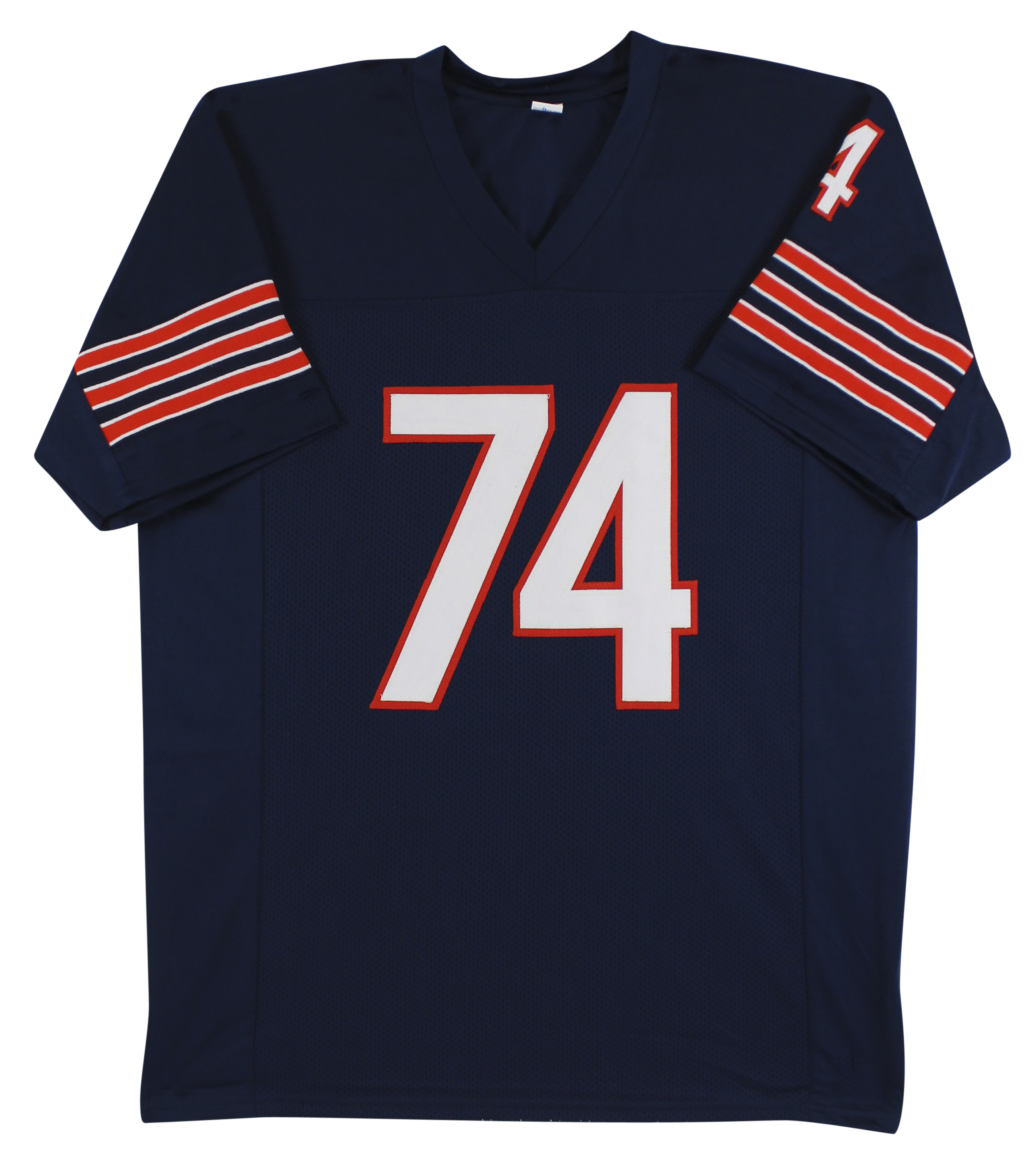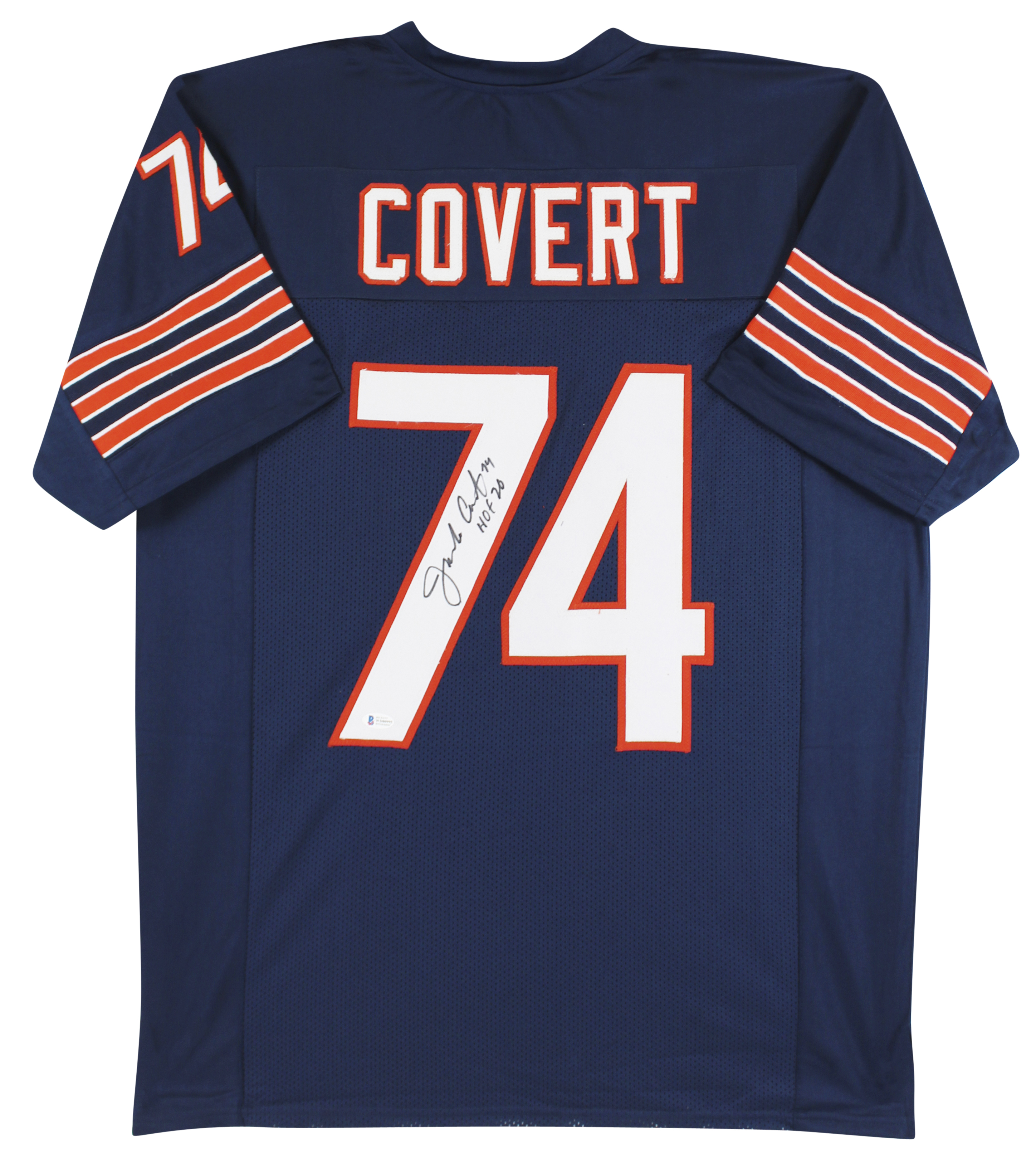 This Autographed Navy Blue Pro Style Jersey with the inscription of "HOF 20" has been Personally Signed by Jim Covert of the Chicago Bears. This item is 100% Authentic to include a Certificate of Authenticity (COA) / hologram by Beckett Authentication Services. This is a BAS Witnessed Protection Program item which means a Beckett Authentication Service representative was present when this item was being signed. This is a stock item. We conducted an autograph signing with Jim Covert and we have several of these available. The one you will receive will be of equal quality to the one pictured. This item can be verified through BAS Witnessed. This is a X-Large sized, non-branded, custom-stitched Jersey.