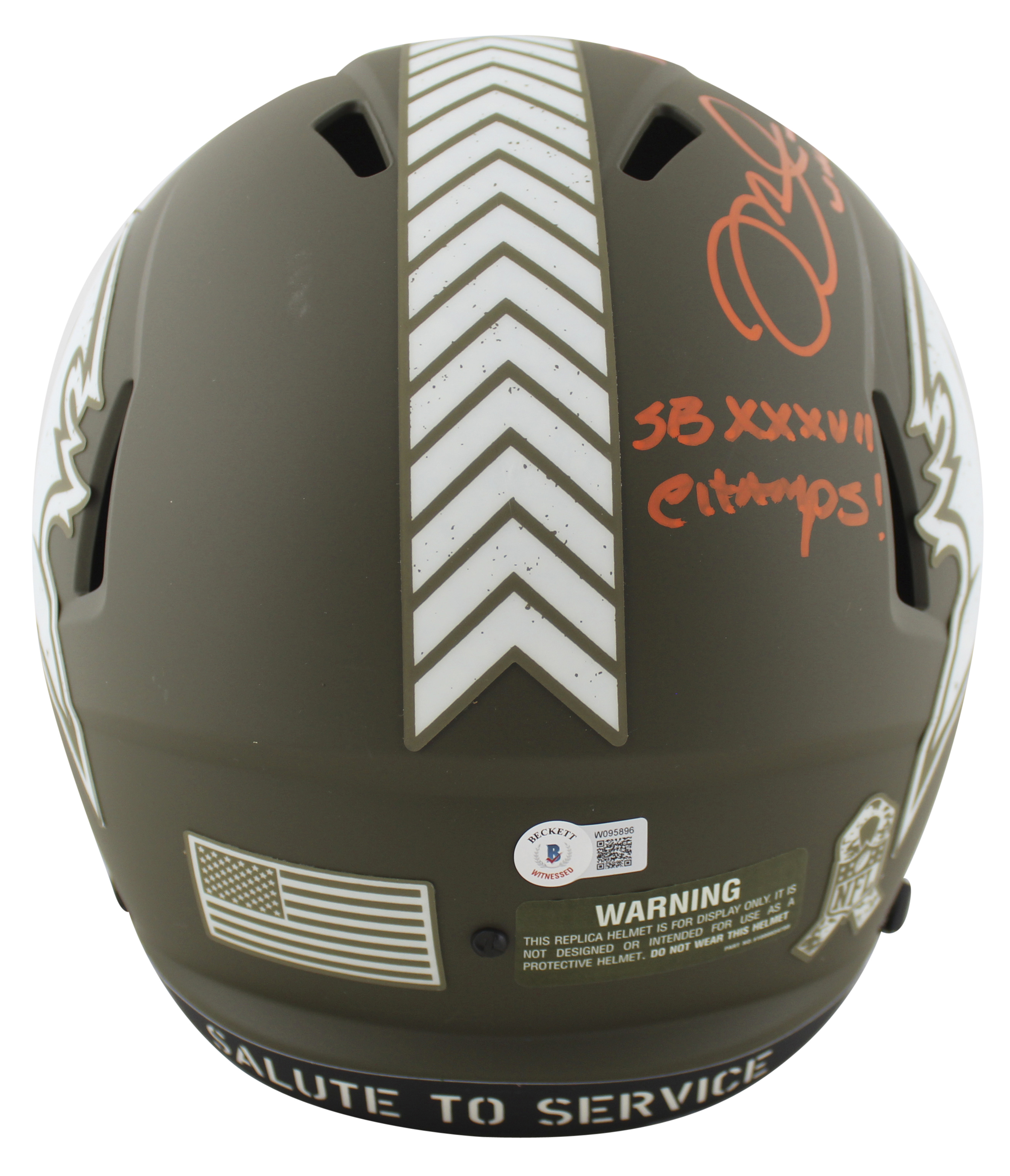 This Autographed Alternate Salute To Service Riddell Full Size Speed Rep Helmet with the inscription of "Fire The Cannons, SB XXXVII Champs, A-Train" has been Personally Signed by Mike Alstott of the Tampa Bay Buccaneers. This item is 100% Authentic to include a Certificate of Authenticity (COA) / hologram by Beckett Authentication Services. This is a BAS Witnessed Protection Program item which means a Beckett Authentication Service representative was present when this item was being signed. We conducted an autograph signing with Mike Alstott where multiples of the same item were signed. While the photographs are representative of this item, the size, placement and strength of the signature may vary. Each item is hand signed, therefore, each autograph is unique. This item can be verified through BAS Witnessed.