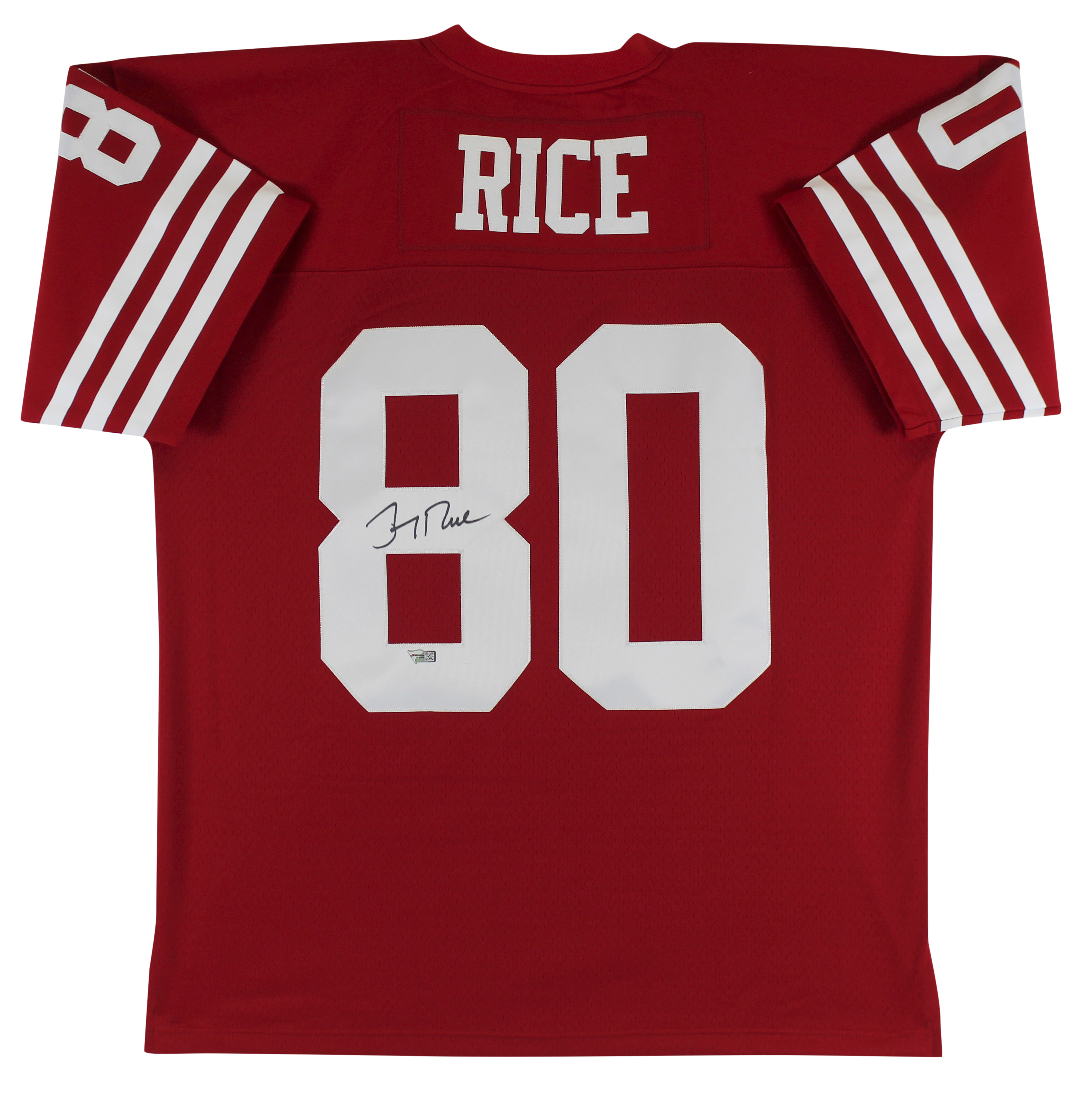 This Autographed Red Mitchell & Ness Jersey has been Personally Signed by Jerry Rice of the San Francisco 49ers. This item is 100% Authentic to includes a numbered hologram by Fanatics. We conducted an autograph signing with Jerry Rice where multiples of the same item were signed. While the photographs are representative of this item, the size, placement and strength of the signature may vary. Each item is hand signed, therefore, each autograph is unique. This item can be verified through Fanatics. This is a X-Large sized Jersey.