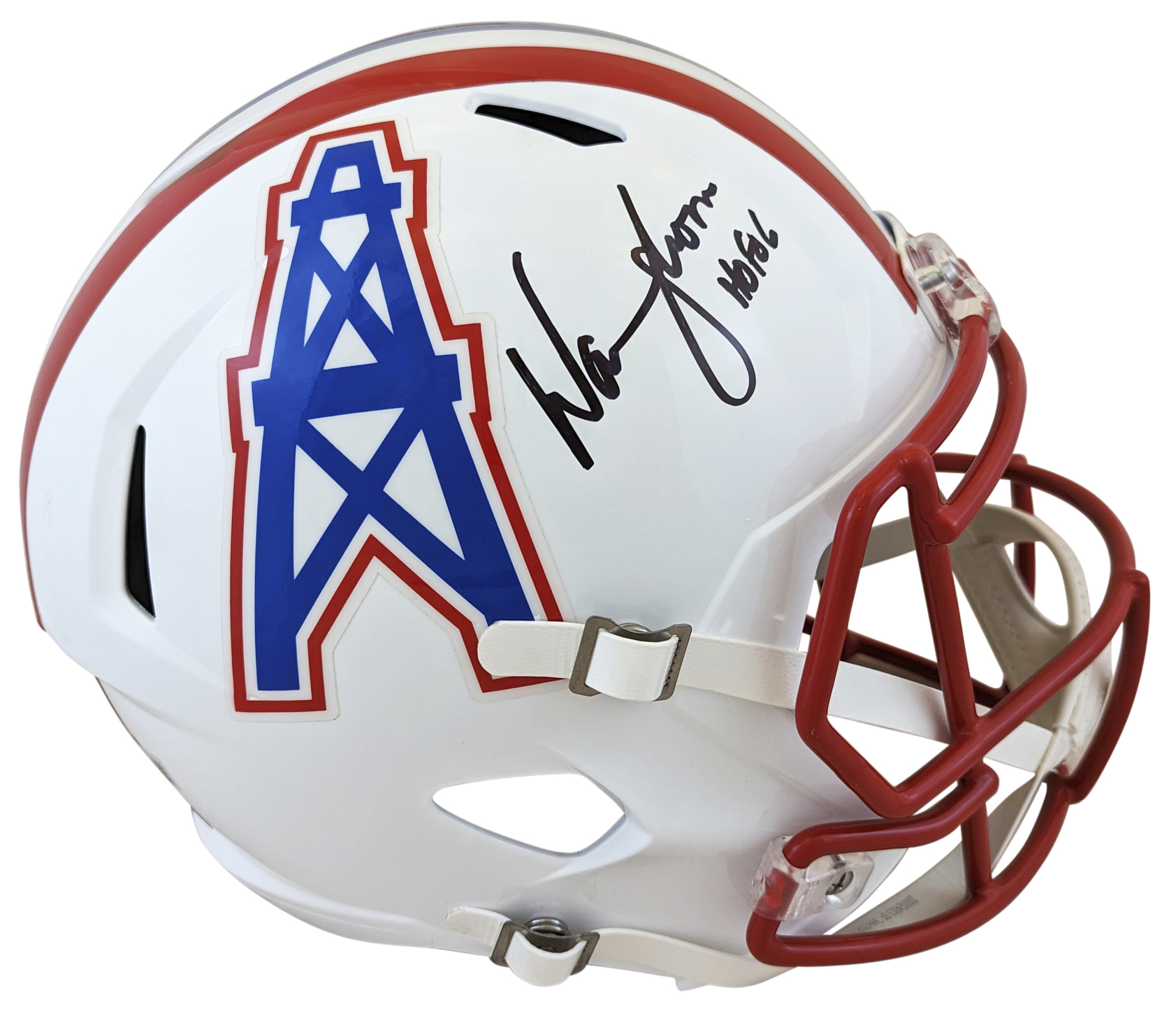 This Autographed 1981-98 Throwback Full Size Speed Rep Helmet with the inscription of "HOF 06" has been Personally Signed by Warren Moon of the Houston Oilers. This item is 100% Authentic to include a hologram by Beckett Authentication Services. This item will come with an affixed Beckett Authentication Services (BAS) authentication sticker, which includes a scannable QR code to verify authenticity. Please note that Beckett no longer provides serial-numbered COA cards, and the attached BAS sticker will serve as the complete authentication for this item. This is a BAS Witnessed Protection Program item which means a Beckett Authentication Service representative was present when this item was being signed. We conducted an autograph signing with Warren Moon where multiples of the same item were signed. While the photographs are representative of this item, the size, placement and strength of the signature may vary. Each item is hand signed, therefore, each autograph is unique. This item can be verified through BAS Witnessed.