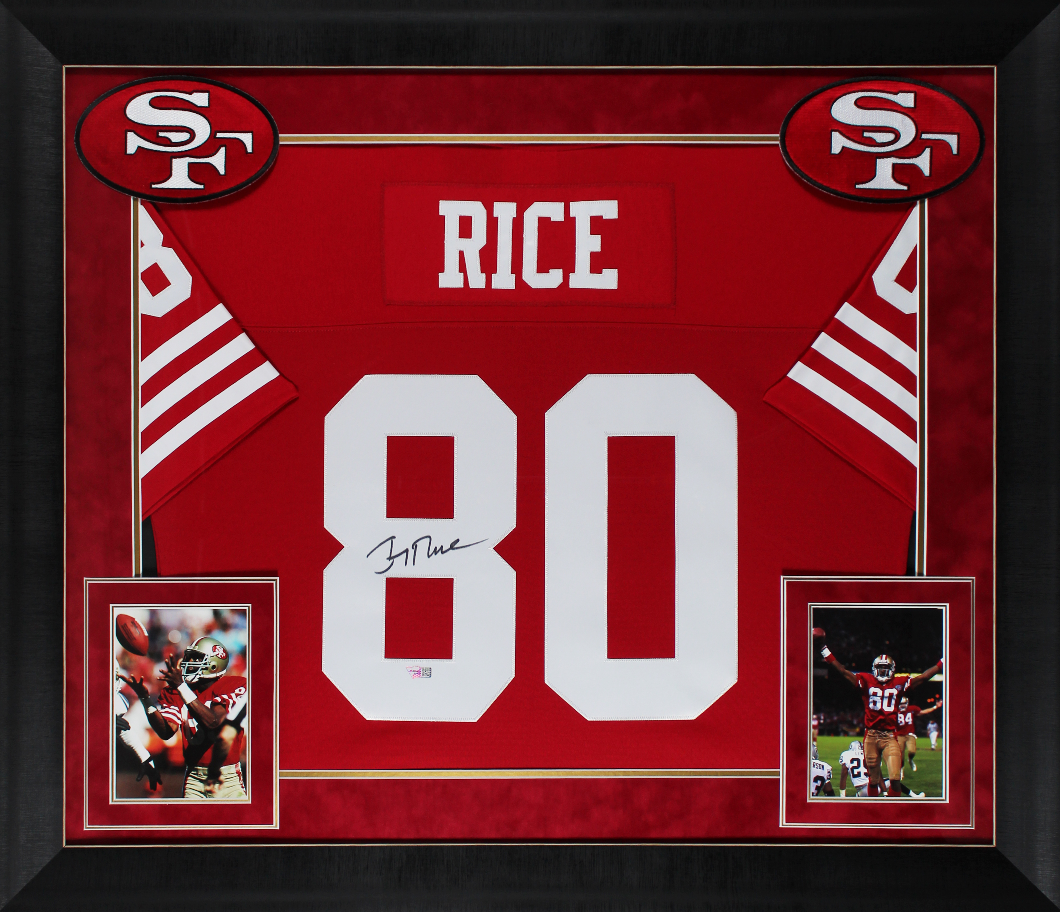 This Autographed Red Mitchell & Ness Framed Jersey has been Personally Signed by Jerry Rice of the San Francisco 49ers. This item is 100% Authentic to includes a numbered hologram by Fanatics. We conducted an autograph signing with Jerry Rice where multiples of the same item were signed. While the photographs are representative of this item, the size, placement and strength of the signature may vary. Each item is hand signed, therefore, each autograph is unique. This item can be verified through Fanatics. This item has been professionally framed to overall dimensions of approximately 32 x 37 inches. This is a X-Large sized Framed Jersey. This jersey will be framed to order, it will take 3-4 days from purchase date for it to ship.