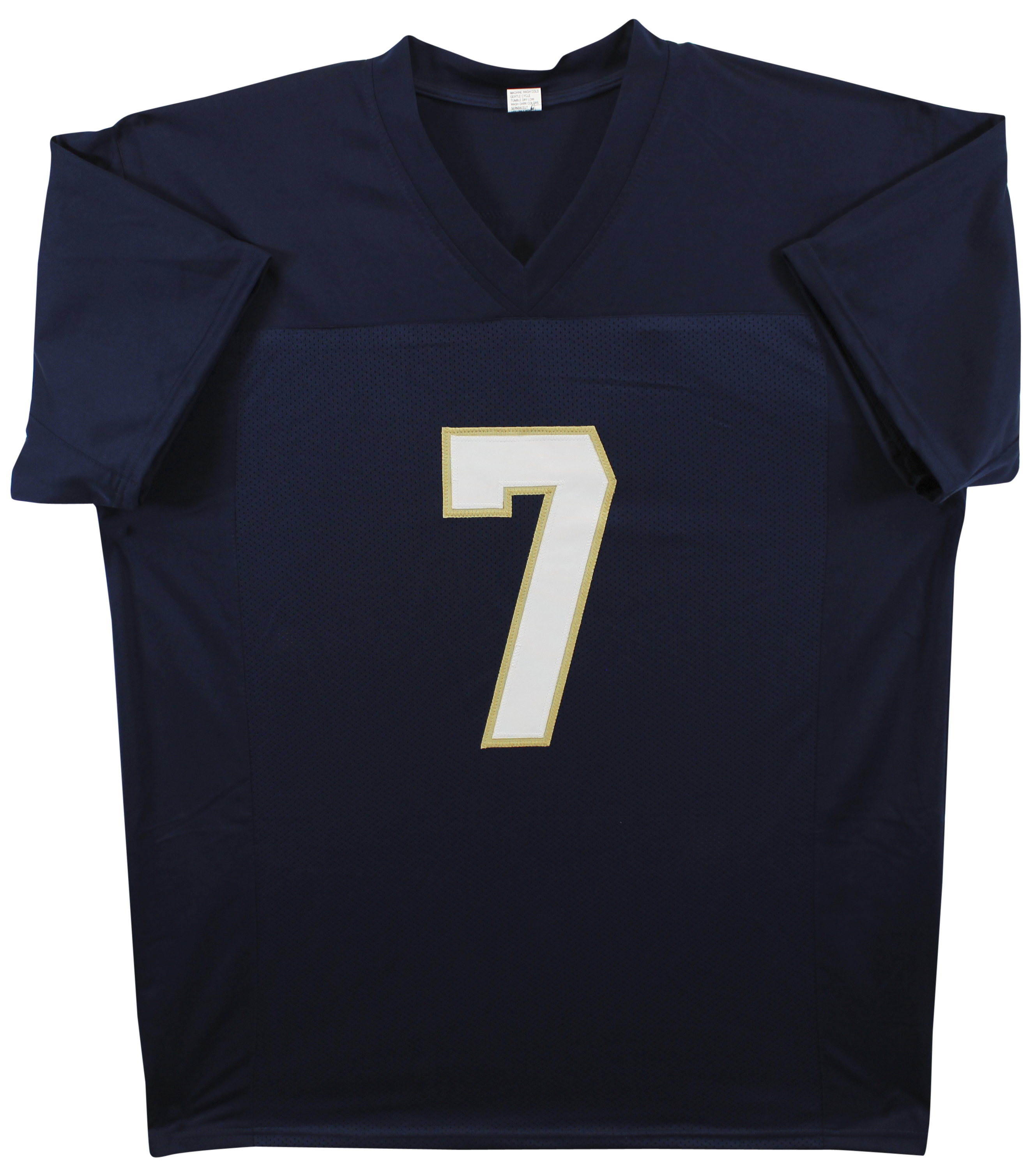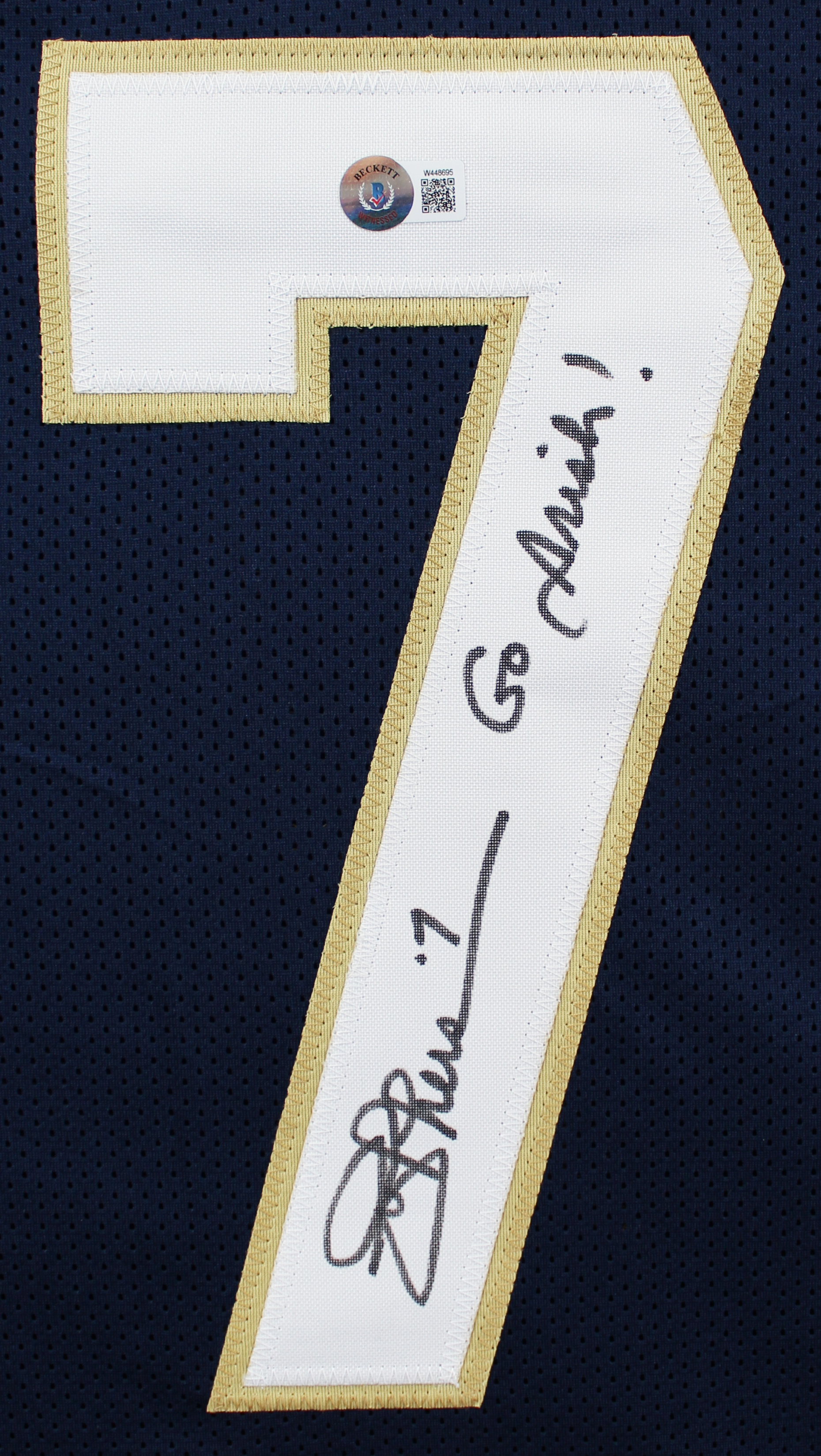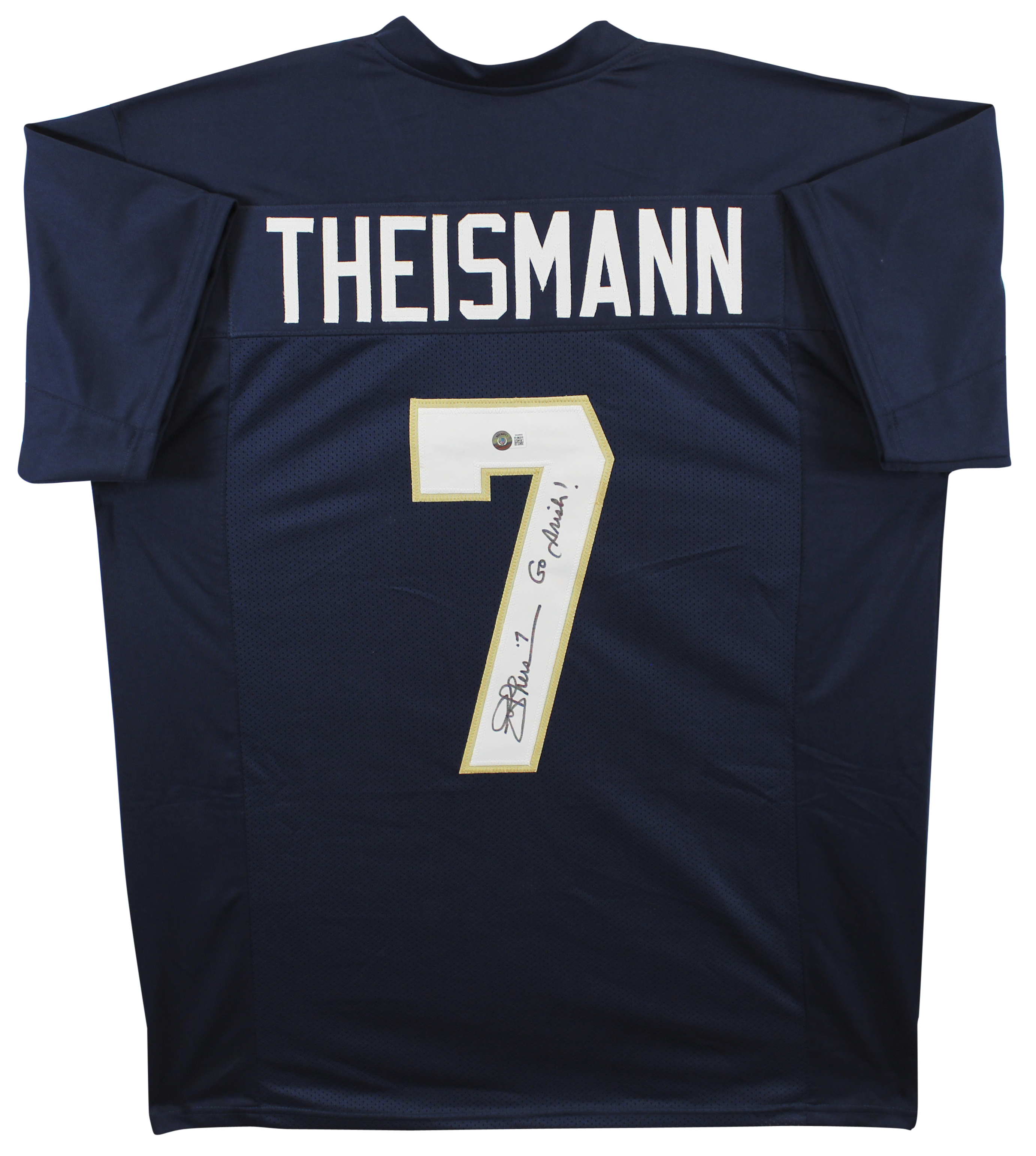 This Autographed Navy Blue Pro Style Jersey with the inscription of "Go Irish!" has been Personally Signed by Joe Theismann of the Notre Dame Fighting Irish. This item is 100% Authentic to include a hologram by Beckett Authentication Services. This item will come with an affixed Beckett Authentication Services (BAS) authentication sticker, which includes a scannable QR code to verify authenticity. Please note that Beckett no longer provides serial-numbered COA cards, and the attached BAS sticker will serve as the complete authentication for this item. This is a BAS Witnessed Protection Program item which means a Beckett Authentication Service representative was present when this item was being signed. We conducted an autograph signing with Joe Theismann where multiples of the same item were signed. While the photographs are representative of this item, the size, placement and strength of the signature may vary. Each item is hand signed, therefore, each autograph is unique. This item can be verified through BAS Witnessed. This is a X-Large sized, non-branded, custom-stitched Jersey.