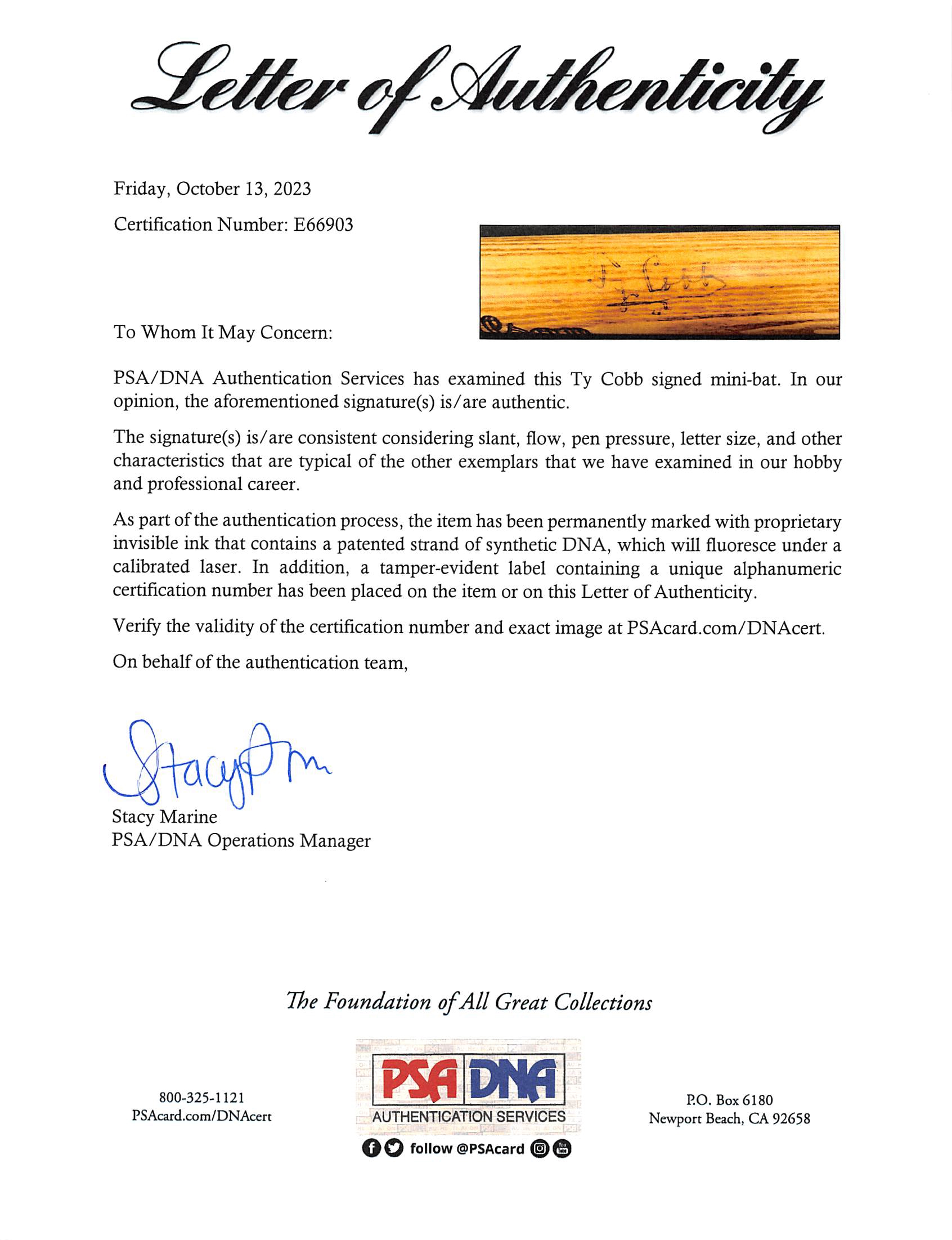 This Autographed 21 Inch Miniature Wilson Baseball Bat has been Personally Signed by Ty Cobb of the Detroit Tigers. This item is 100% Authentic and comes with a PSA/DNA Certification Card and a matching numbered Hologram. The authenticity can be verified on Professional Sports Authenticator website.