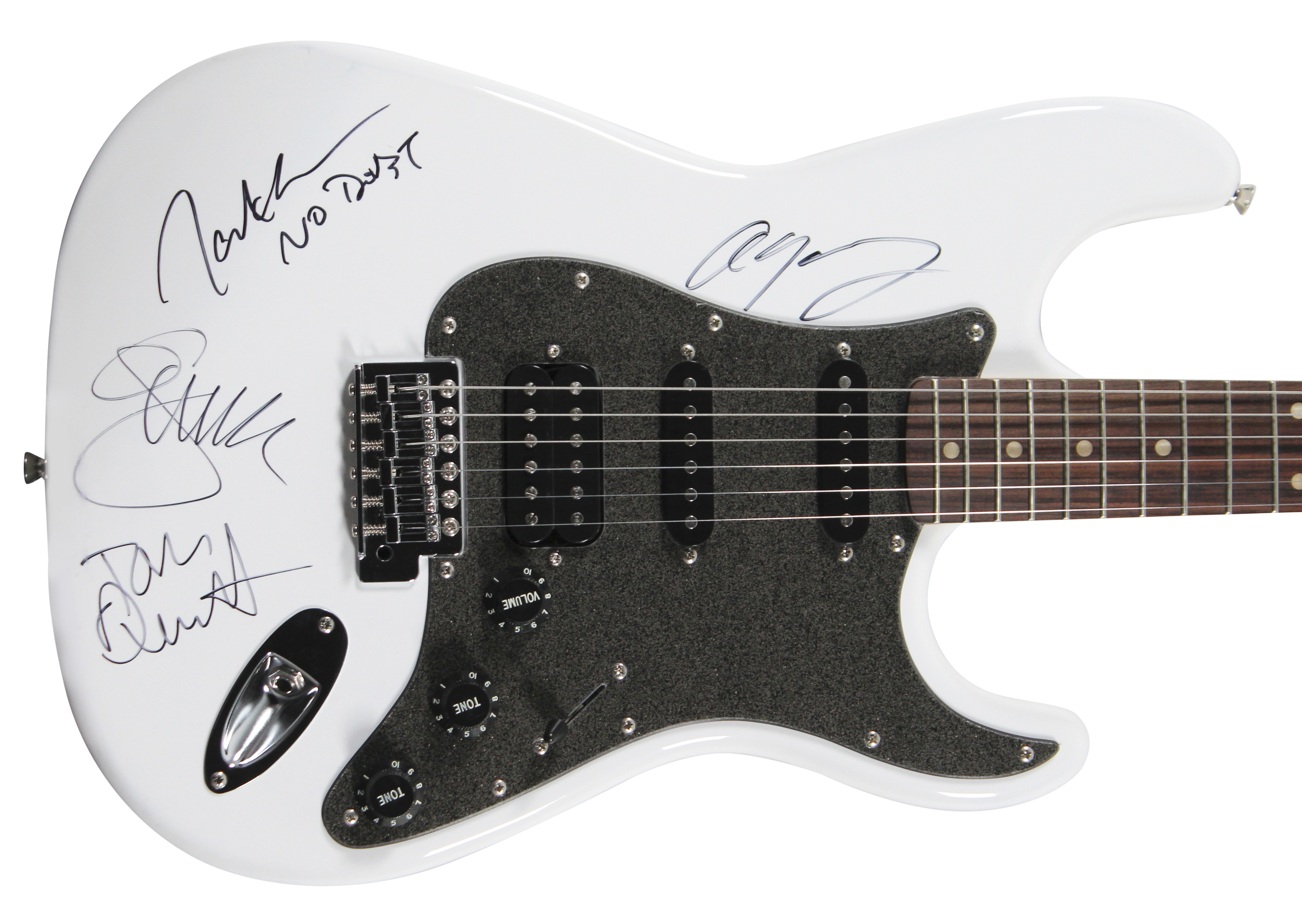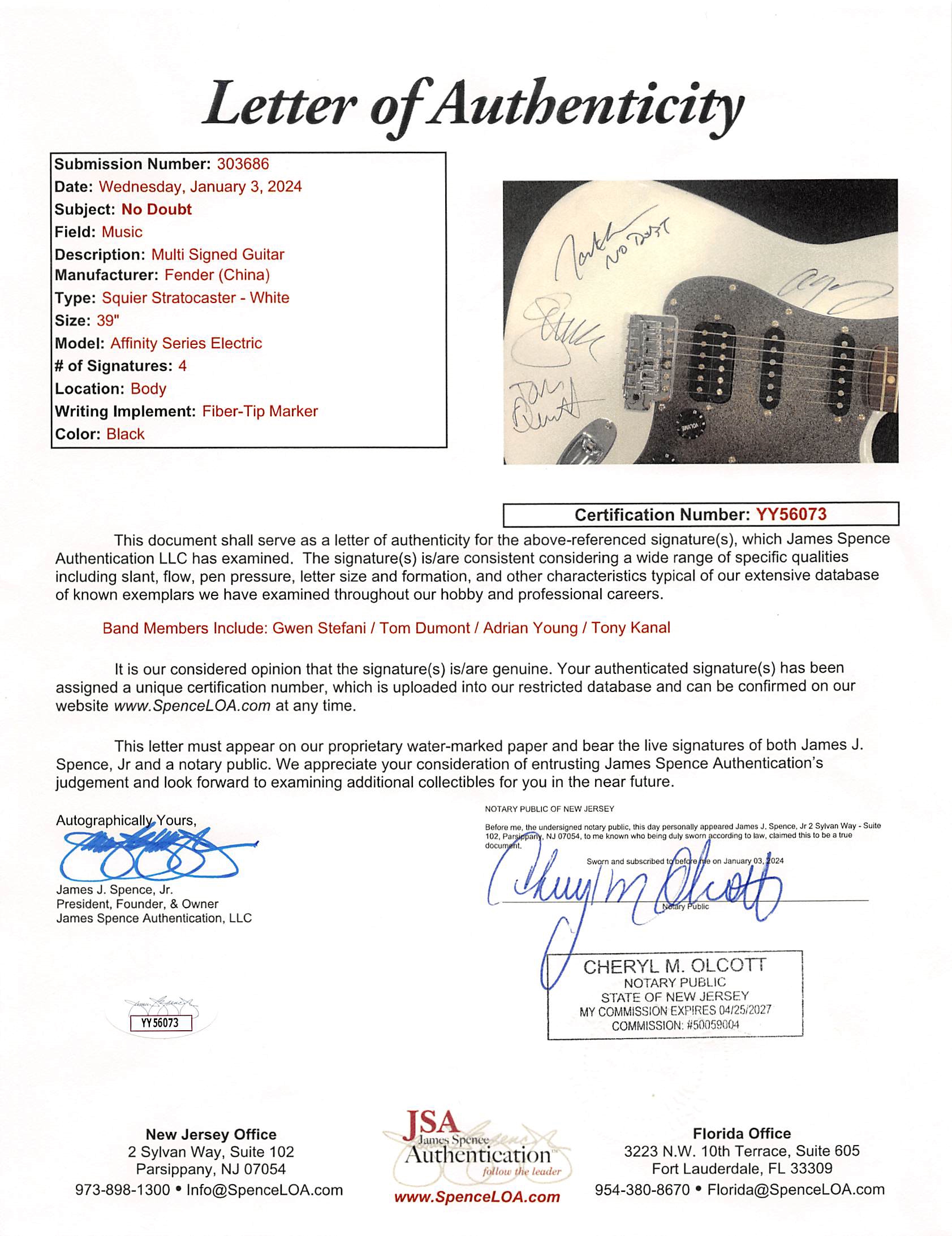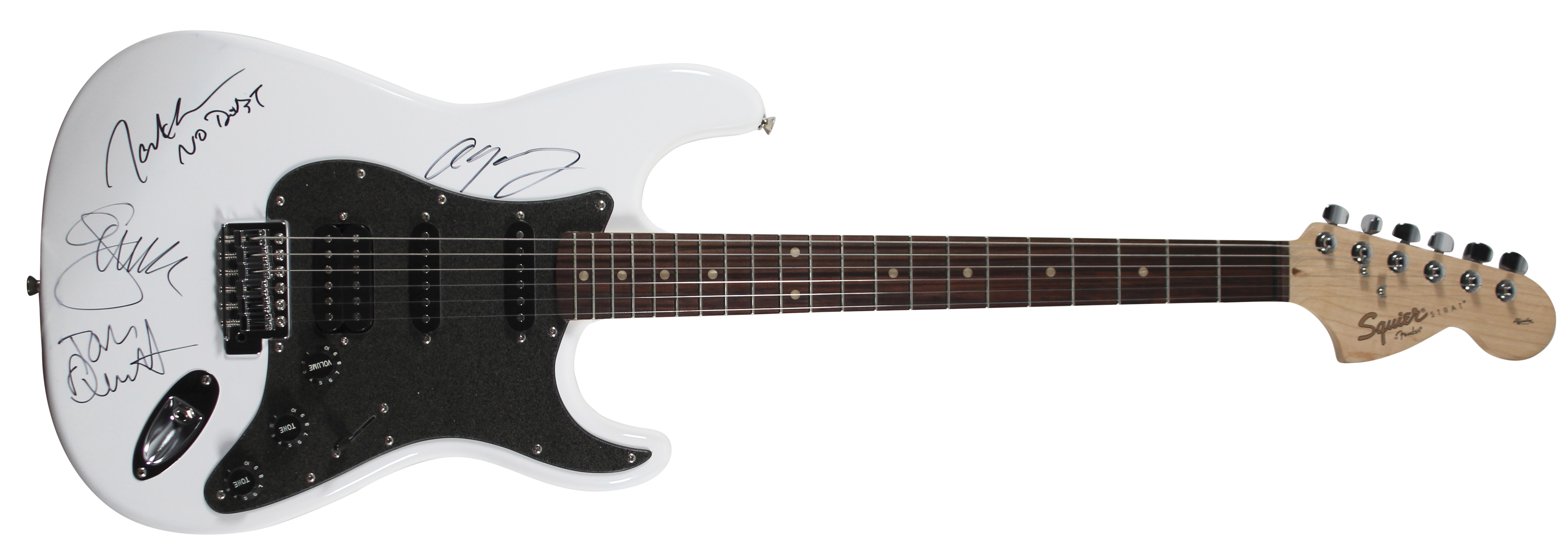 This Autographed White Fender Squier Stratocaster Electric Guitar has been Personally Signed by Gwen Stefani, Tom Dumont, Adrian Young & Tony Kanal of No Doubt. This item is 100% Authentic to include a Certificate of Authenticity (COA) / hologram by JSA. The authenticity can be verified on JSA website.