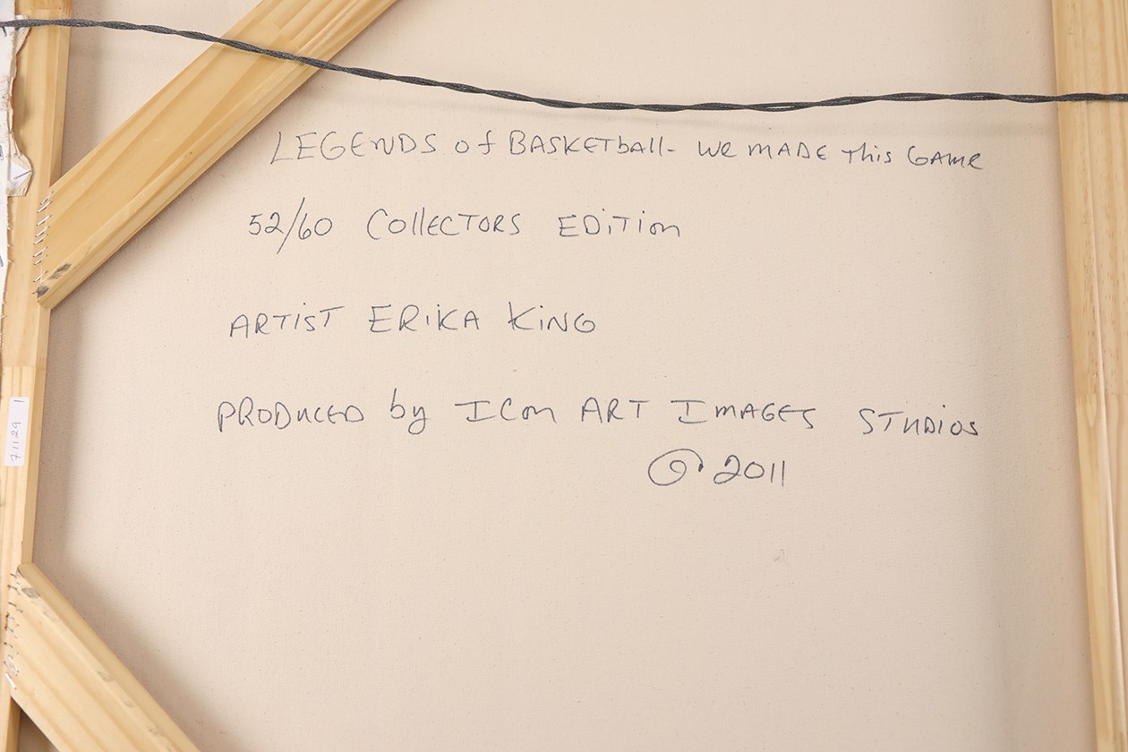This Autographed Artwork Collector's Limited Edition 52/60 NBA Legends Of Basketball "We Made This Game" Lithograph has been Personally Signed by Dolph Shayes, Willis Reed, Chuck Hayes, Nate Thurmond, Bill Bradley, Rick Barry, Hakeem Olajuwon, Magic Johnson, Clyde Drexler, Larry Bird, Michael Jordan, Kevin Garnet, Artis Gilmore, Bob Pettit, Dwight Howard, Kobe Bryant, John Havlicek, John Stockton, George Gervin, Gary Payton, Paul Pierce, Bob McAdoo, David Robinson, Julius Erving, Jason Kidd, Jerry West, Kevin McHale, Dominique Wilkins, Hal Greer, Allen Iverson, Bill Walton, Bob Cousy, LeBron James, Oscar Robinson, Shaquille O'Neal, Bill Russell, Moses Malone, Charles Barkley, Chris Paul, Yao Ming, Connie Hawkins, Steve Nash, Dwyane Wade, Elgin Baylor, Dave Cowens, Walt Frazier, James Worthy, Vince Carter, Adrian Dantley, Bill Sharman, Dennis Rodman, Dirk Nowitzki, Robert Parish, Carmelo Anthony, Deron Williams, Earl Monroe, Lenny Wilkins, David Stern & Erika King (artist). This item is 100% Authentic to include a hologram by Beckett Authentication Services. This item will come with an affixed Beckett Authentication Services (BAS) authentication sticker, which includes a scannable QR code to verify authenticity. Please note that Beckett no longer provides serial-numbered COA cards, and the attached BAS sticker will serve as the complete authentication for this item. The authenticity can be verified on Beckett Authentication Services website. This item has been professionally stretched, mounted & framed to overall dimensions of approximately 48 x 68 inches. This large canvas has over fifty NBA greats, players who redefined and reinvented the game of basketball over the past five decades. This visually impactful piece features the original abstract paint background by artist Erika King upon which color action shots of 60 of the greatest NBA players have mounted, each signed by the appropriate player along with David Stern & the artist Erika King.