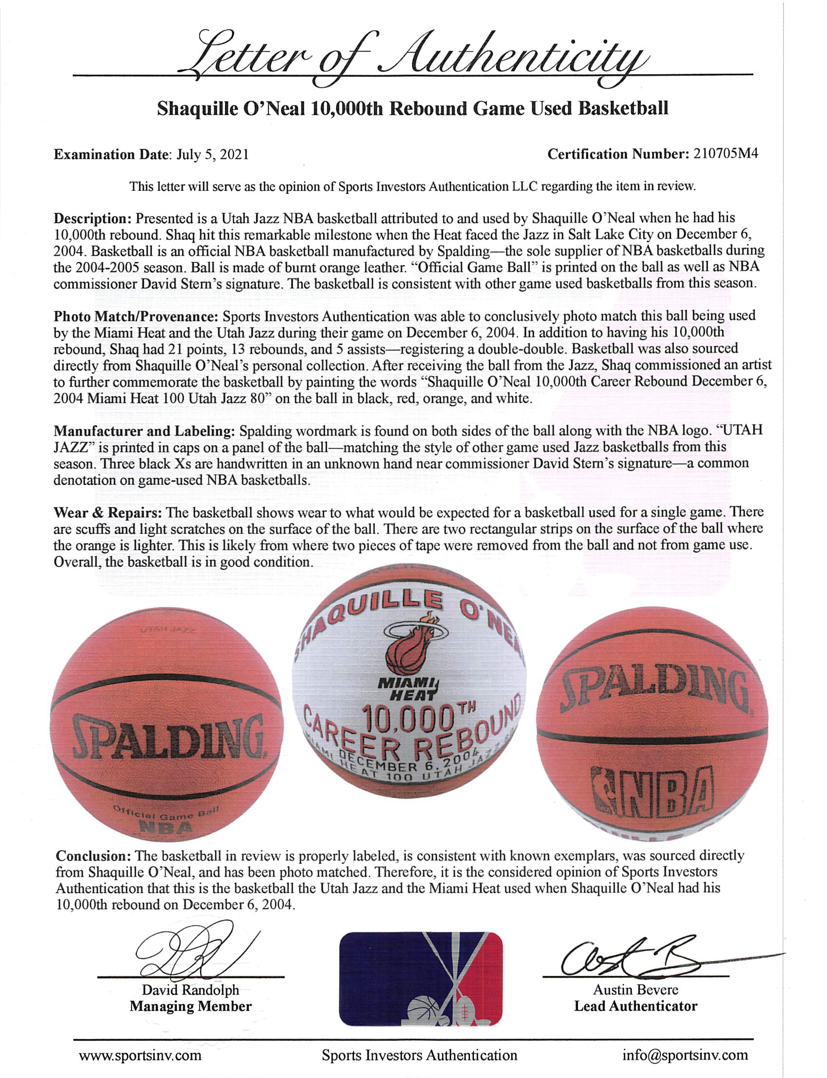 This is a photo matched Game Used December 6, 2004, Spalding Official NBA Game Ball. This ball was used in the game Shaq recorded his 10,000th career rebound versus the Utah Jazz. After being gifted the ball from the Utah Jazz, Shaq commissioned an artist to paint the ball to commemorate the achievement. This ball originates from Shaquille’s personal collection and comes with a signed letter of provenance from Shaquille along with a Photo Matched Letter of Authenticity from Sports Investors Authentication. The ball is not autographed.