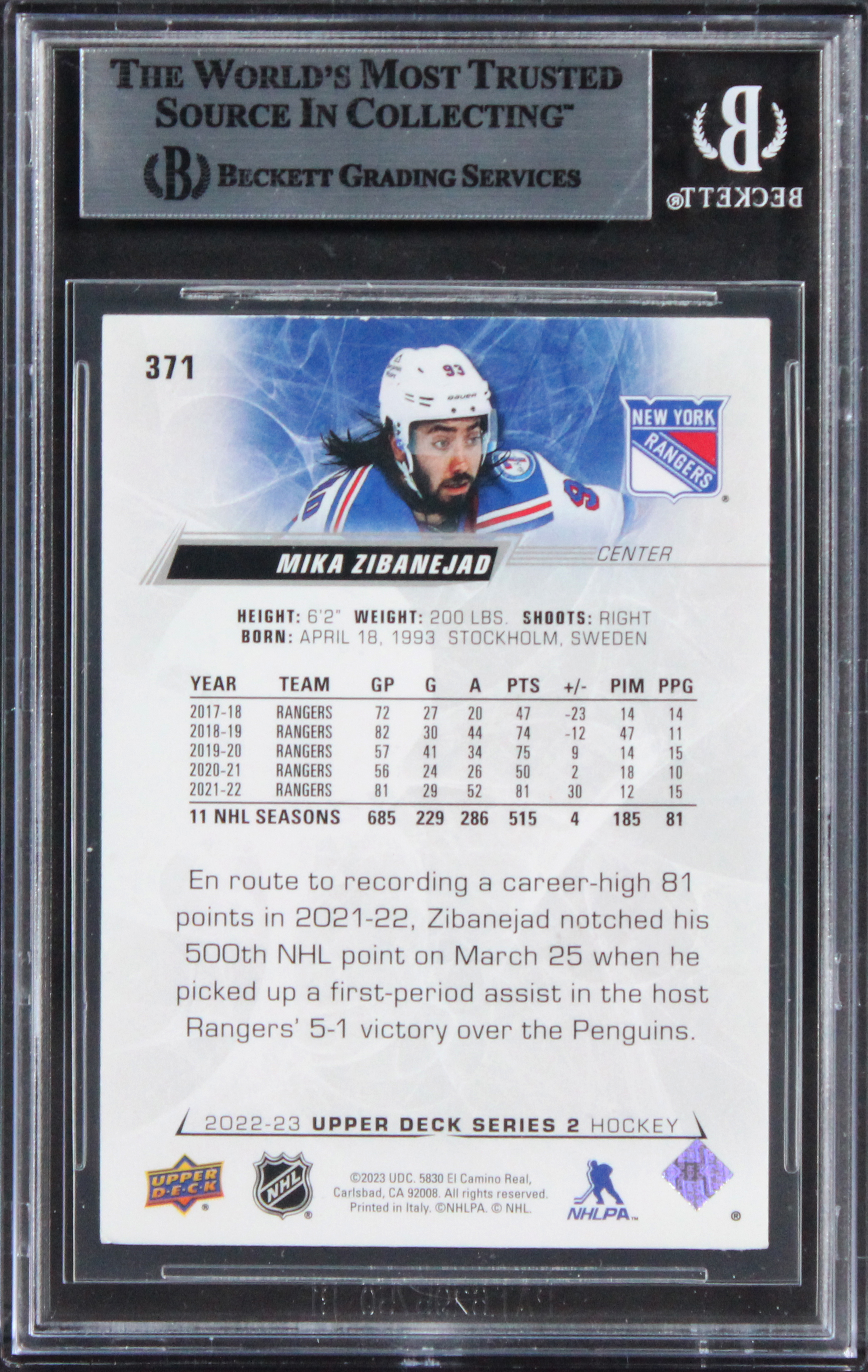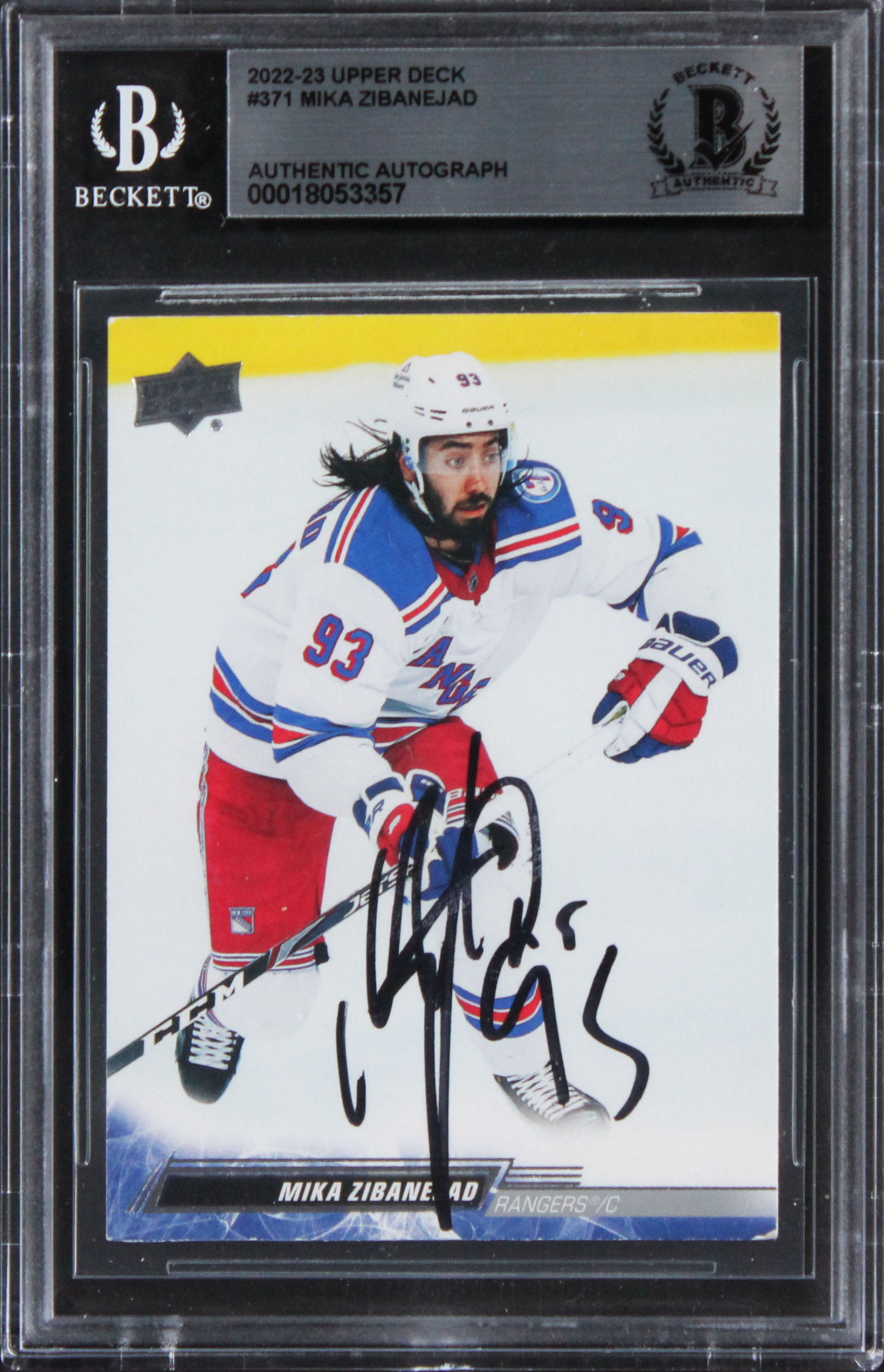 This Autographed 2022 Upper Deck #371 Card has been Personally Signed by Mika Zibanejad of the New York Rangers. This item is 100% Authentic, it comes slabbed and authenticated by Beckett Authentication Services. The authenticity can be verified on Beckett Authentication Services website.