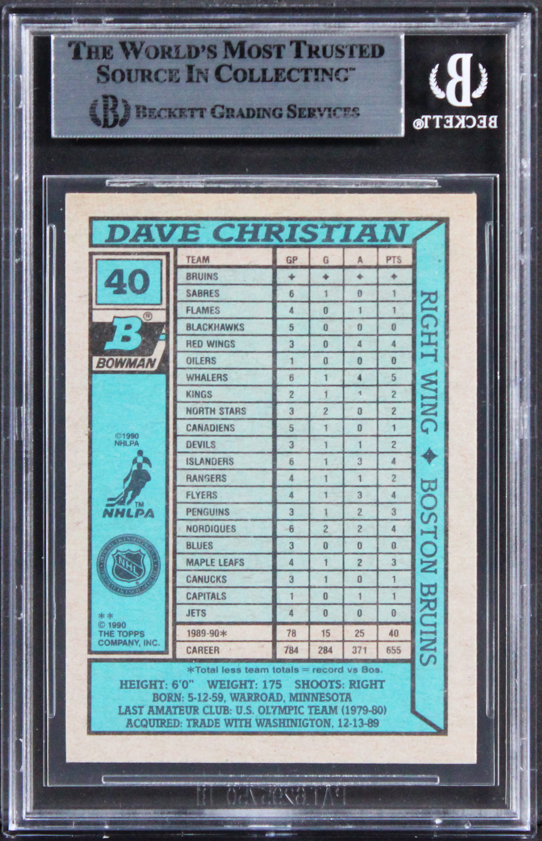 This Autographed 1990 Bowman #40 Card has been Personally Signed by Dave Christian of the Boston Bruins. This item is 100% Authentic, it comes slabbed and authenticated by Beckett Authentication Services. The authenticity can be verified on Beckett Authentication Services website.