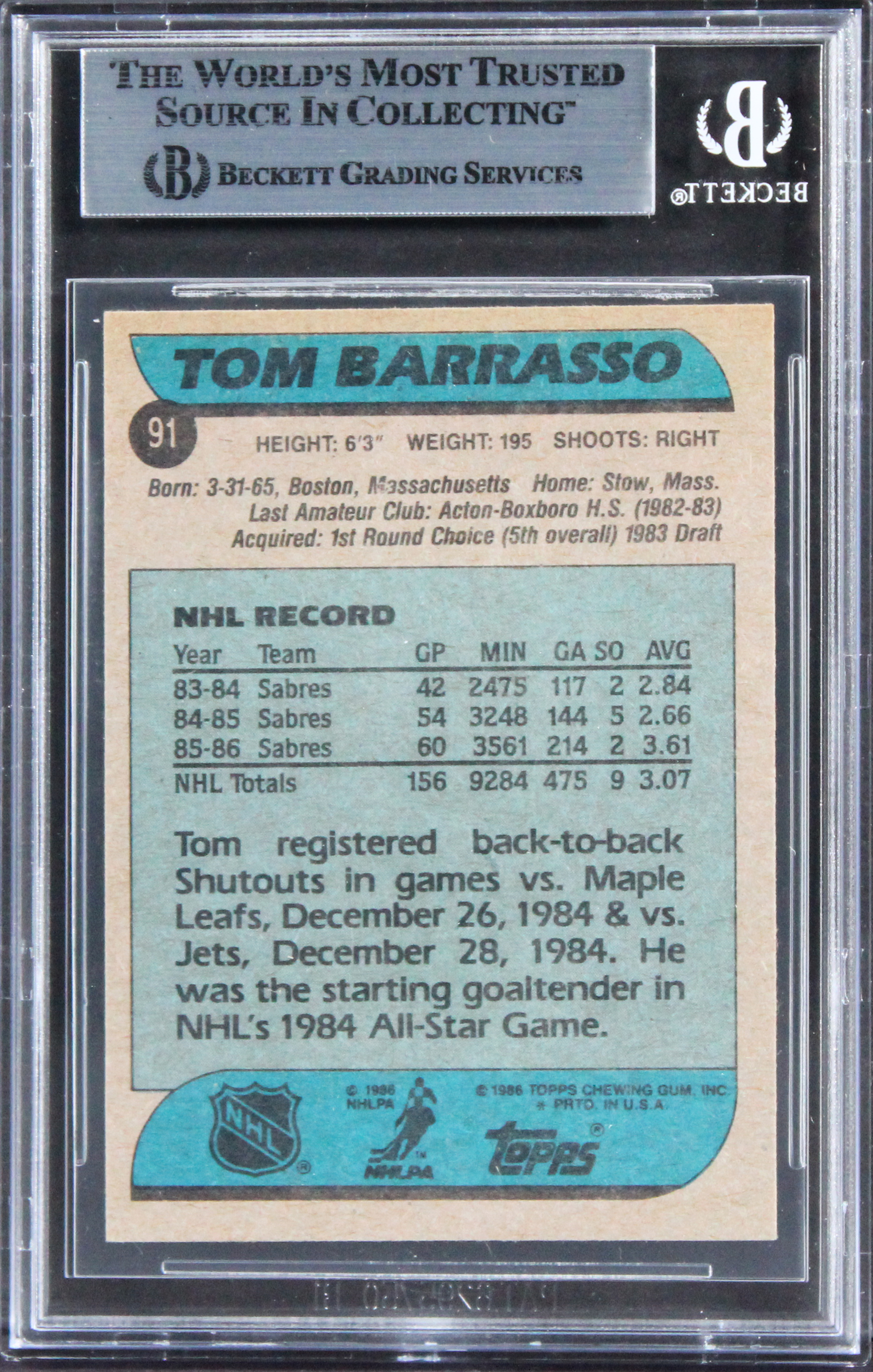 This Autographed 1986 Topps #91 Card has been Personally Signed by Tom Barrasso of the Buffalo Sabres. This item is 100% Authentic, it comes slabbed and authenticated by Beckett Authentication Services. The authenticity can be verified on Beckett Authentication Services website.